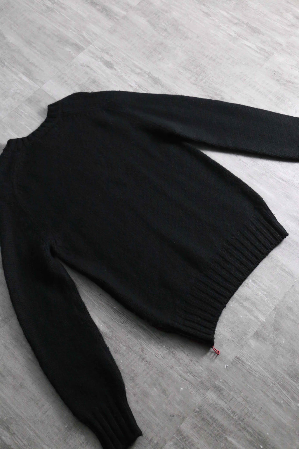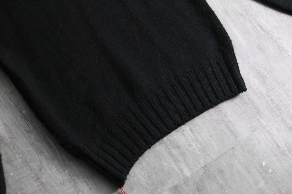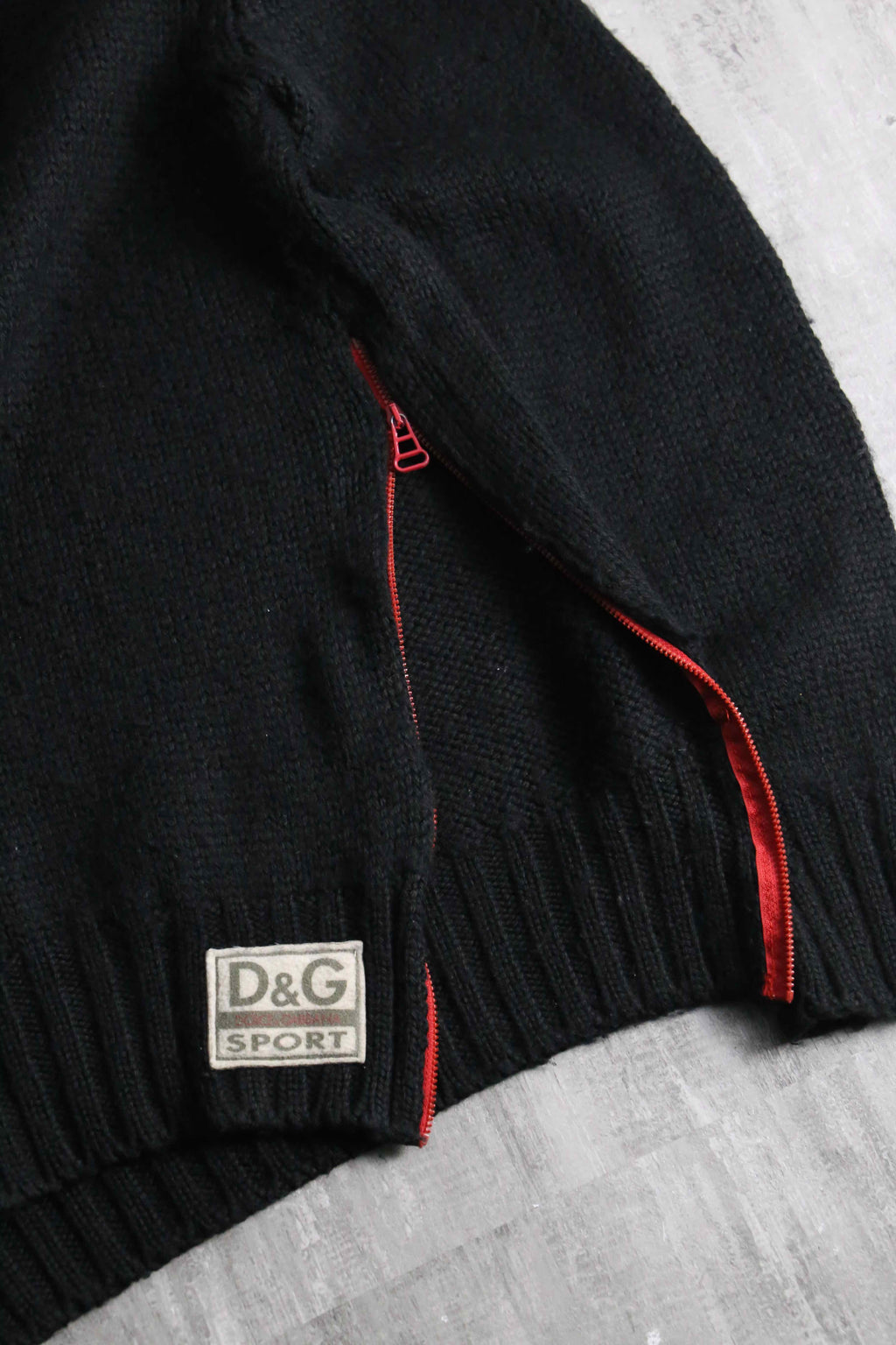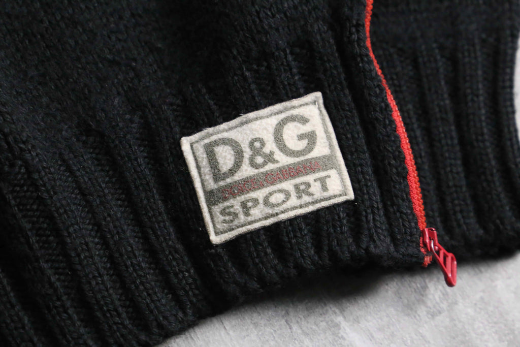 ウールとアクリルを主体としたタフさと保温性を兼ね備えたミドルゲージのボディが特徴で、ブランドを象徴する鮮やかな赤のネックタグや、サイドに大胆に配されたデザイン性と機能性を両立する赤いコントラストジップ、そして裾のパッチロゴなど、当時のドルガバらしいラグジュアリー×スポーツの美学が凝縮された、モード感の漂う1着。