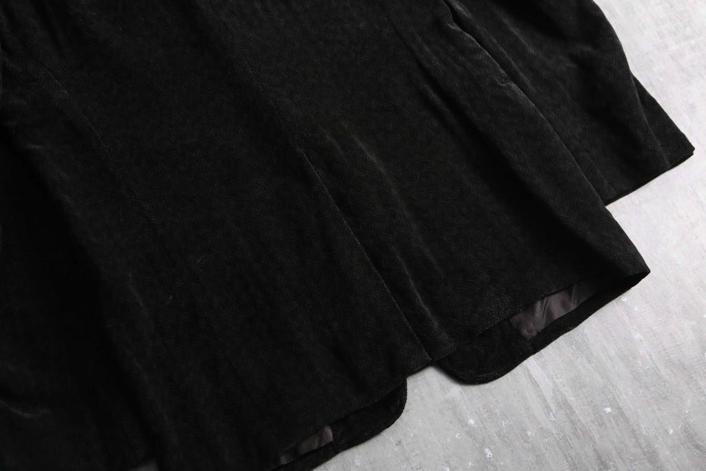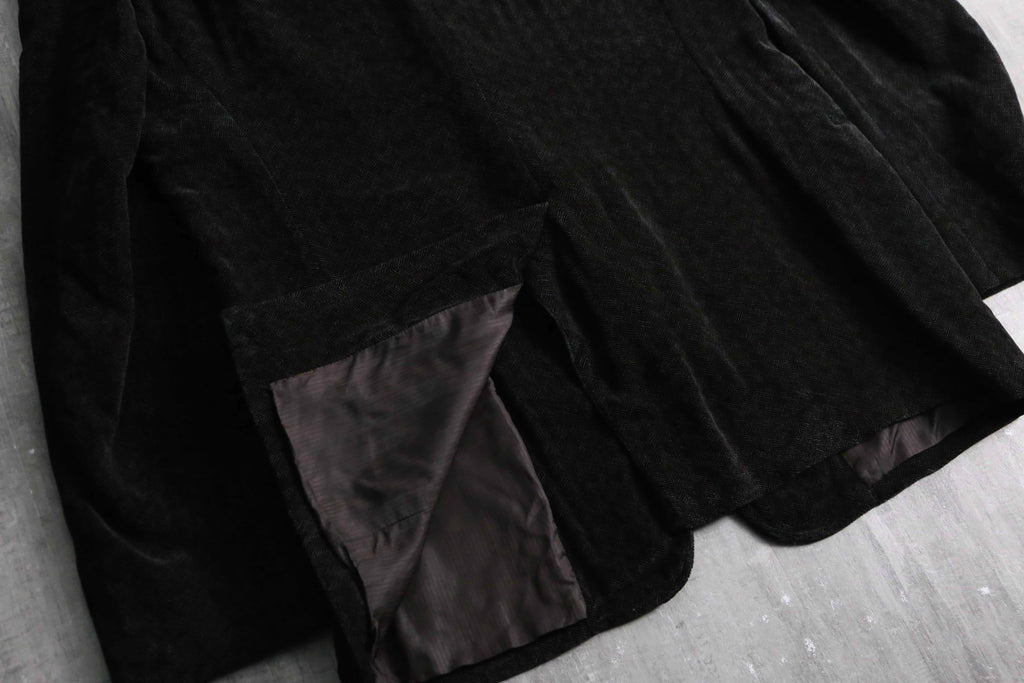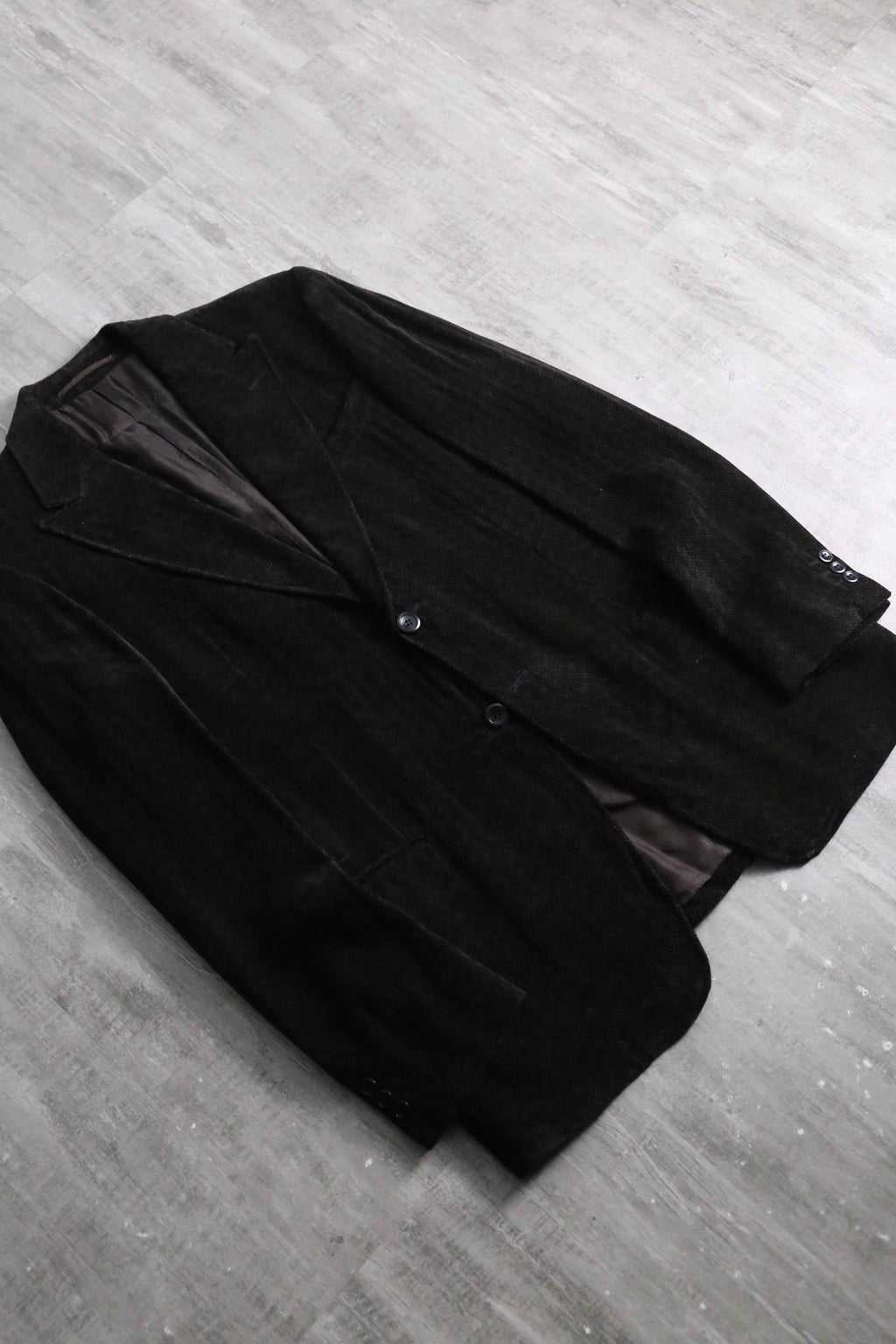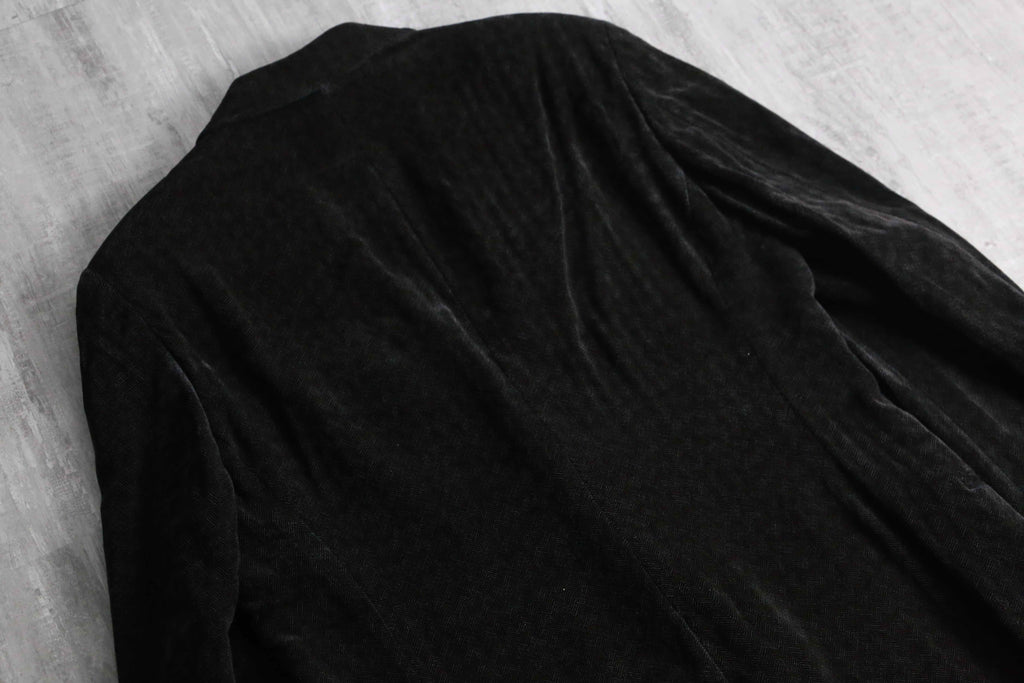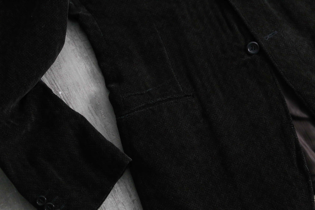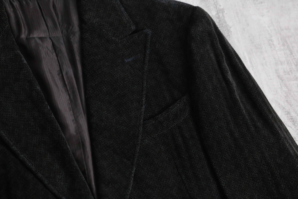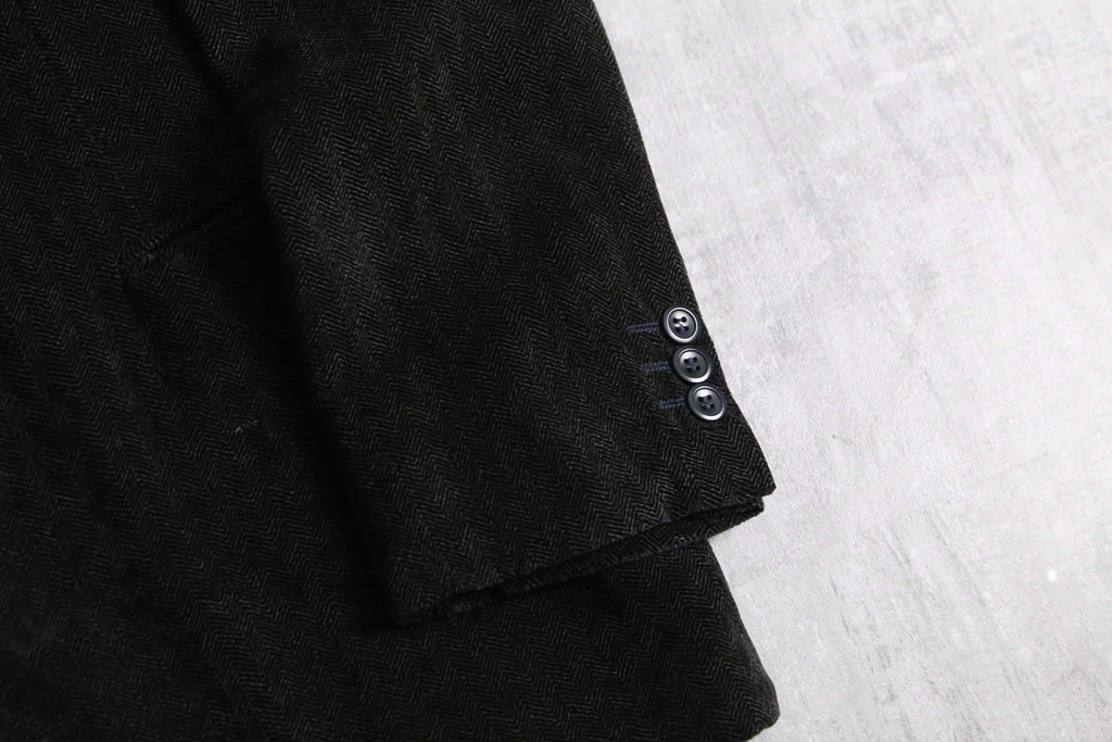 レーヨン96%にシルク4%をブレンドした特殊な二者混ファブリックは、ソフトなテクスチャの中にもシルク特有の奥ゆかしい光沢を放ち、そこに緻密なヘリンボーン織りが加わることでクラシックとモードが高次元で融合しています。2釦シングル、袖開き見せ、センターベント仕様という一切の無駄を削ぎ落とした美学が宿る至高のテーラード。