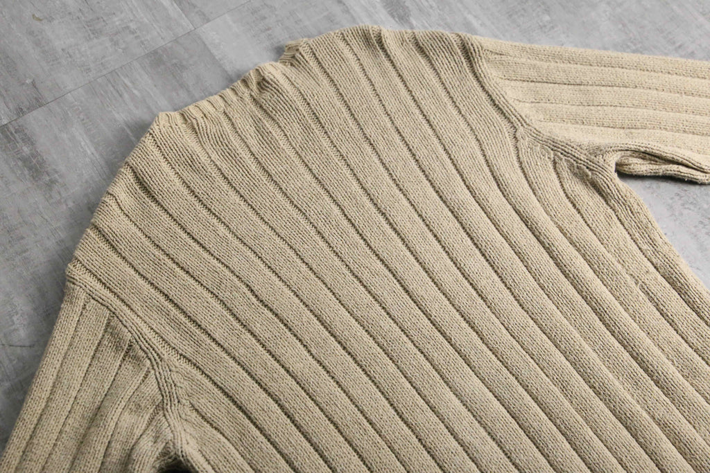 2000年代らしいゆったりとしたリラックスシルエットと、肌馴染みの良い絶妙なトーンのベージュカラー。リネンニットのような柔らかさと素朴でいながらもデイリーユースに富んだシンプルな逸品。サイズ表記はLと程よくゆとりを持って着られる大人リラックススタイルにも向いたおすすめニットです。