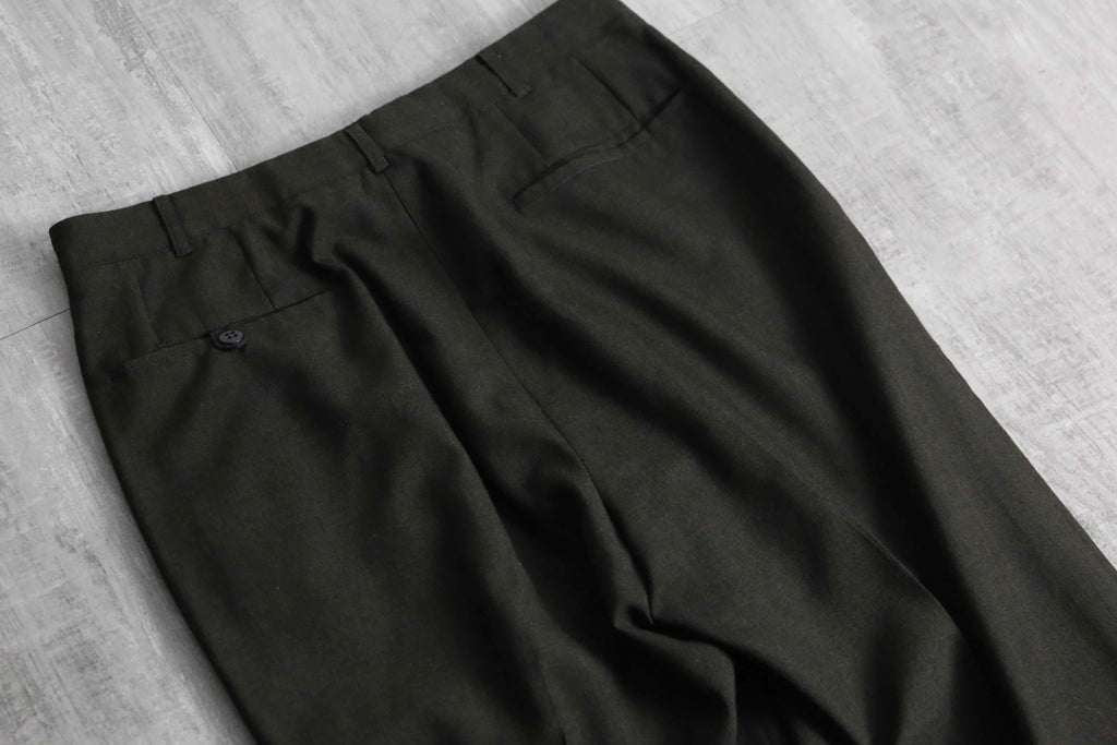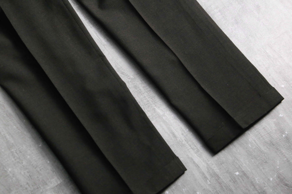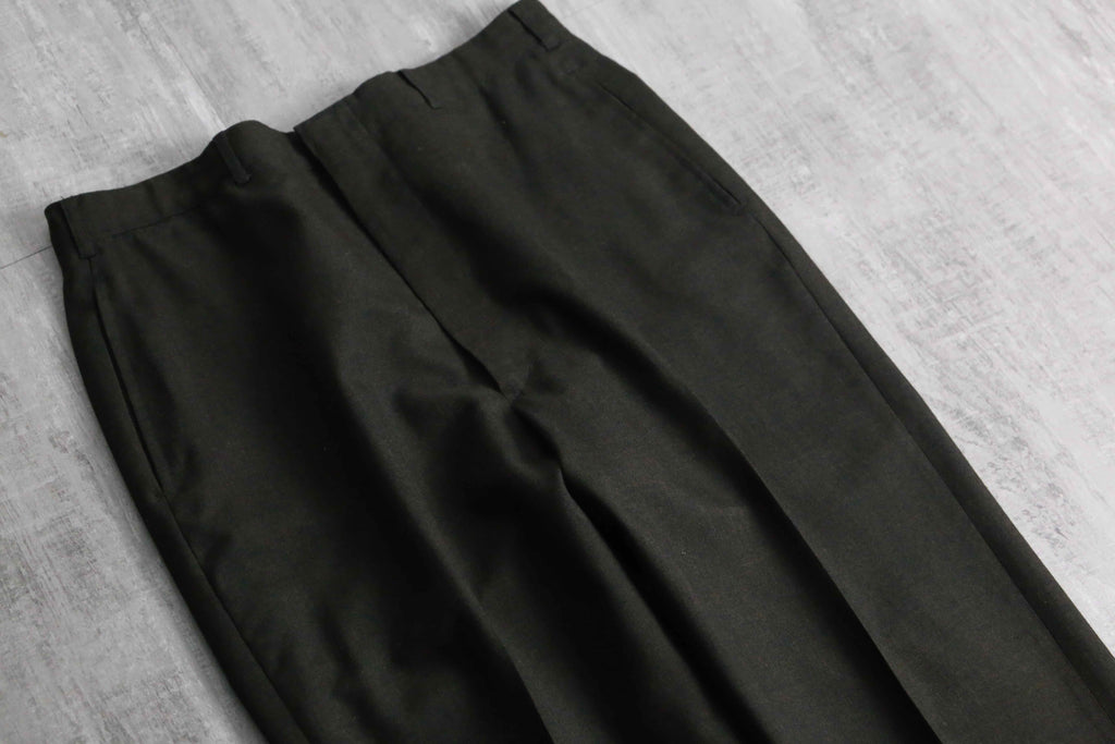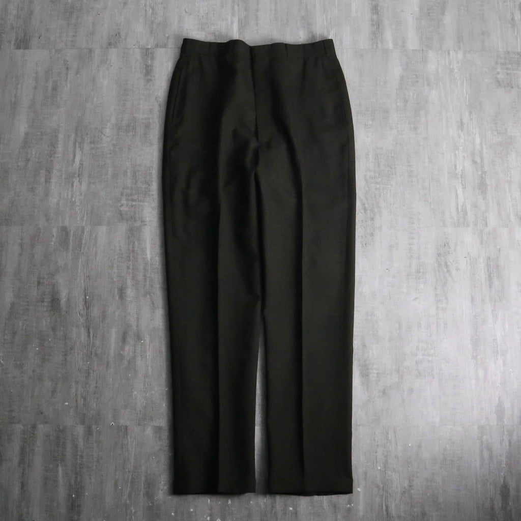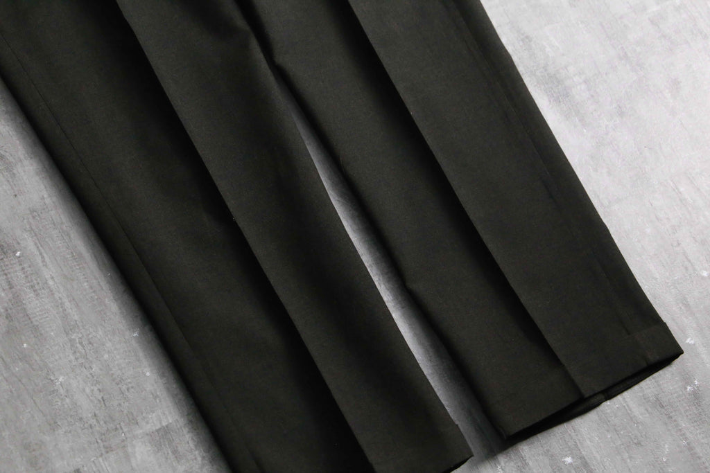 ノータックのドレッシーな美しいシルエット。ヴィンテージらしい股上の深さから、やや細身なシルエットながらもゆったりと履いていただけます。当時らしいがっしりとしたウールを採用していますが、光に当てると若干透けるほどの密度で織られており、存外通年で着用していただけます。ダークブラウンのお色味や綺麗に付けられたセンタークリースも非常に良く、デイリーで使えるヴィンテージスラックスかと思います。