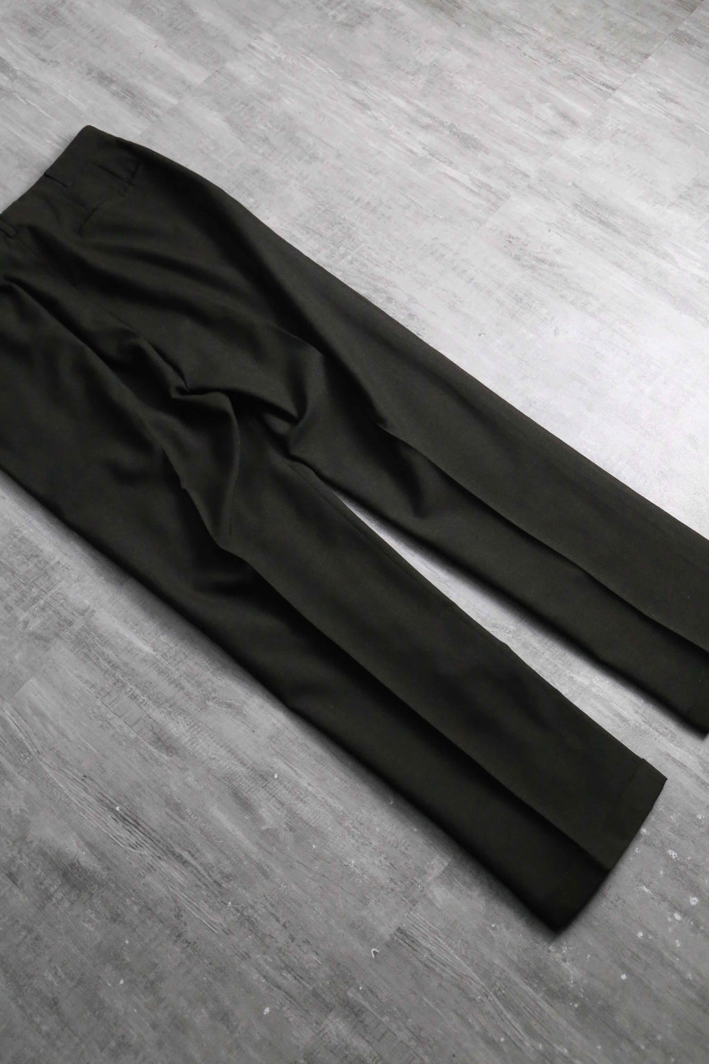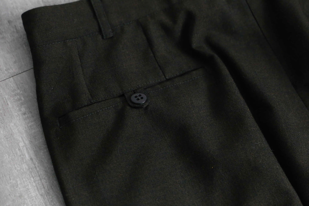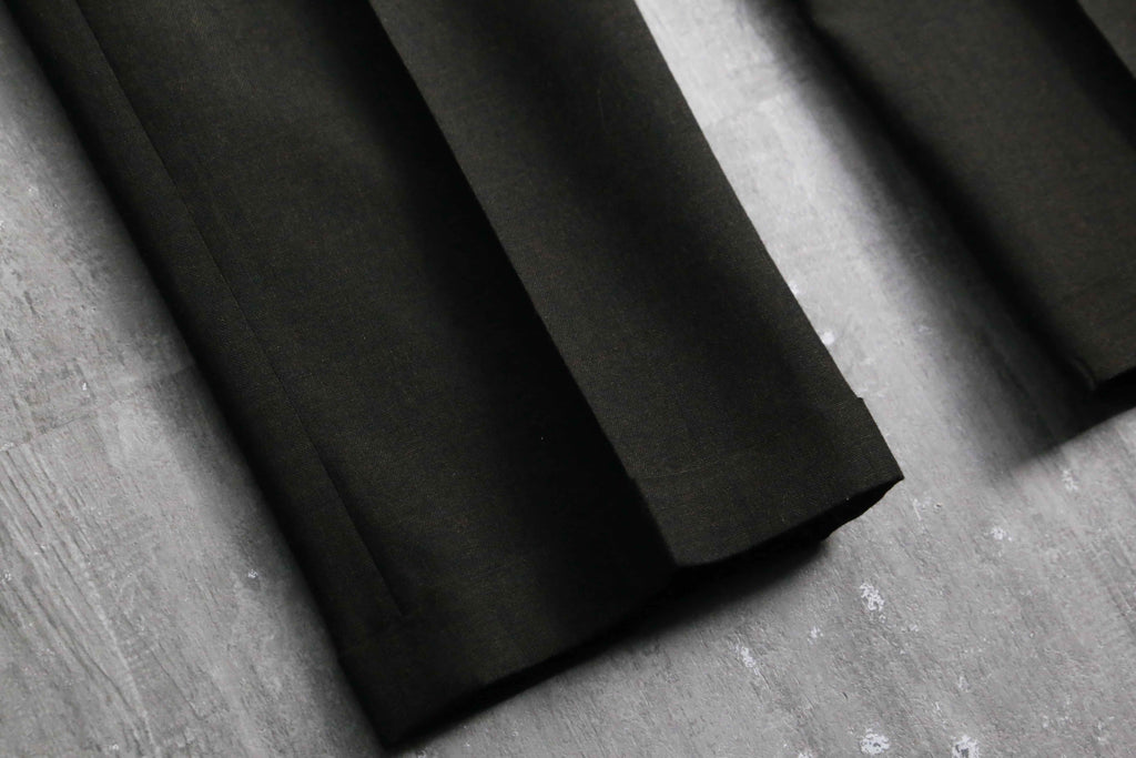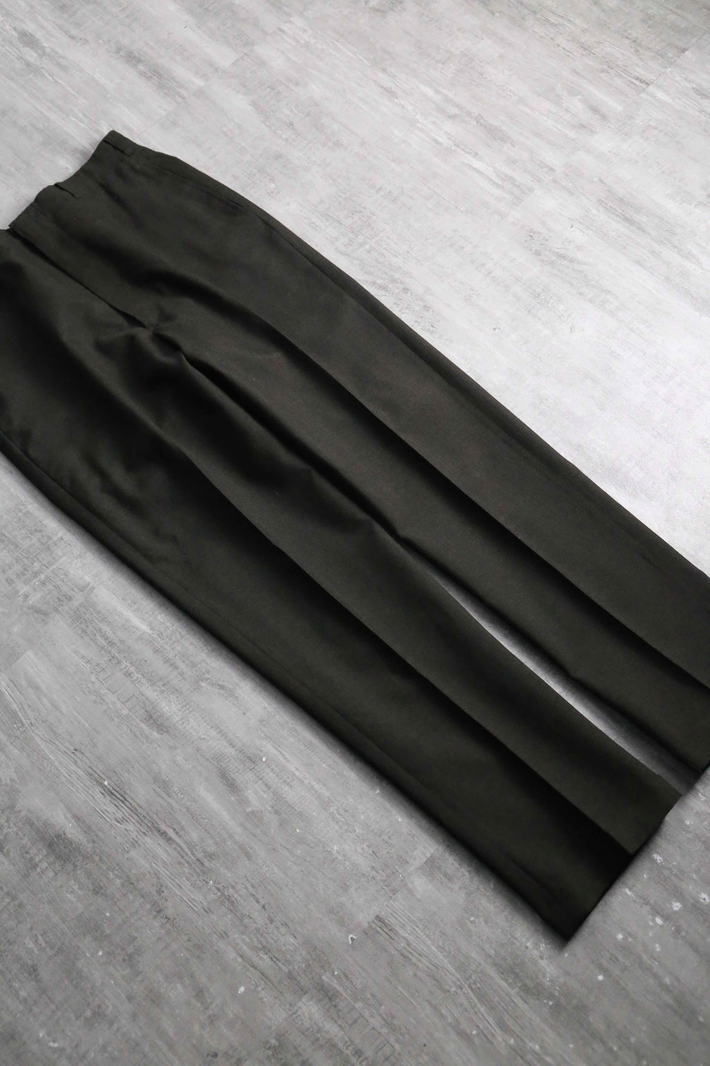 ノータックのドレッシーな美しいシルエット。ヴィンテージらしい股上の深さから、やや細身なシルエットながらもゆったりと履いていただけます。当時らしいがっしりとしたウールを採用していますが、光に当てると若干透けるほどの密度で織られており、存外通年で着用していただけます。ダークブラウンのお色味や綺麗に付けられたセンタークリースも非常に良く、デイリーで使えるヴィンテージスラックスかと思います。