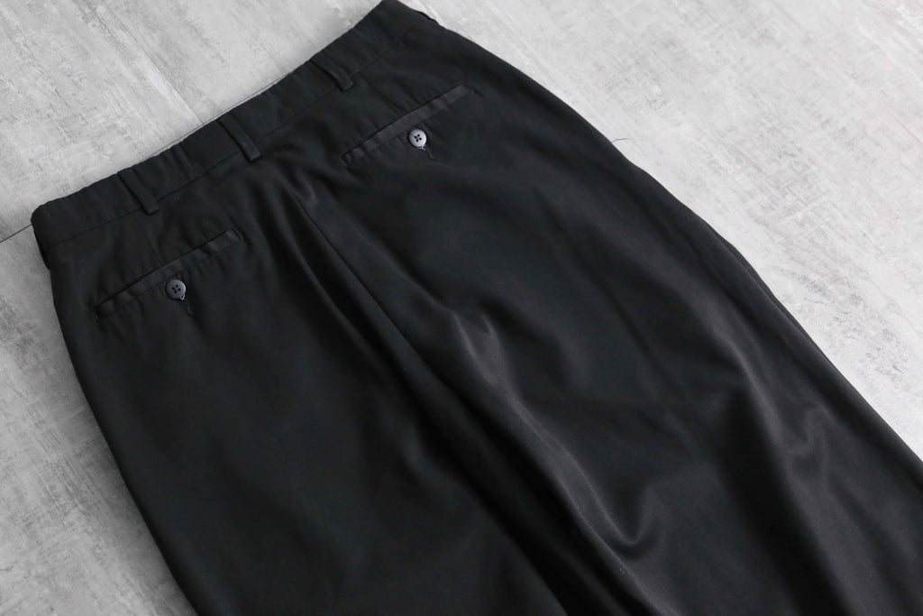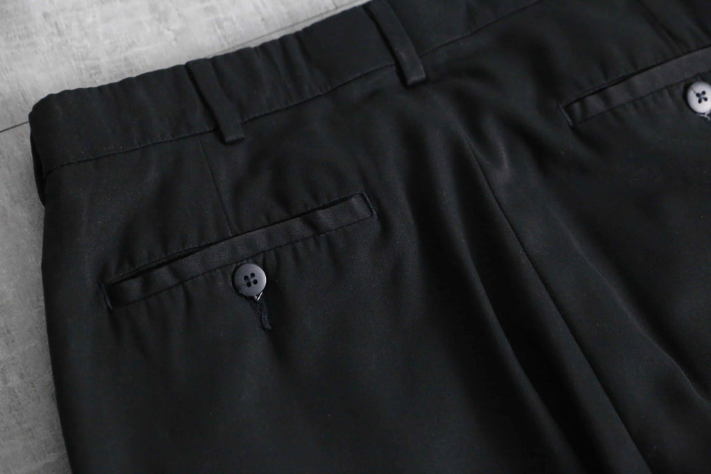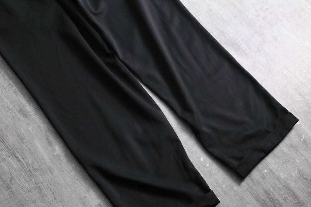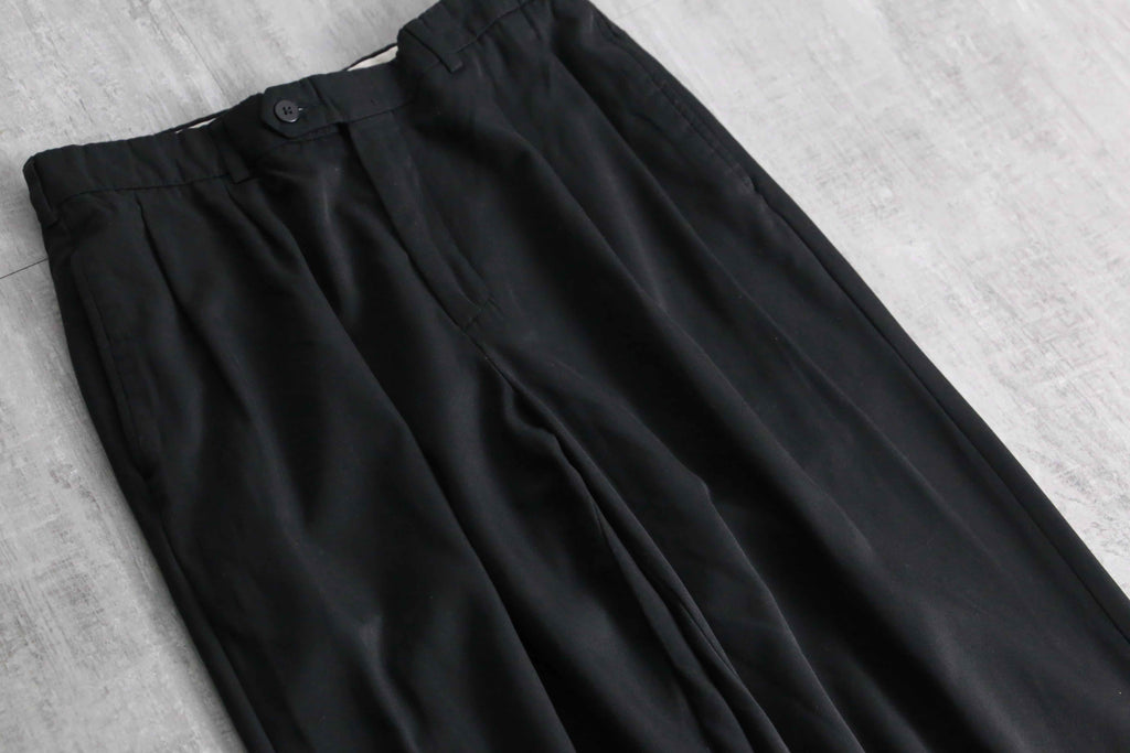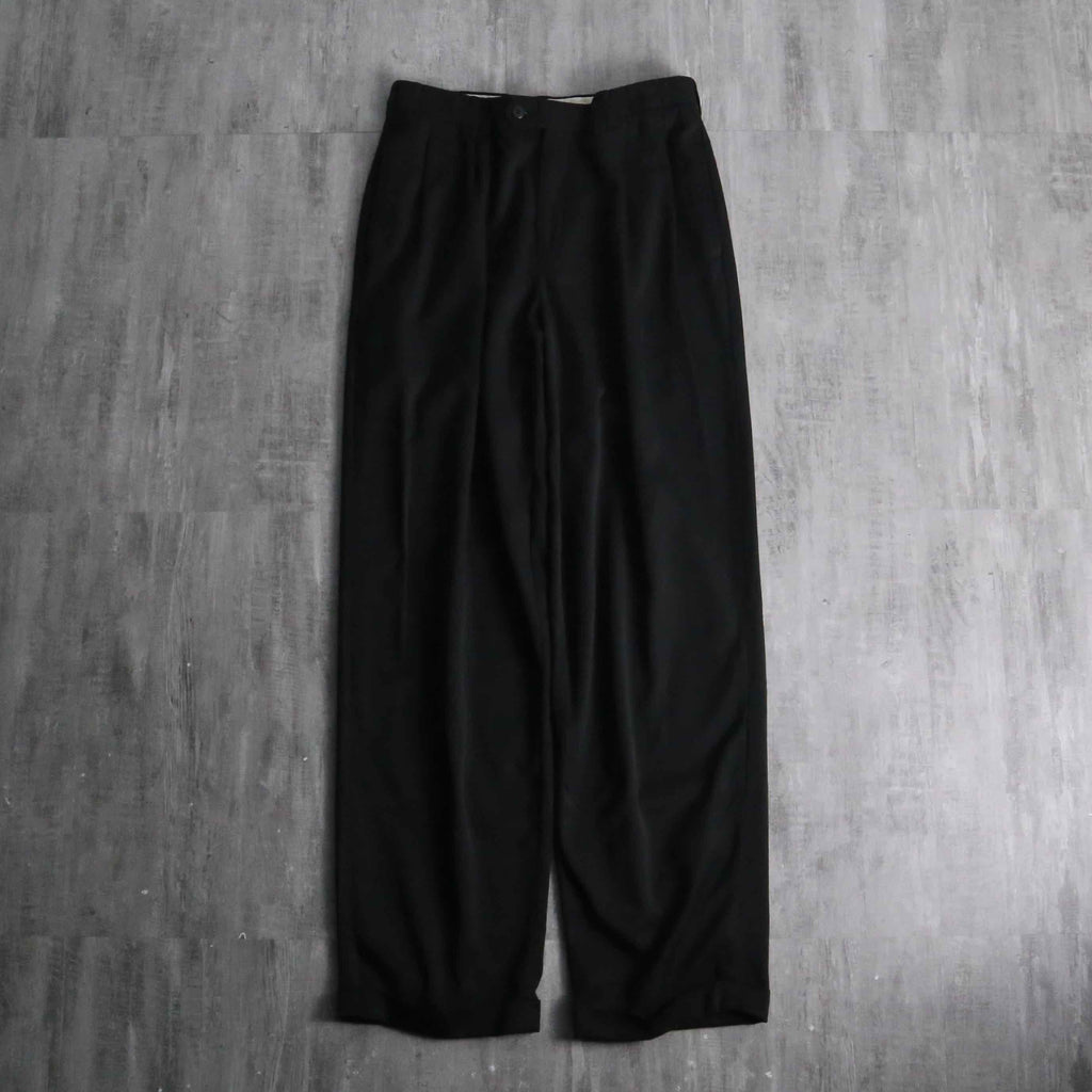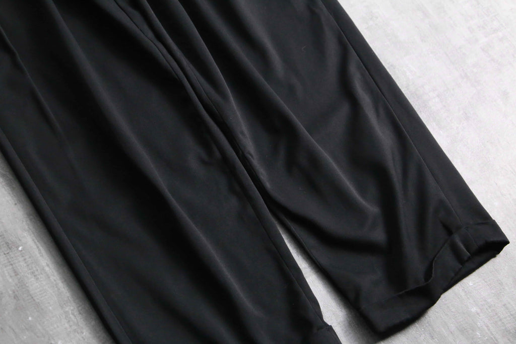 年代を象徴するマイクロデニールポリエステルを100%使用しており、シルクのように滑らかな肌触りと、歩くたびに揺れる美しいドレープ感が最大の特徴。フロントの深めなツータックが腰回りにボリュームを持たせ、裾のダブル仕上げへと繋がる重厚なワイドシルエットを構築しています。太め黒スラックス需要を満たしてくれる圧倒的汎用性を誇る1本です。