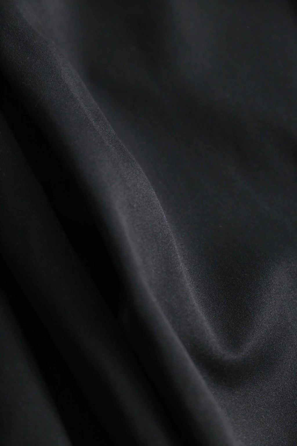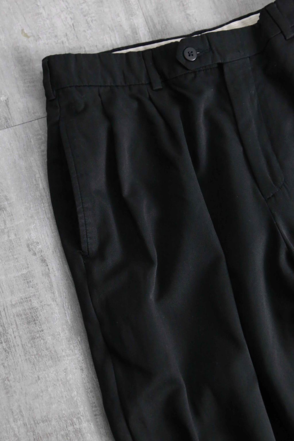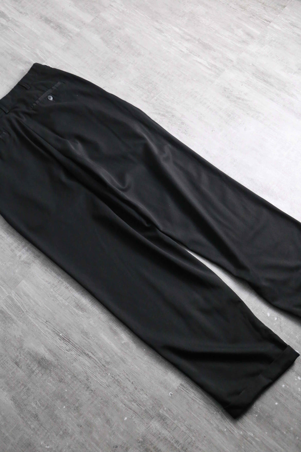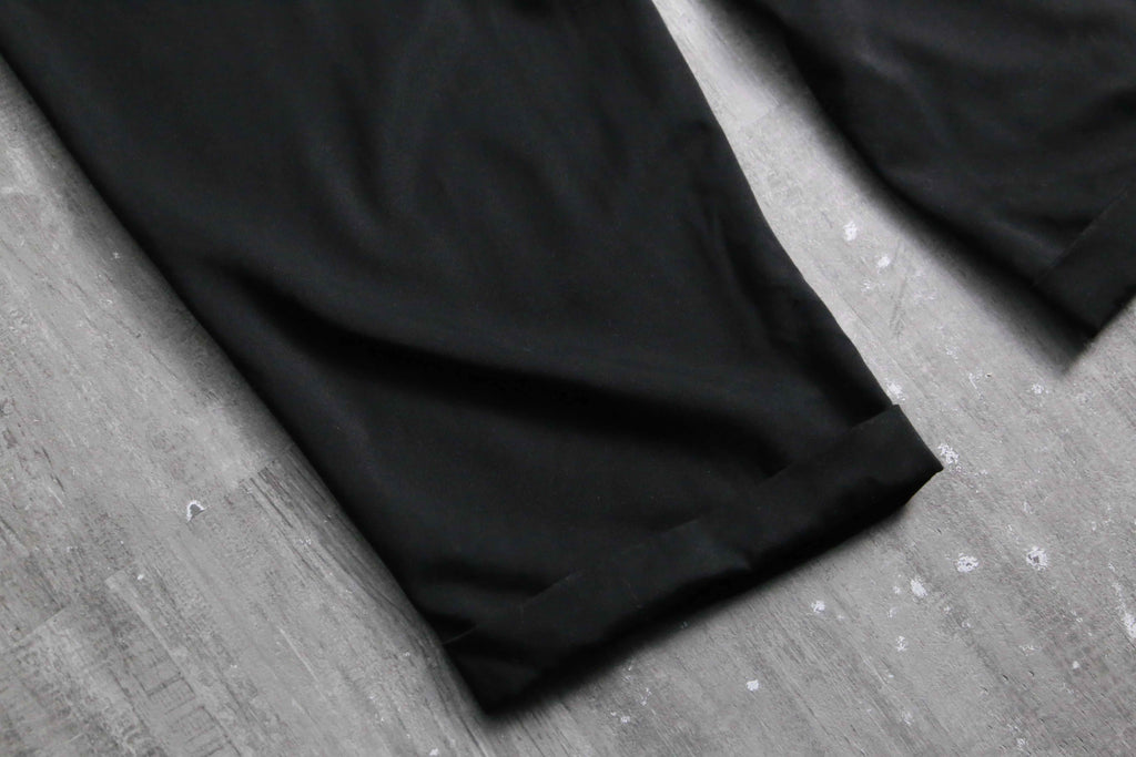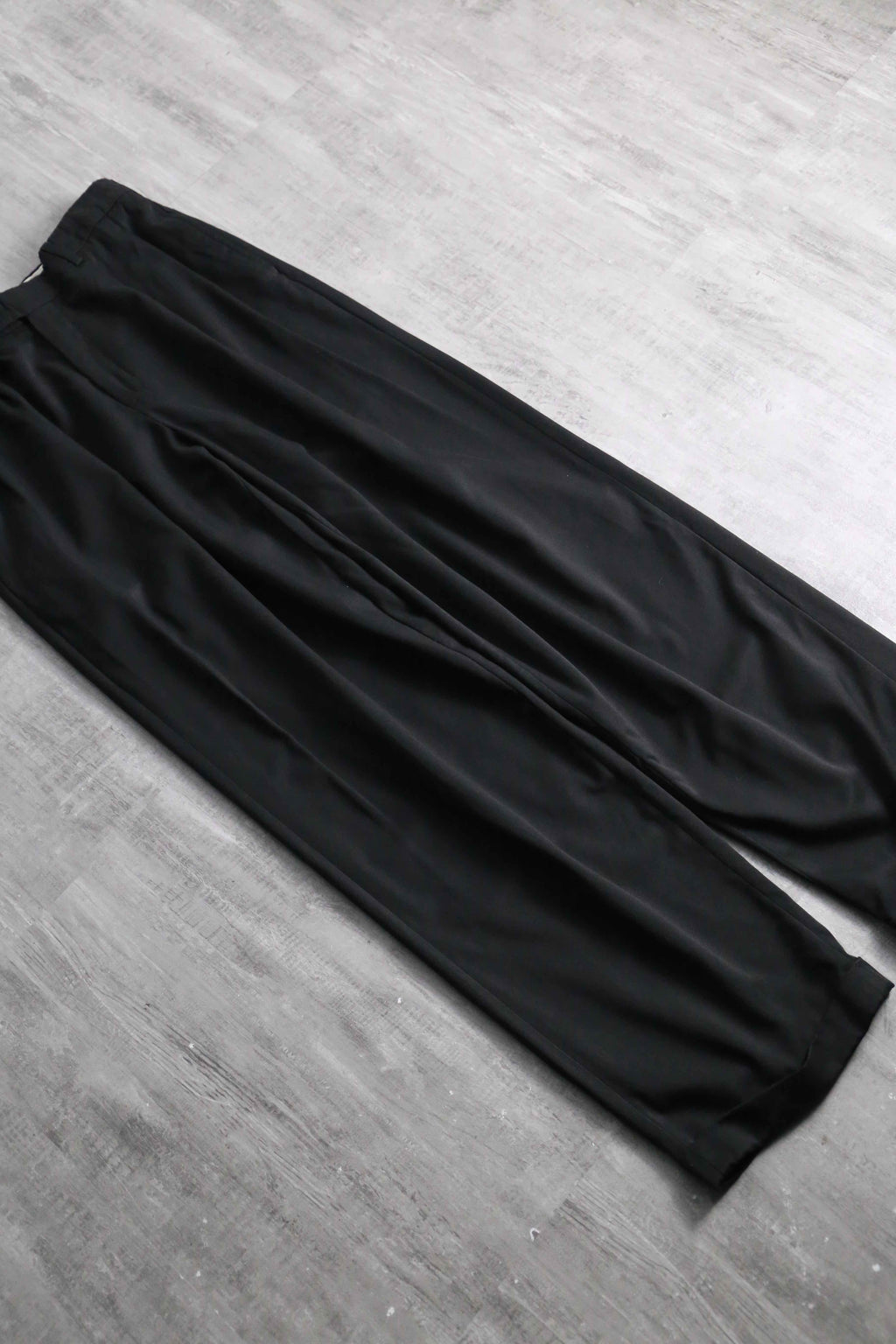 年代を象徴するマイクロデニールポリエステルを100%使用しており、シルクのように滑らかな肌触りと、歩くたびに揺れる美しいドレープ感が最大の特徴。フロントの深めなツータックが腰回りにボリュームを持たせ、裾のダブル仕上げへと繋がる重厚なワイドシルエットを構築しています。太め黒スラックス需要を満たしてくれる圧倒的汎用性を誇る1本です。