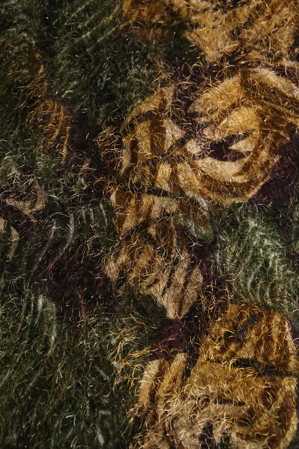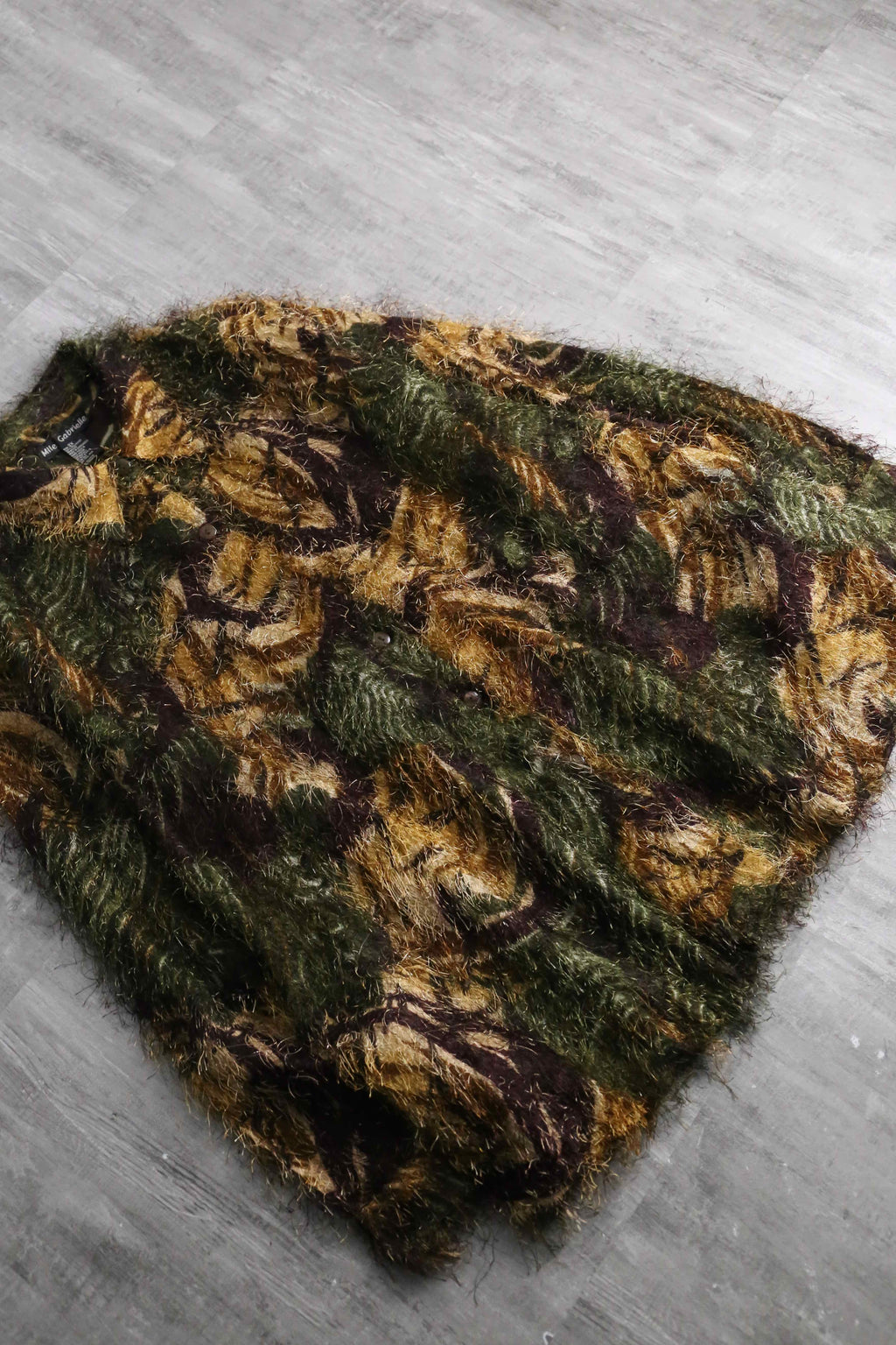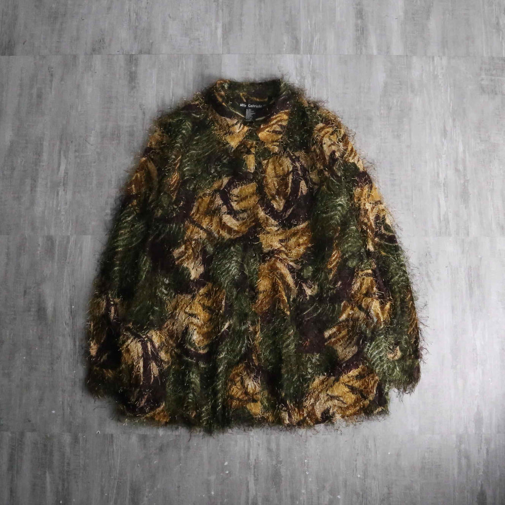 エキセントリックな雰囲気を纏ったシャギーシャツ。毛足の長いアイラッシュヤーンのような独創的なテクスチャーに、オリーブ、ブラウン、ブラックが複雑に混ざり合う抽象的な総柄が奥行きを感じさせる1着。