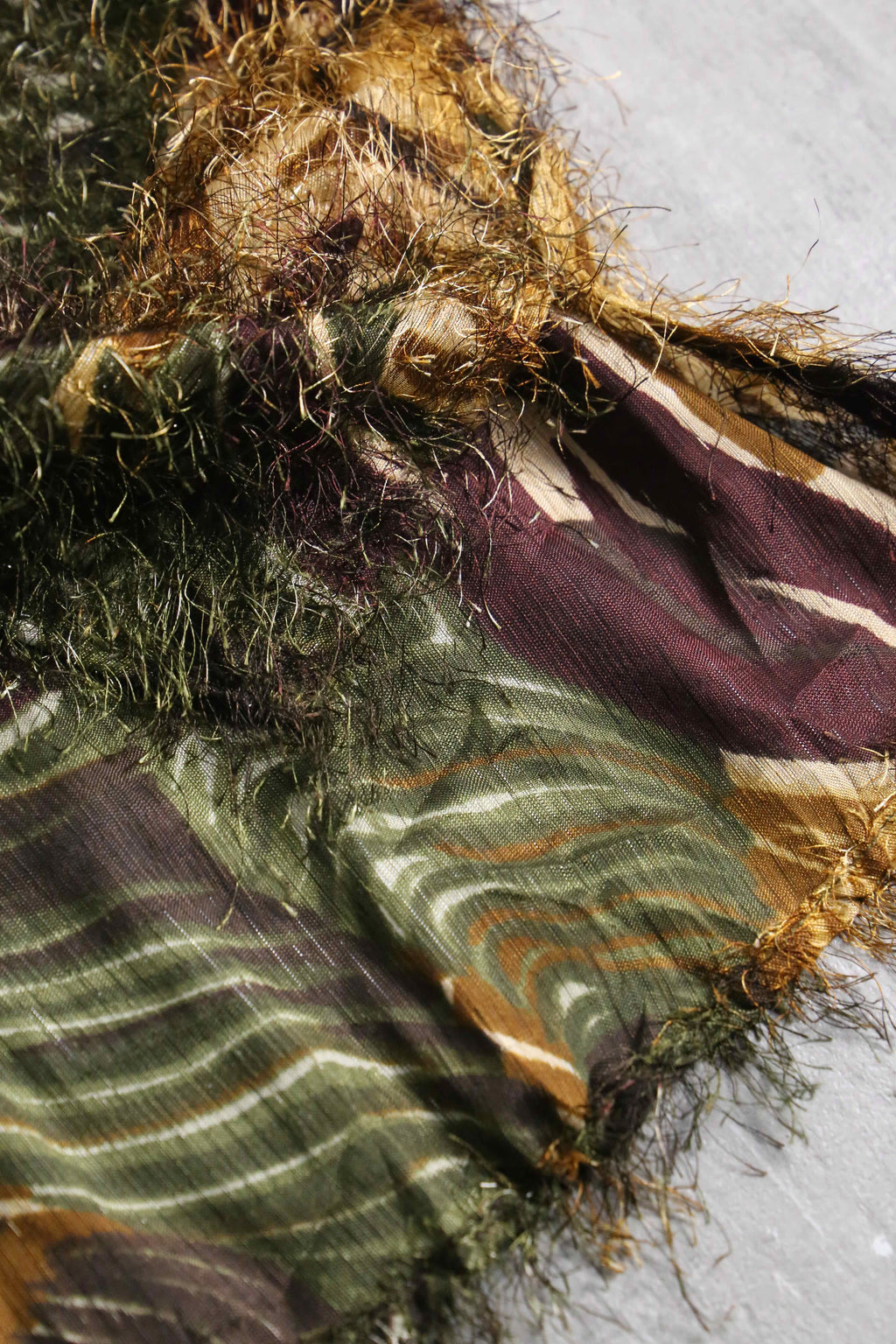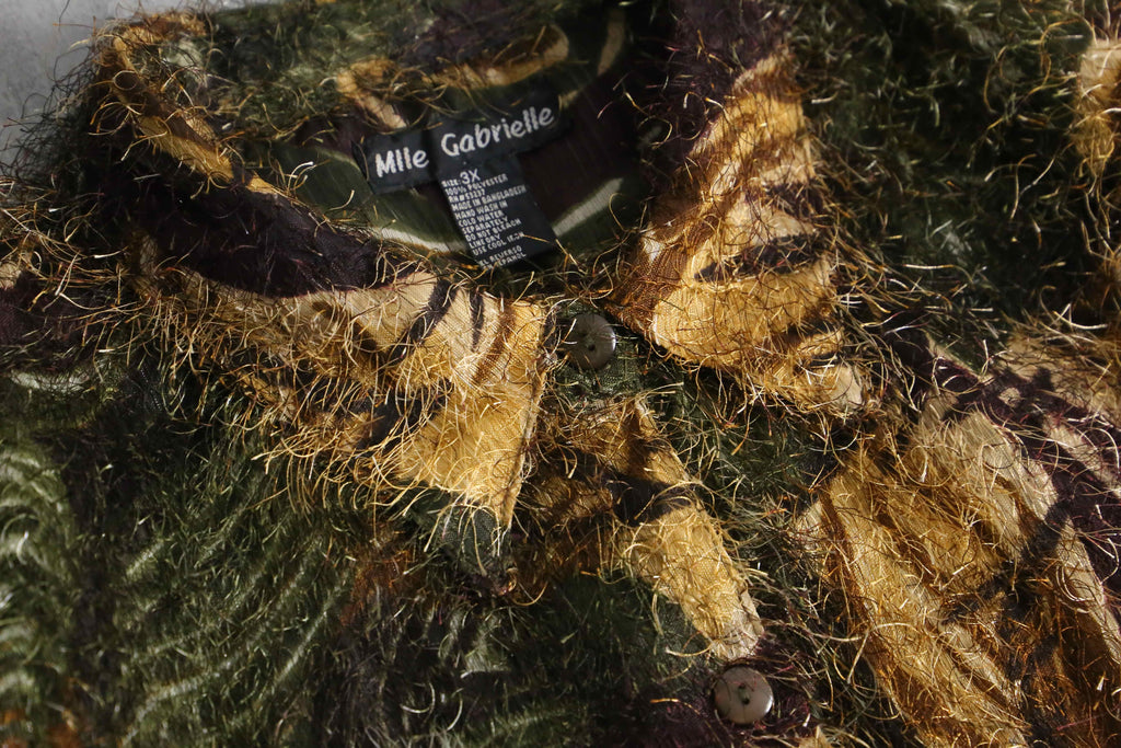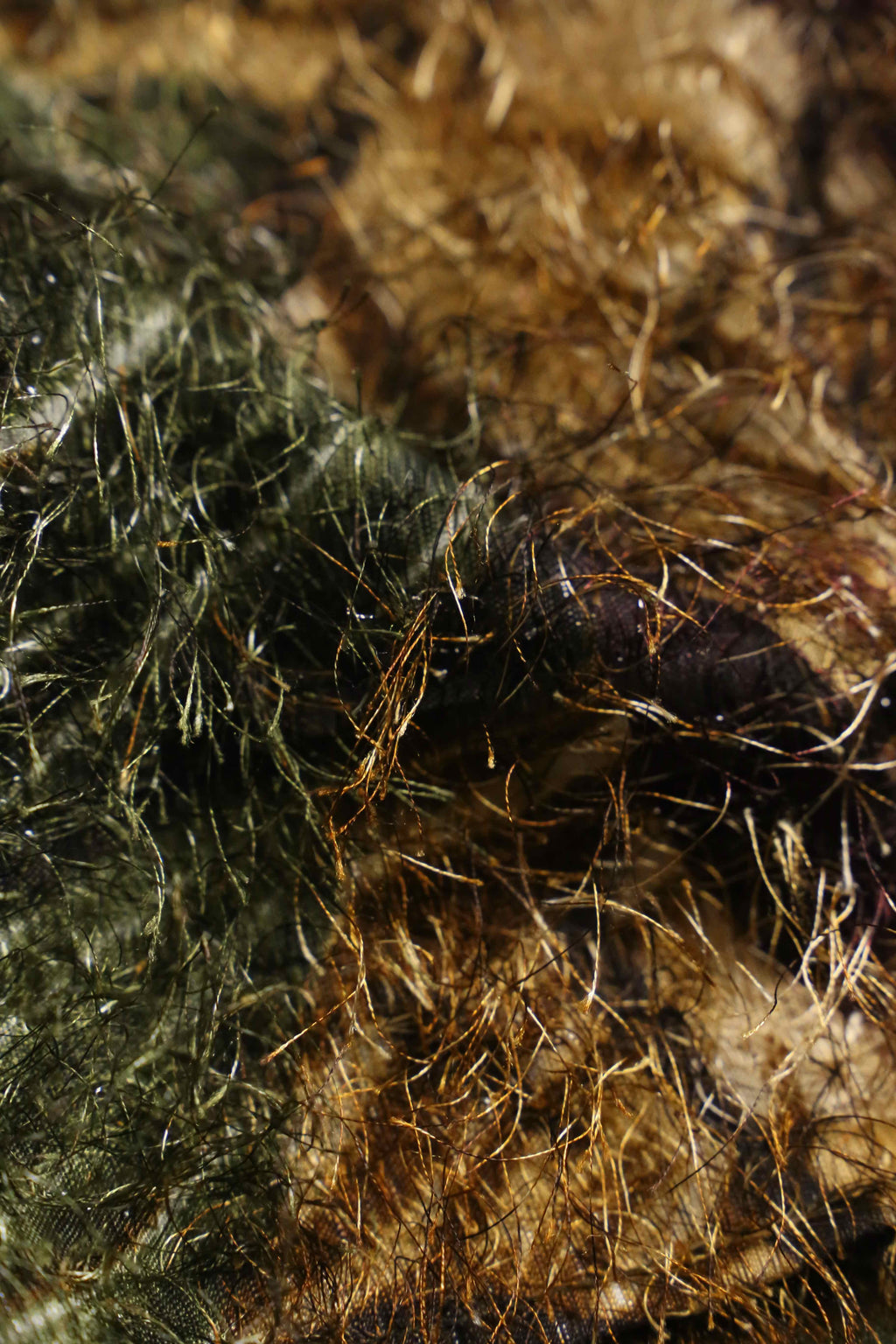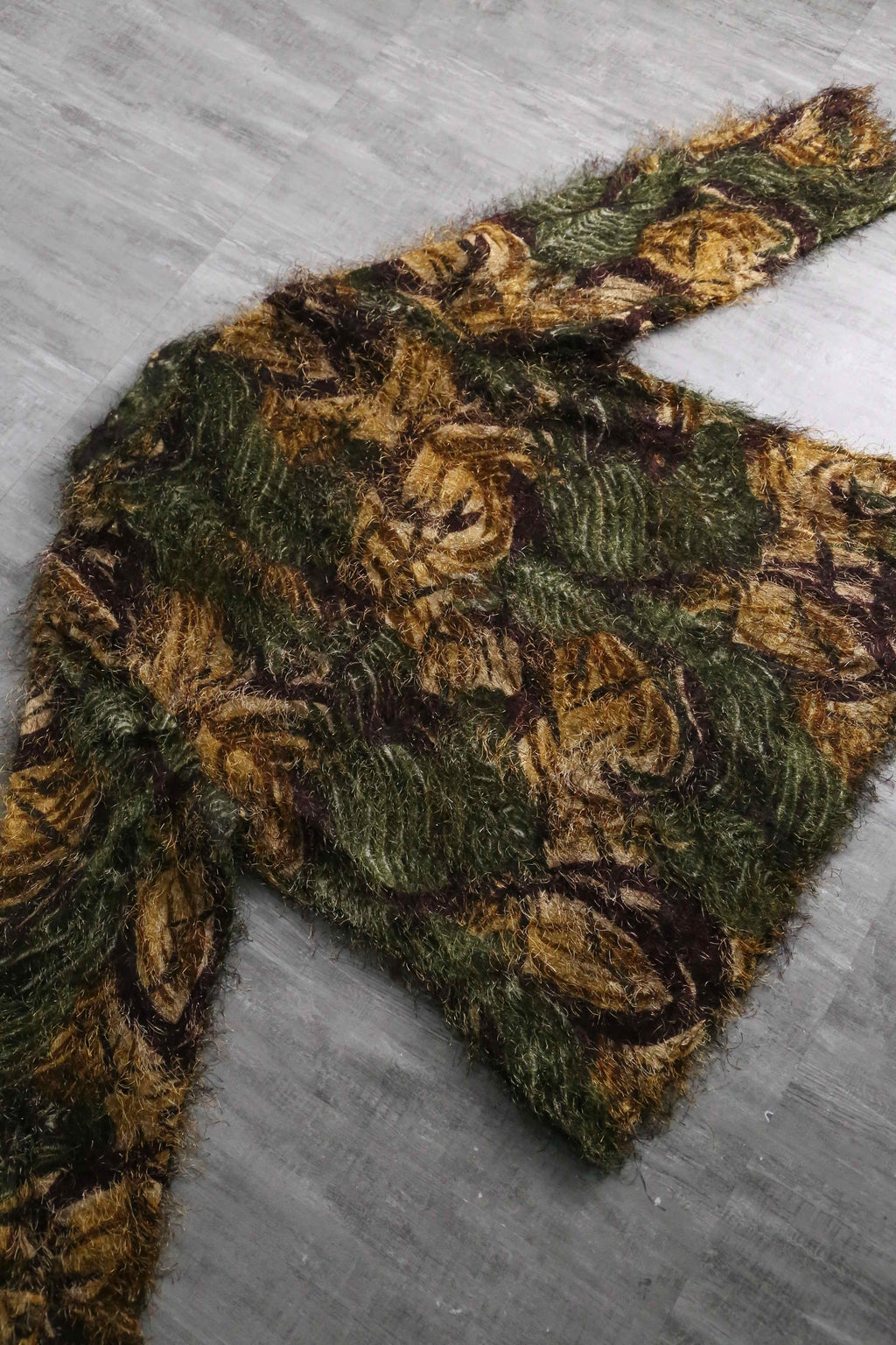 エキセントリックな雰囲気を纏ったシャギーシャツ。毛足の長いアイラッシュヤーンのような独創的なテクスチャーに、オリーブ、ブラウン、ブラックが複雑に混ざり合う抽象的な総柄が奥行きを感じさせる1着。