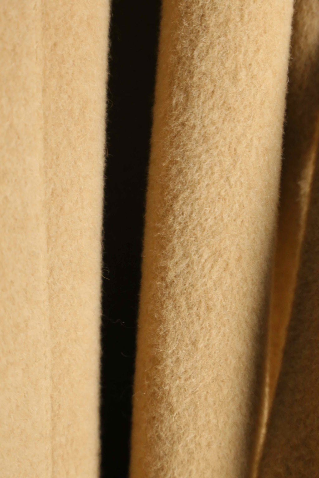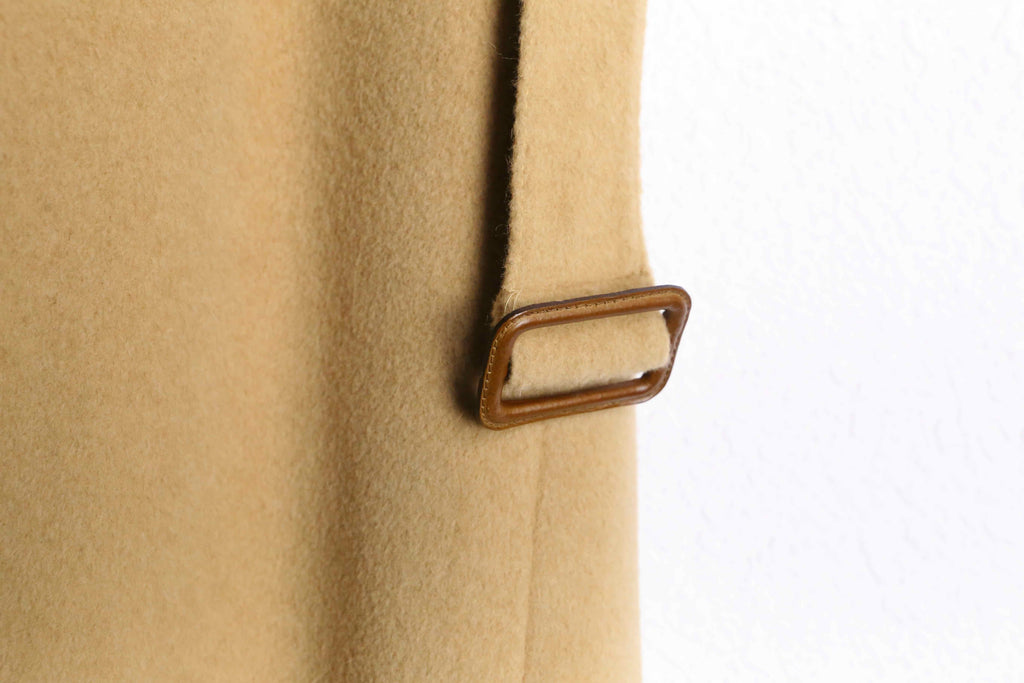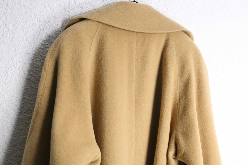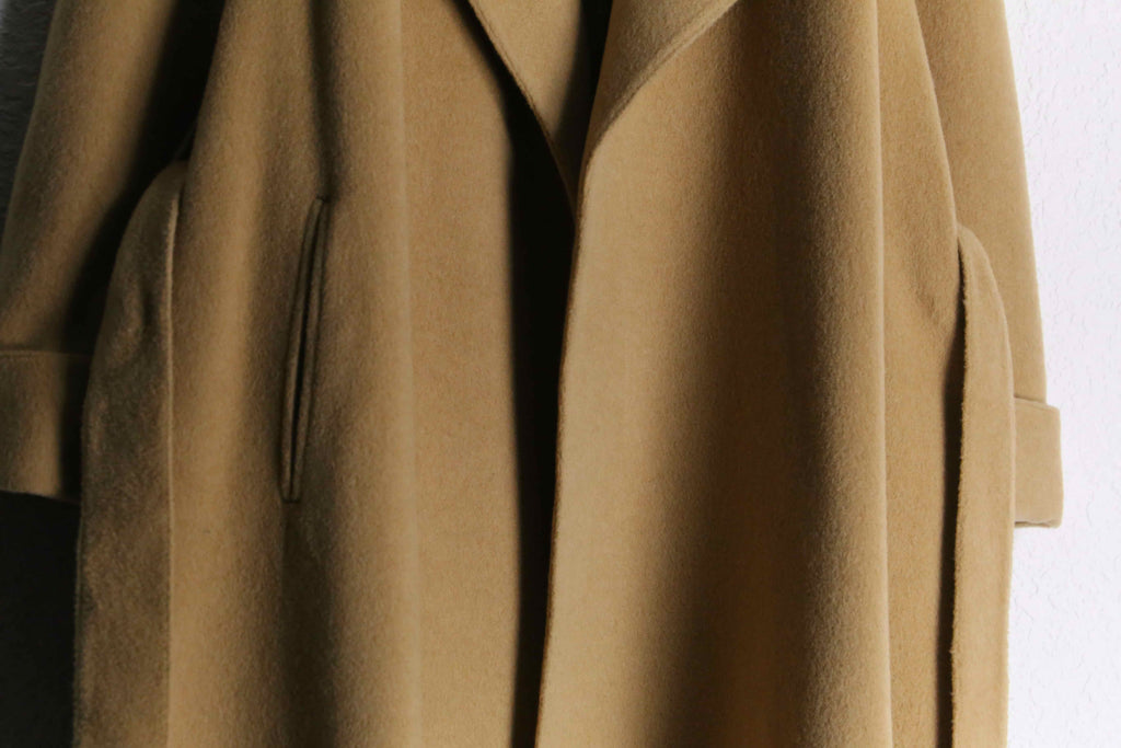 特筆すべきはその圧倒的なテクスチャー。素材表記こそないものの"推定ウール100%"という言葉では到底説明のつかない、カシミヤのような官能的で濡れたような光沢と或いは、キャメルヘアが持つ強靭かつ繊細な毛足を彷彿とさせます。袖を通せば、空気をたっぷりと含んだ重厚なドレープが身体を包み込み、どれほどコストを投じても再現不可能な、40年前の原料そのものの強さに圧倒されます。