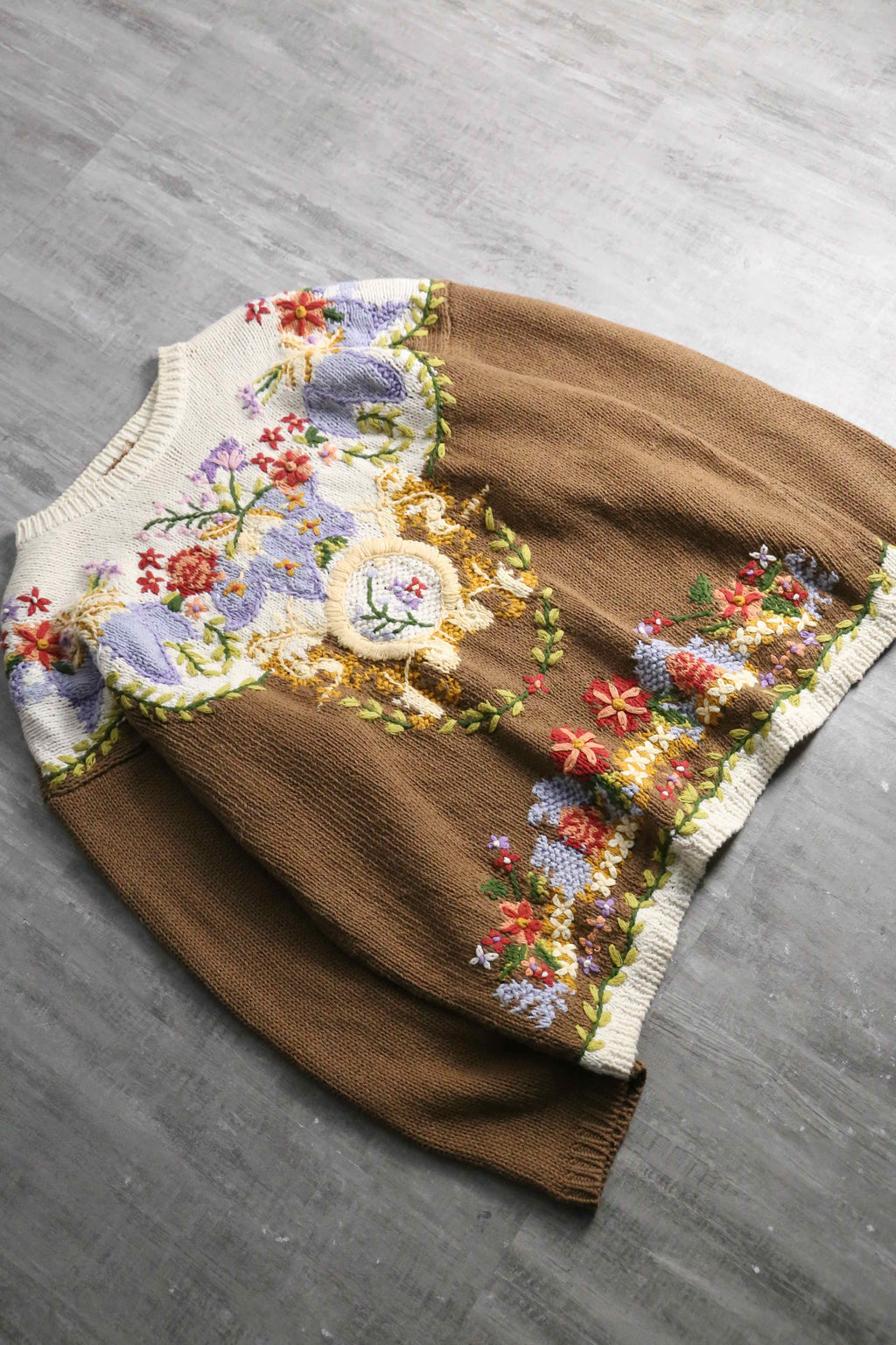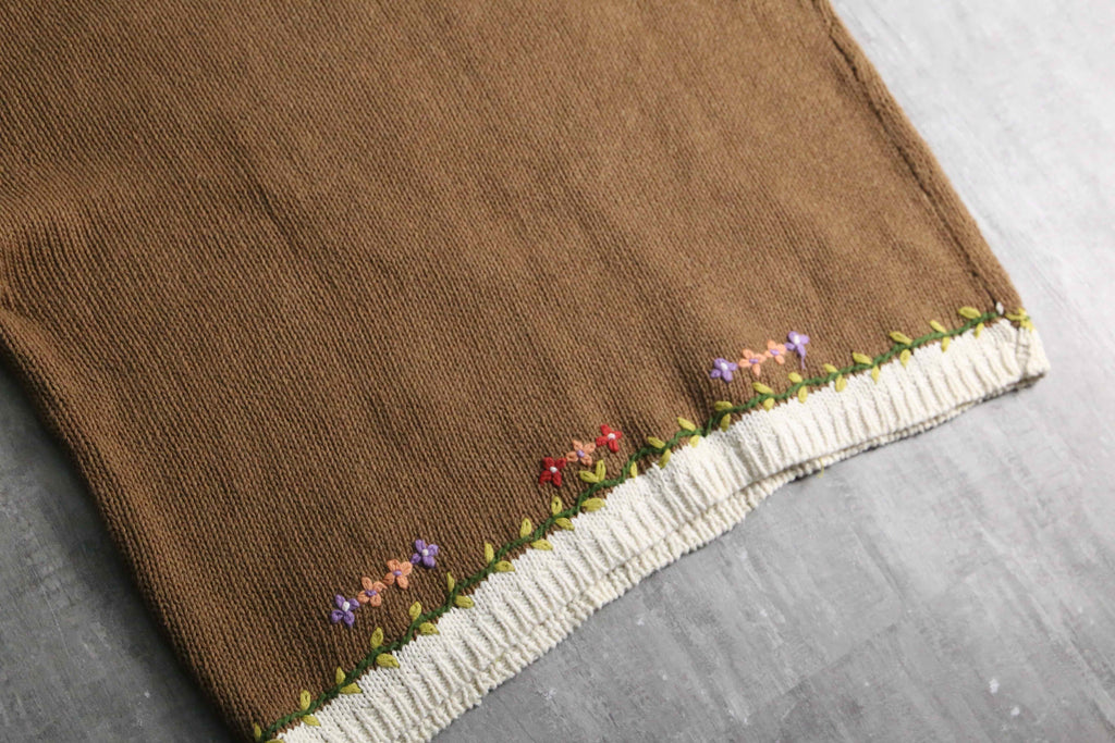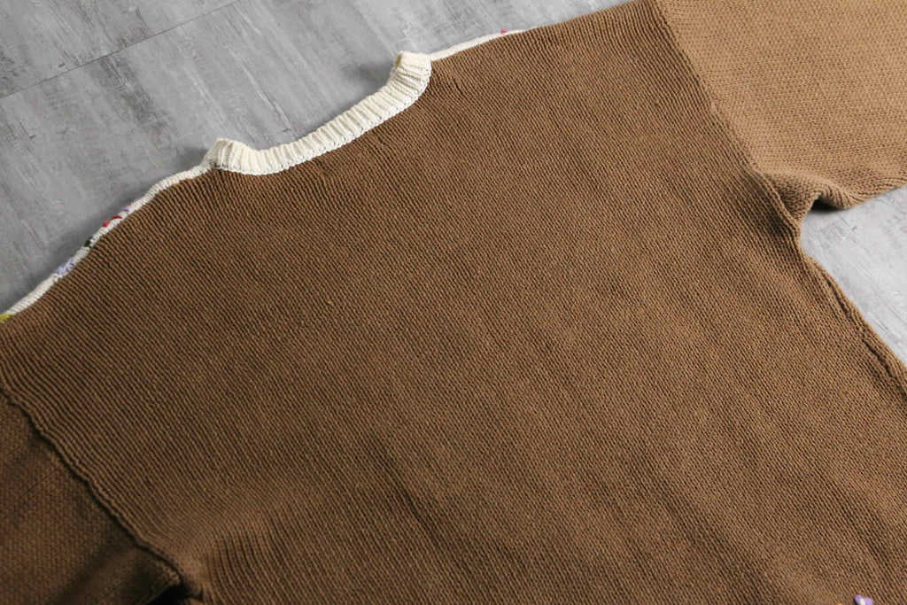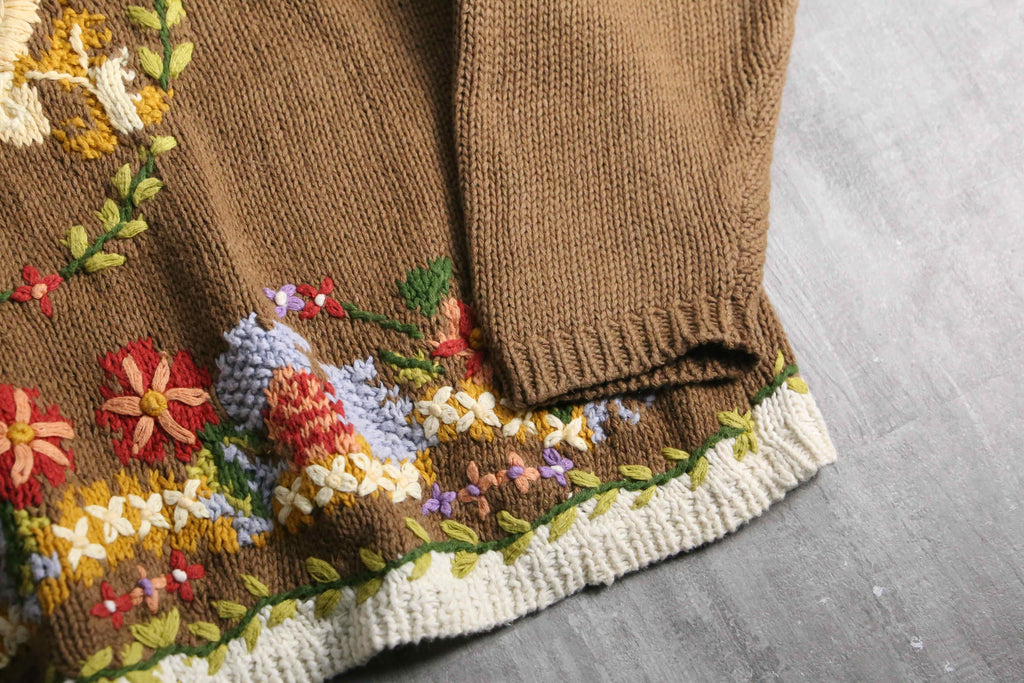 落ち着いたブラウンと柔らかなオフホワイトの切り替えをベースに、胸元や裾へ贅沢にあしらわれた立体的な草花刺繍が目を引く芸術的な1着。素材にはこの時代の高品質なニットによく見られるラミー×コットンの混紡を使用しており、手編みならではのざっくりとした心地よい重厚感と、天然素材らしい素朴な肌触りが魅力。Ficce等を彷彿させるカントリーやフォークロアな情緒漂うスペシャルニット。