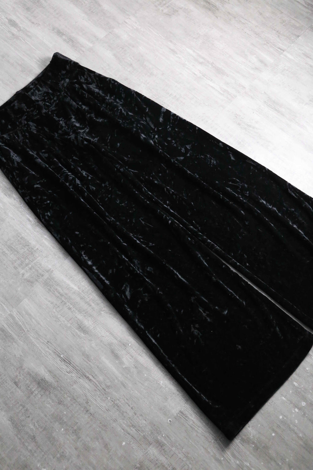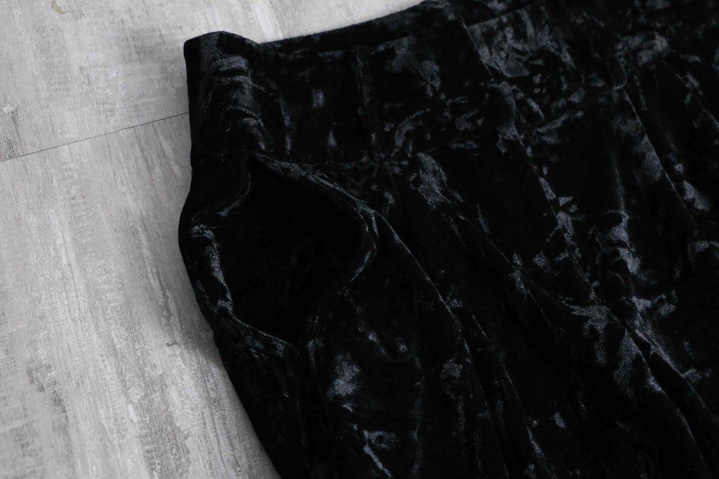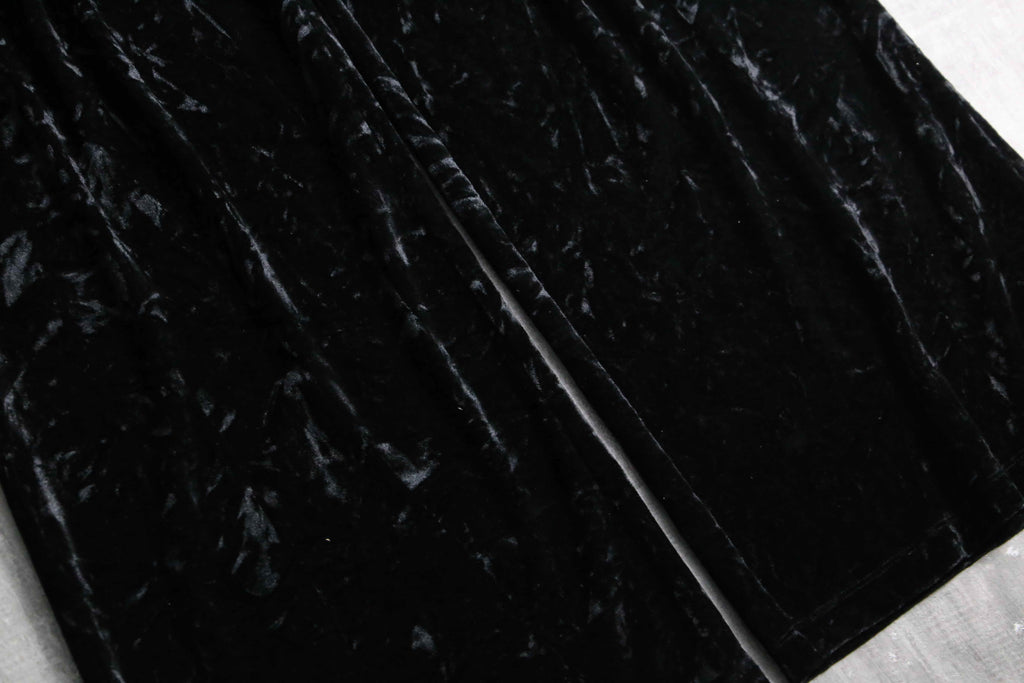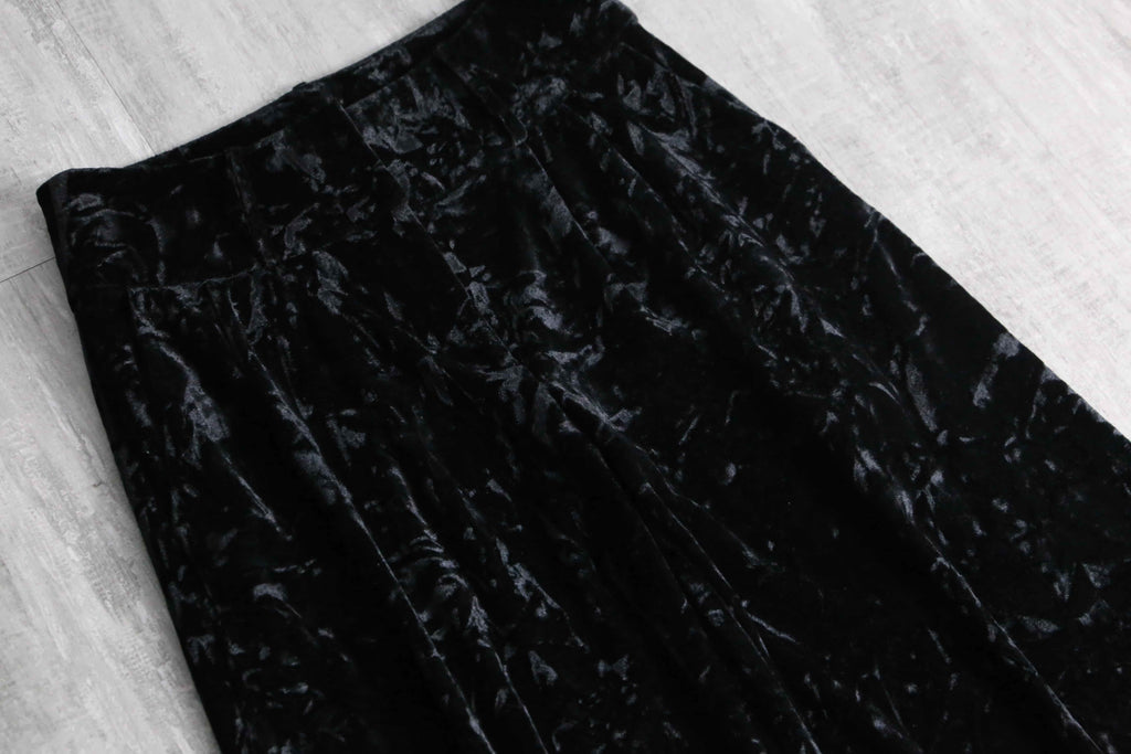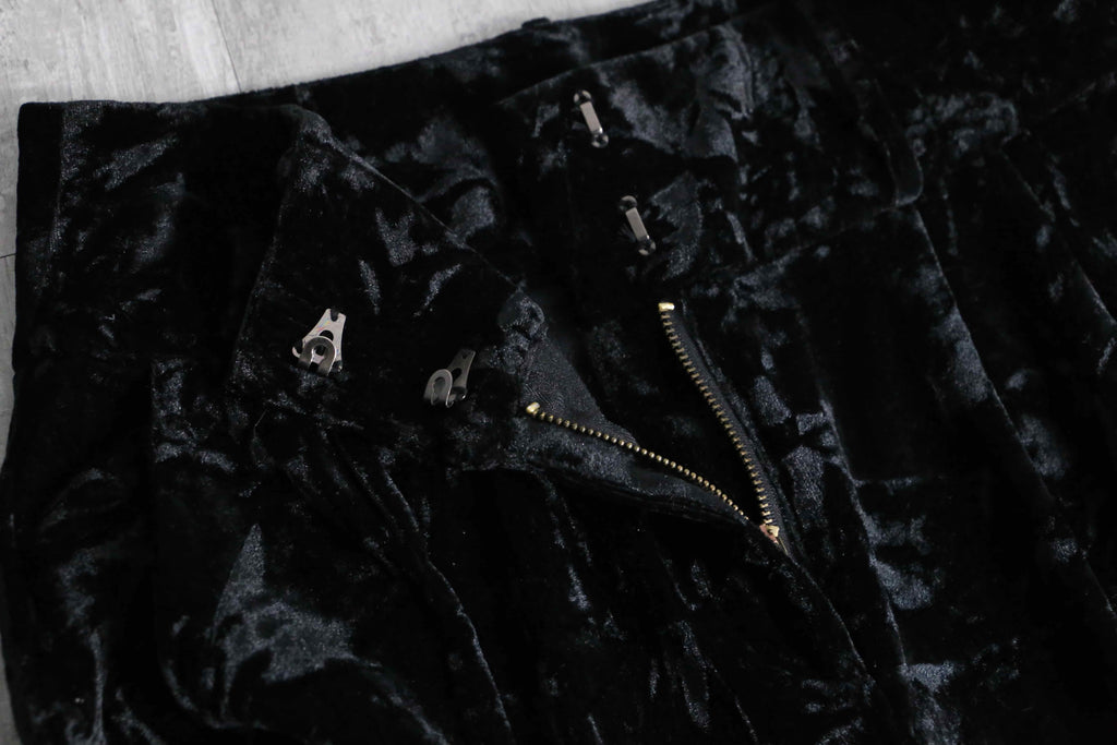 この毛足が不規則に寝たクラッシュベロアは、90年代末~00年代にHysteric Glamour等、当時の人気ブランドが多用したアイコニックな生地。加えて人気と需要の高い黒という点と珍しくベルトループも付きますから、アンニュイなスタイリングやモード系とも頗る良い相性を誇ります。