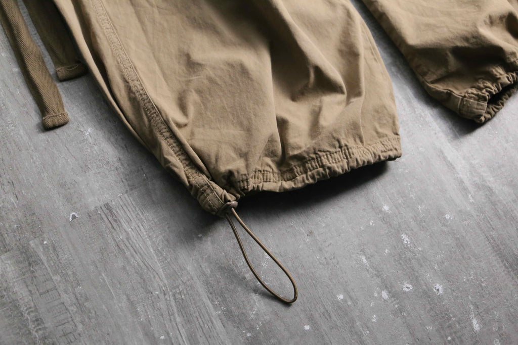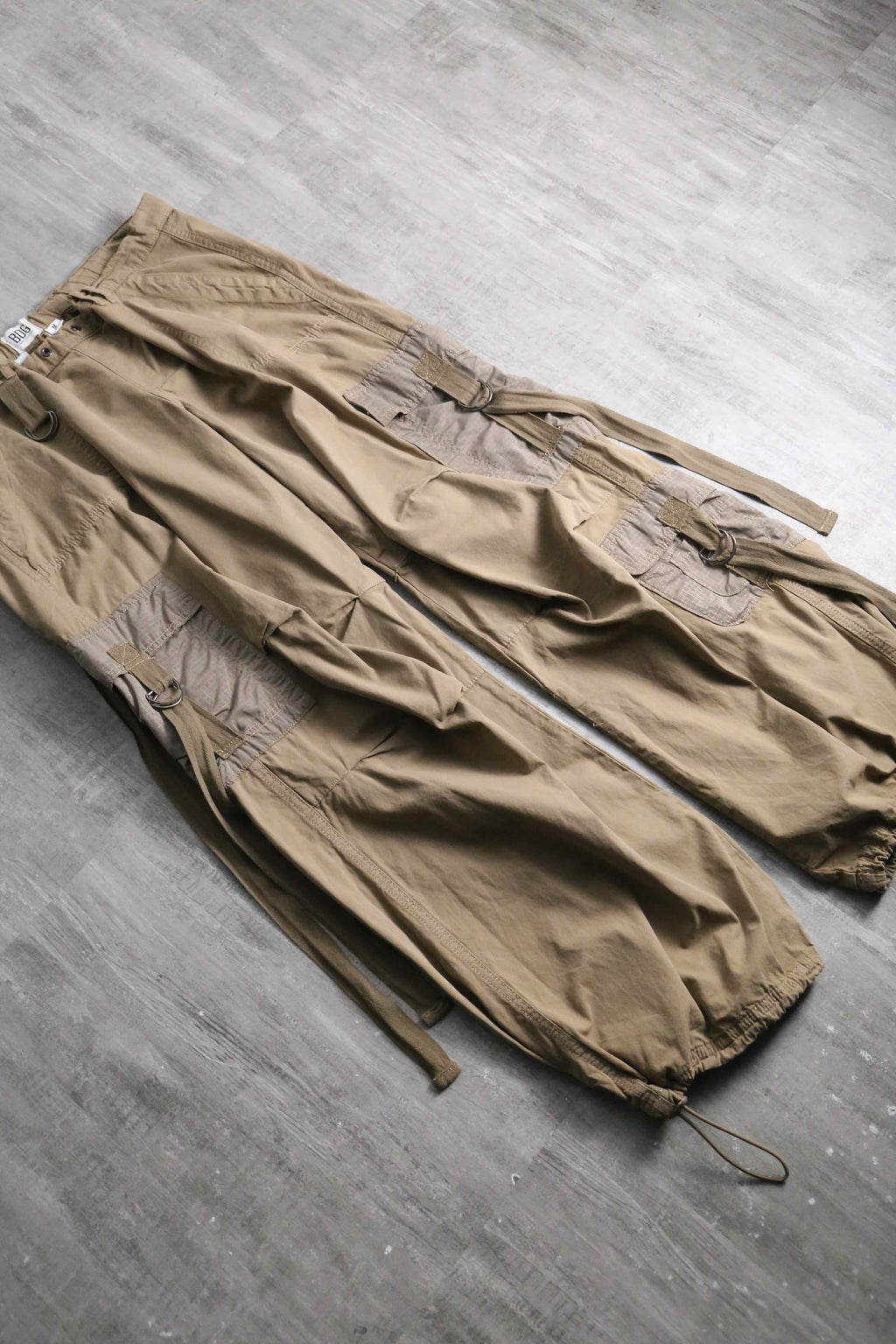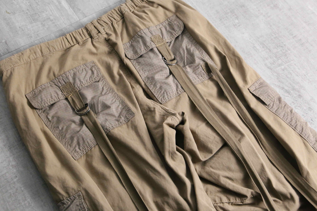 最大の特徴は、随所に配置されたロングストラップとDカン。歩くたびに揺れるストラップが、当時のレイヴスタイルや裏原系アーカイブのような無骨で退廃的な雰囲気を演出します。ポケットフラップ等にはリップストップのような切り替え生地が使用されており、単色ながらも視覚的な奥行きがあります。裾にはドローコードを完備。そのままワイドストレートで穿くのはもちろん、絞ることで足元にクッションを持たせたバルーンシルエットへの変更も可能です。