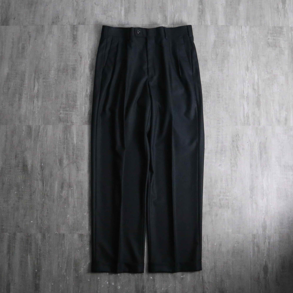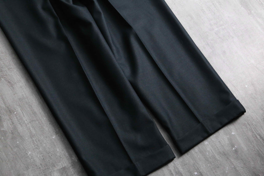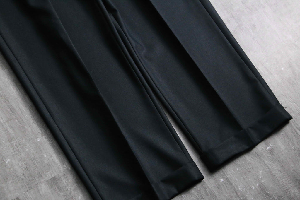 シルエットは当時らしい2タックを採用したゆとりのあるワイドストレート。裾のダブル仕上げが足元に程よい重厚感をプラス。さらに、ウエスト内側のライニングには丁寧なヘリンボーン織りの別布が配されるなど、見えない細部にまで同ブランドの美学とクラフトマンシップが凝縮されており、クラシックな装いからモダンなストリートスタイルまで、穿き手のスタイルを格上げしてくれる極上の1本。