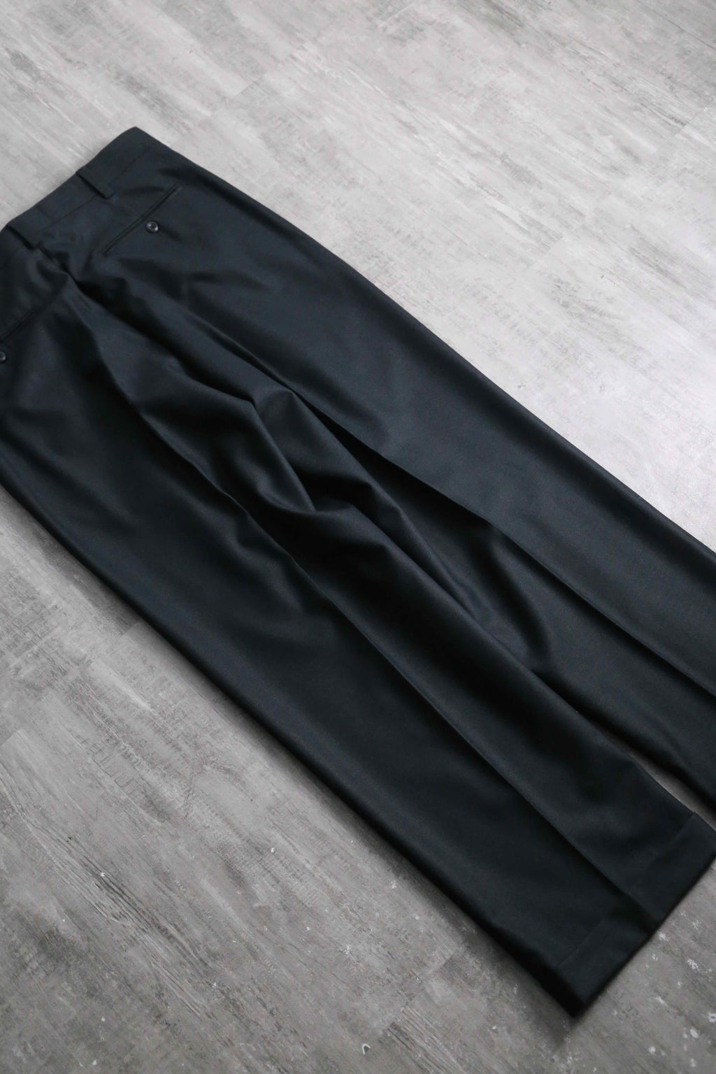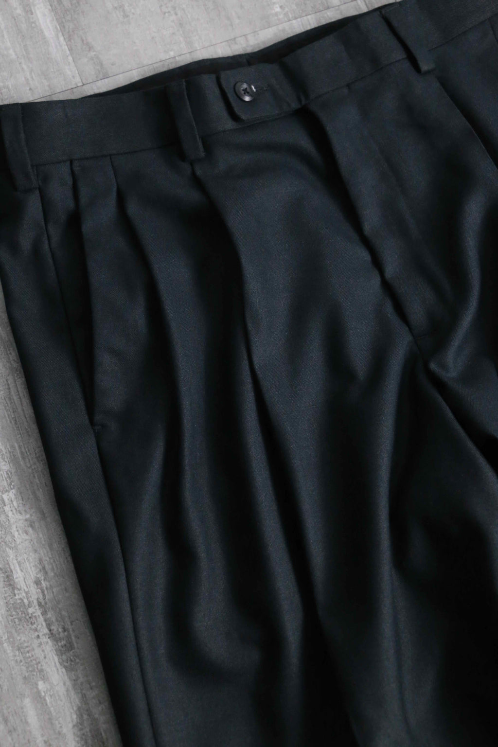 1990年代PERRY ELLIS PORTFOLIOのスラックス。ひと目で質の良さが伝わる重厚かつ繊細なポリレーヨンの二者混高密度ツイル生地が最大の特徴。一言で表せない青黒いカラーに浮かび上がる上品な光沢と、歩くたびに美しく流れるようなドレープ感が圧倒的な品格を漂わせます。