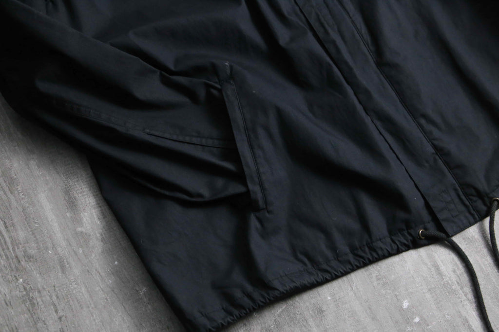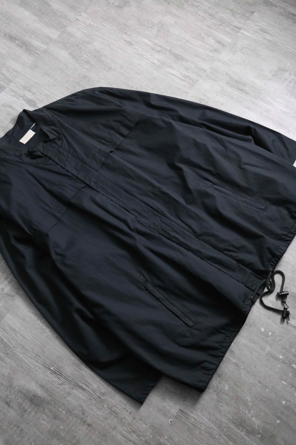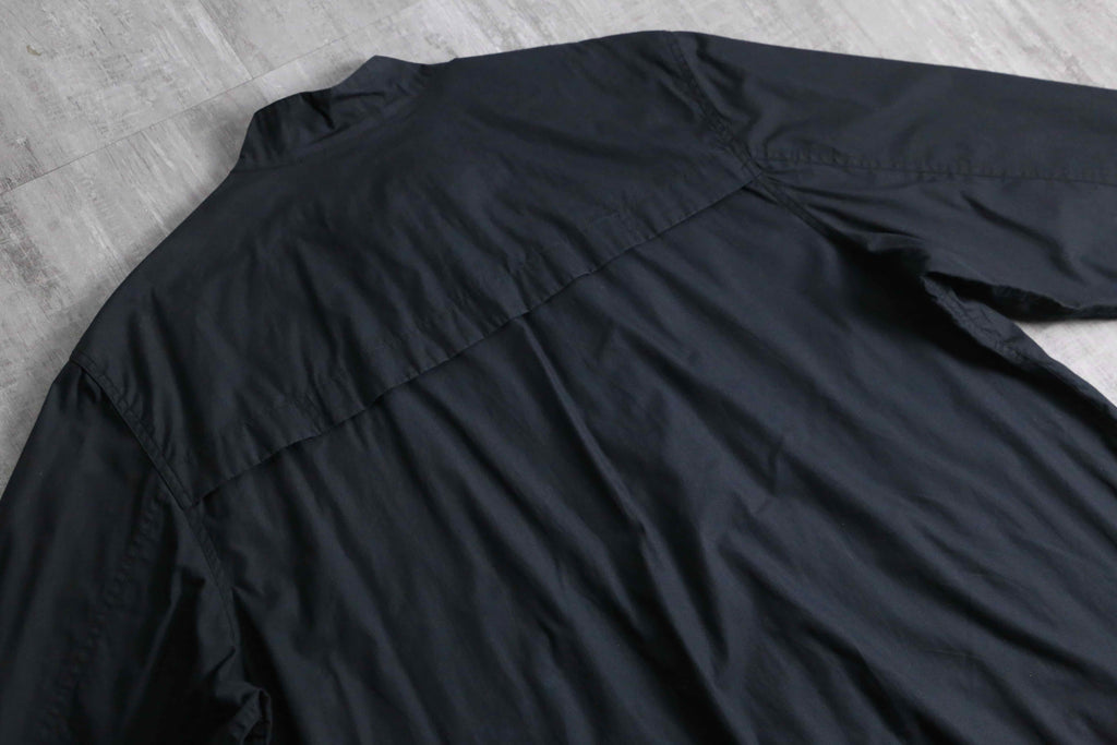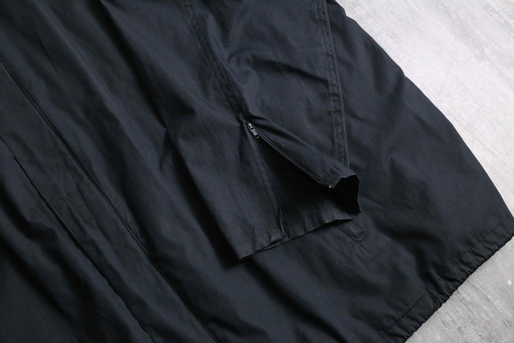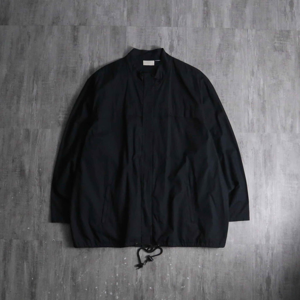 シャリ感のマットな質感のシャツ生地のボディに、立ちの良いスタンドカラーと比翼仕立てのフロントが都会的で洗練された印象。相反して袖口のジッパーによる開閉ギミックや裾のドローコードといったテクニカルな技巧派シャツジャケット。これでいてボタン式ではなくジップの機構なのも珍しいポイントです。