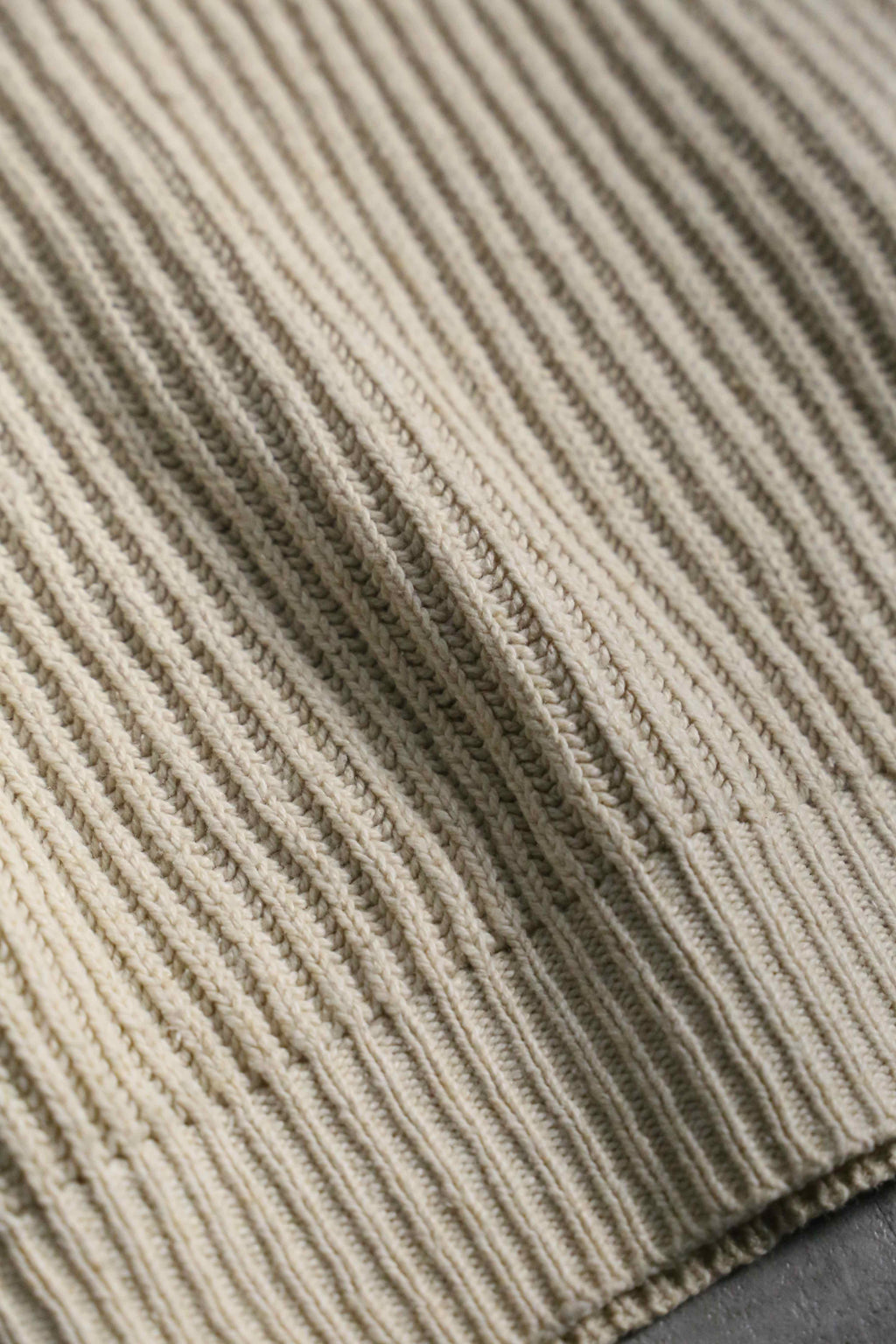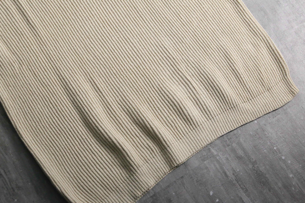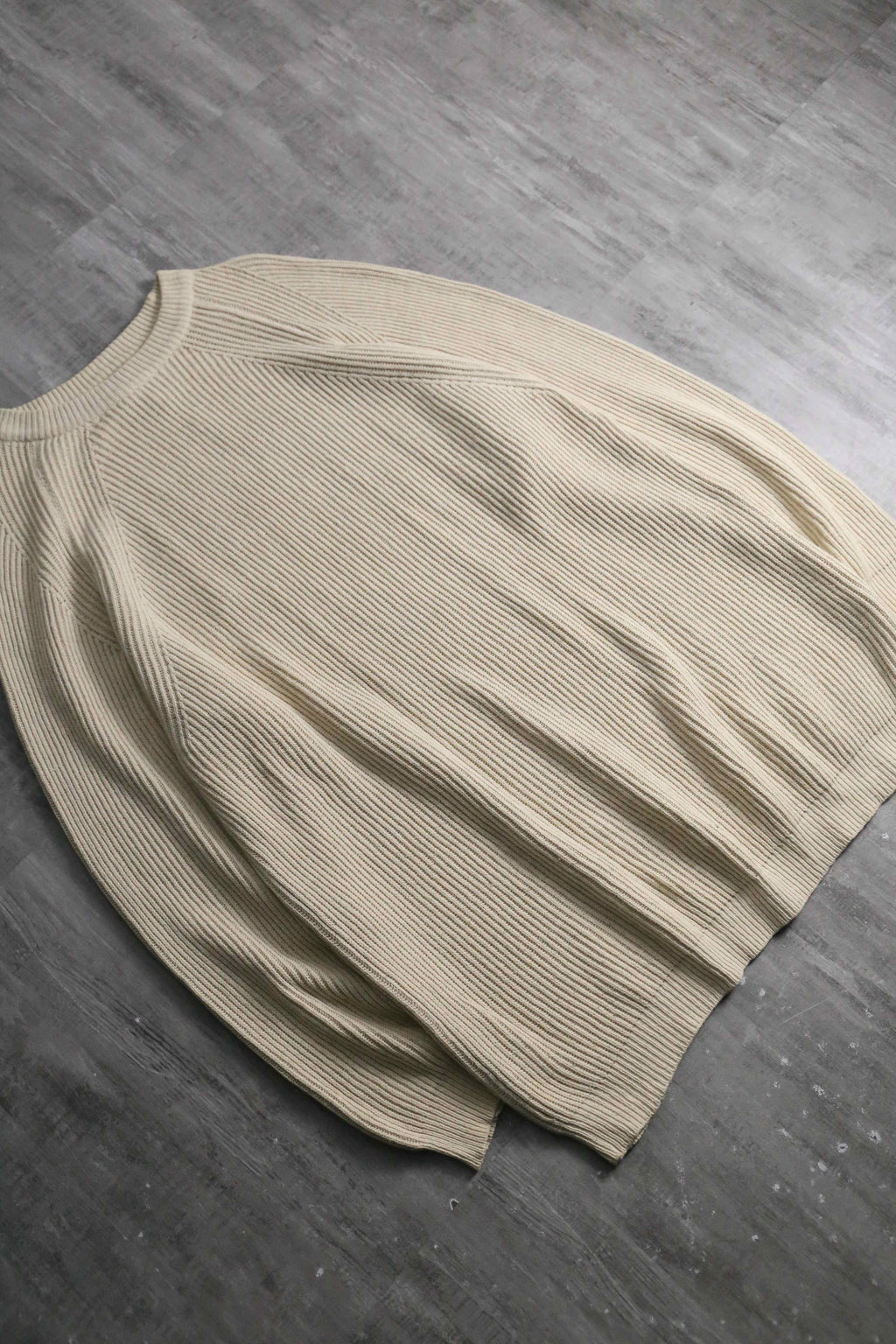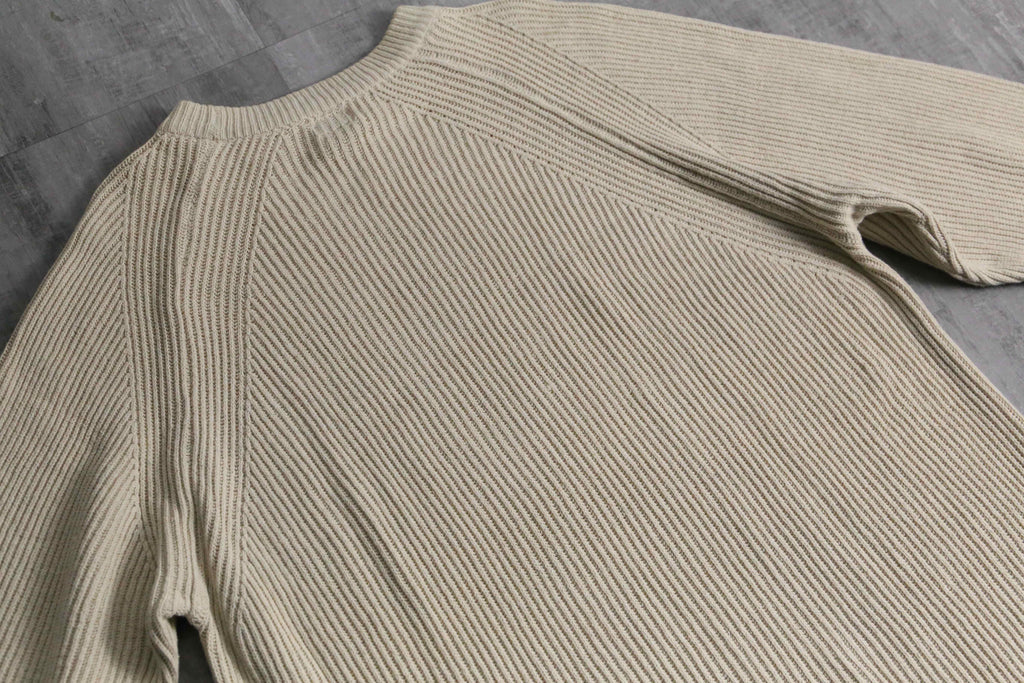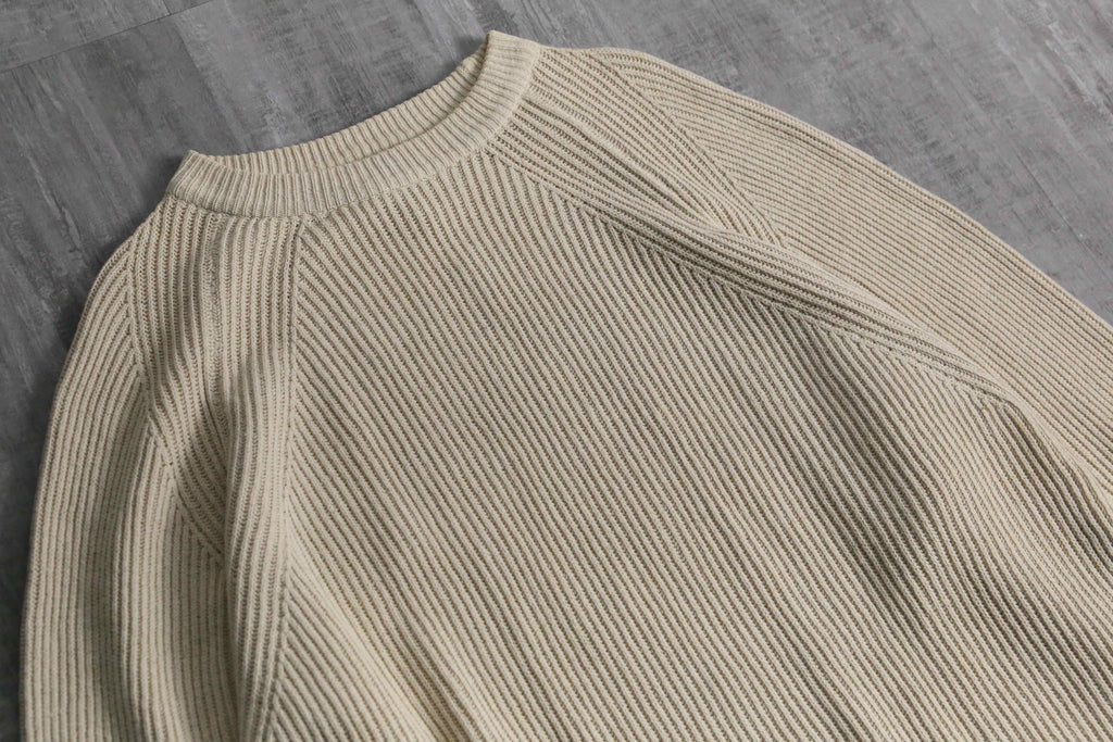 肉厚なリブ編みのコットンシルクの二者混紡ニットは、春にとても適切な保温力。スウェットの様な楽な着心地を実現しつつも、しっかりニットとしての品性も保ちます。サイズは非常にルーズなオーバーサイズかつラグラン肩になっている為、肩の落ち感やドレープ感も出やすくなっています。