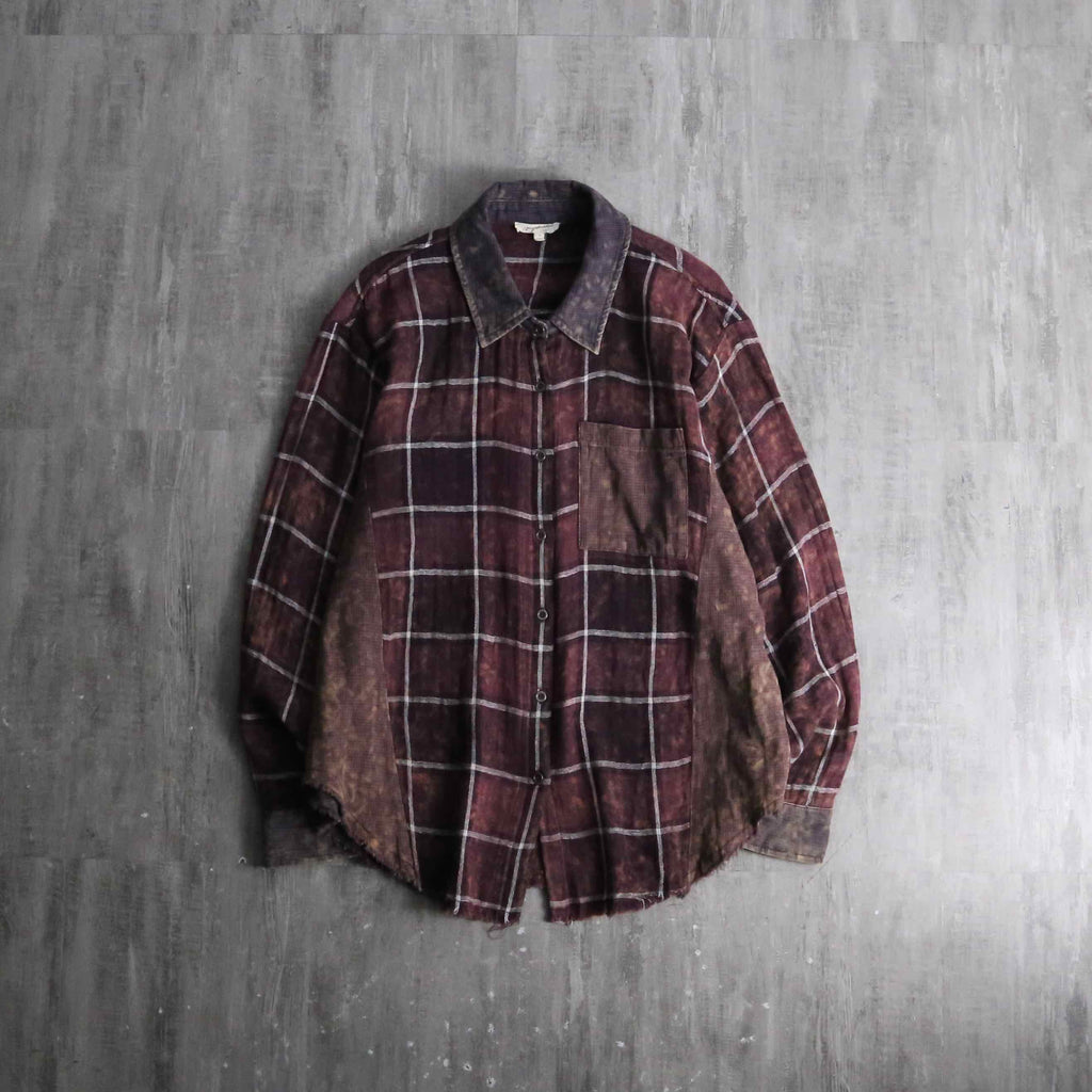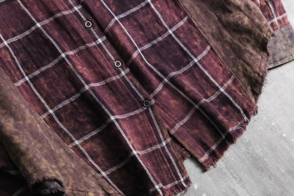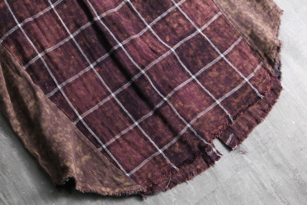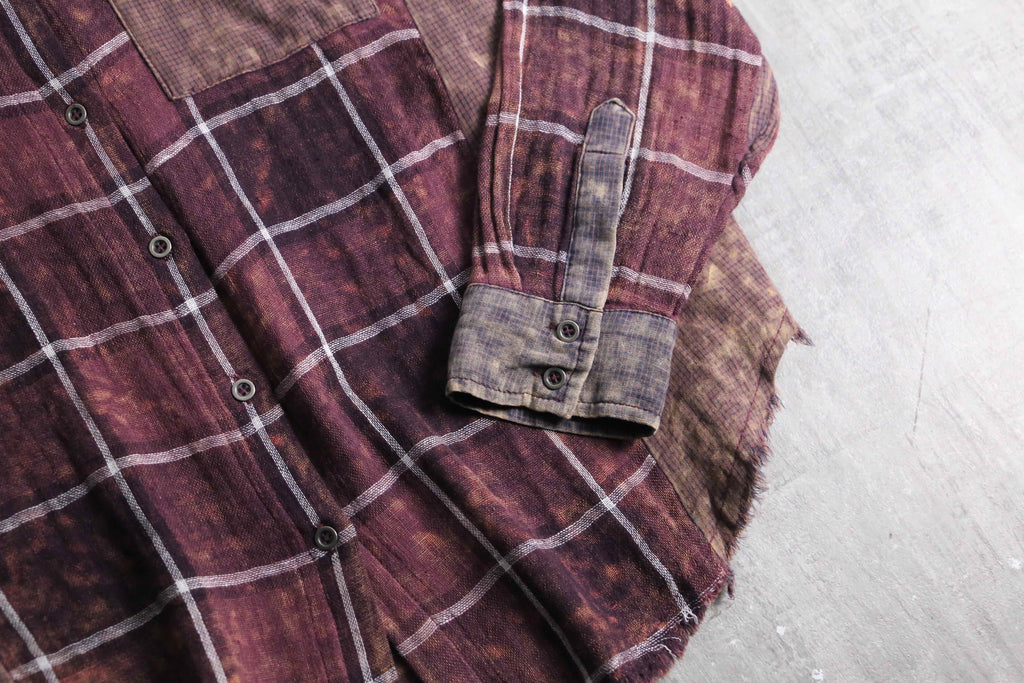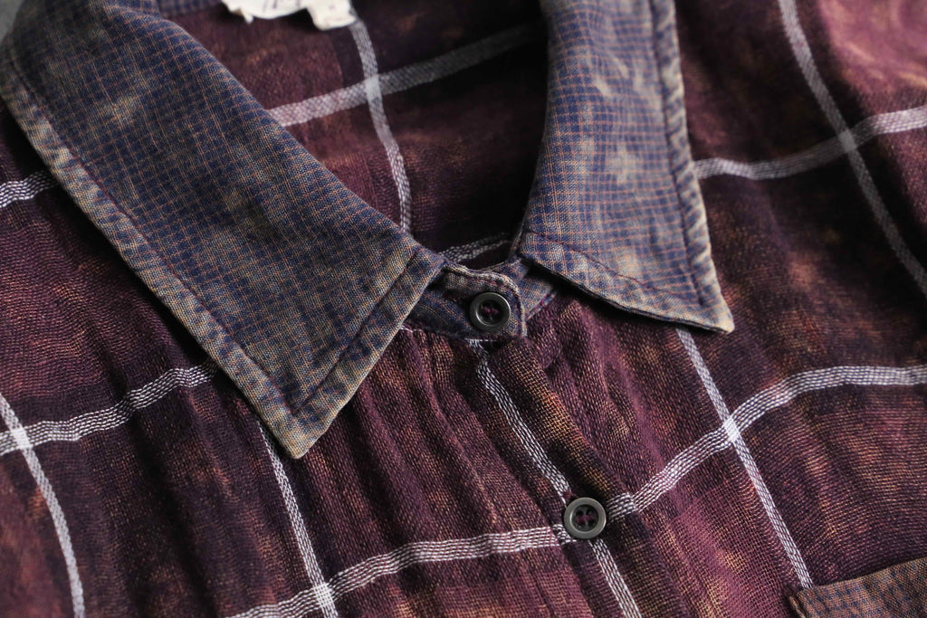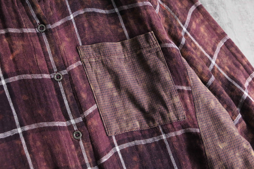 全体には落ち着いたボルドーのチェック柄を配しつつ、部分的に施されたムラ染めによって奥行きのある表情。ポケットや襟、袖、脇下には異なる生地をあしらい、さりげないコントラストとなっています。