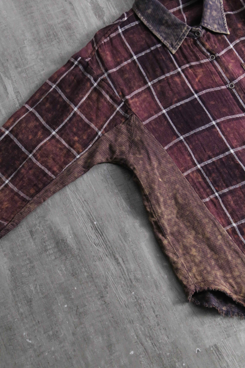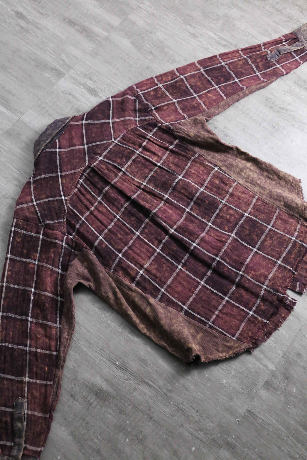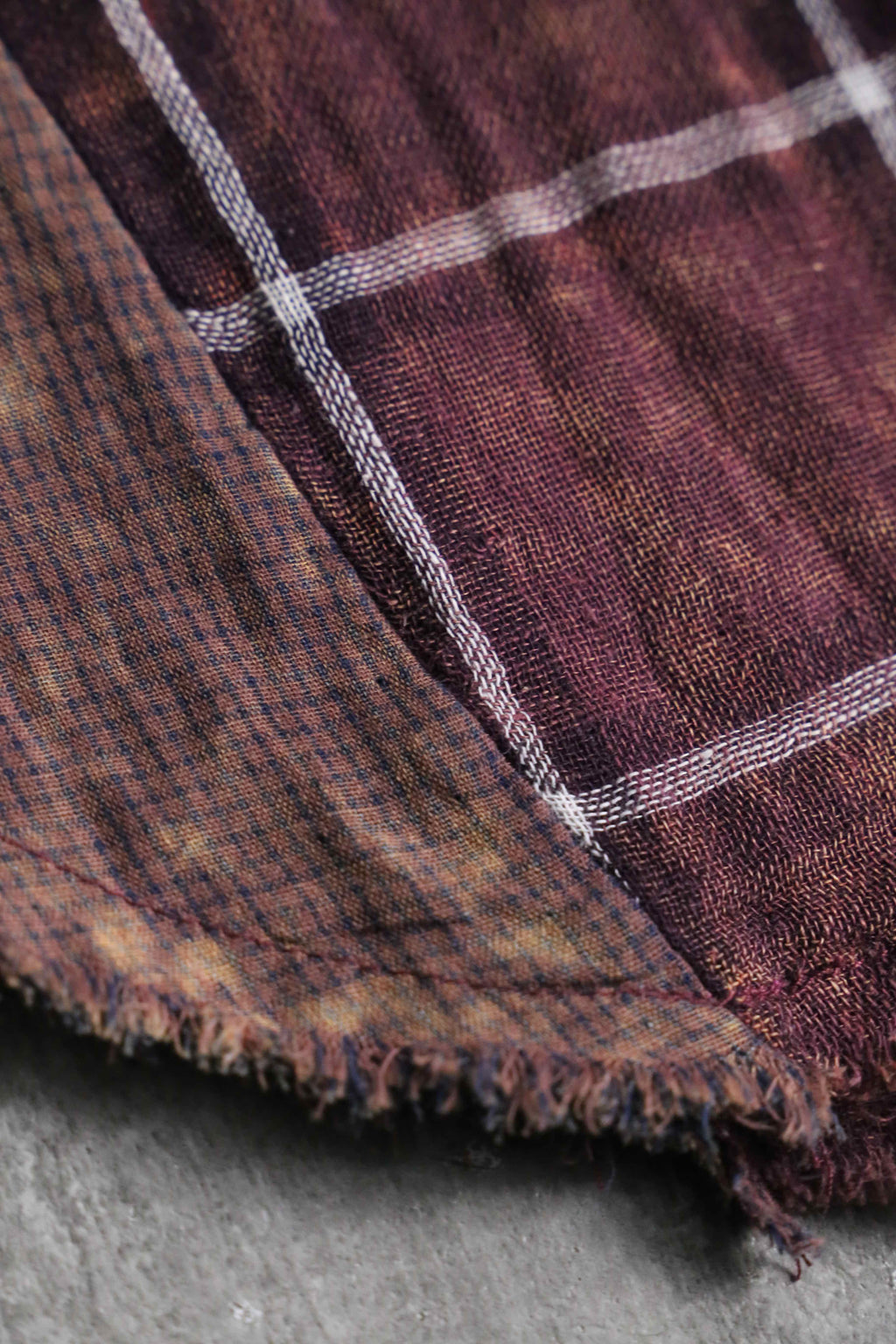 全体には落ち着いたボルドーのチェック柄を配しつつ、部分的に施されたムラ染めによって奥行きのある表情。ポケットや襟、袖、脇下には異なる生地をあしらい、さりげないコントラストとなっています。