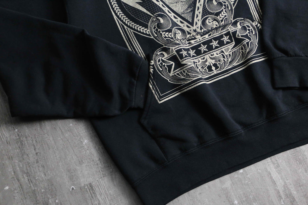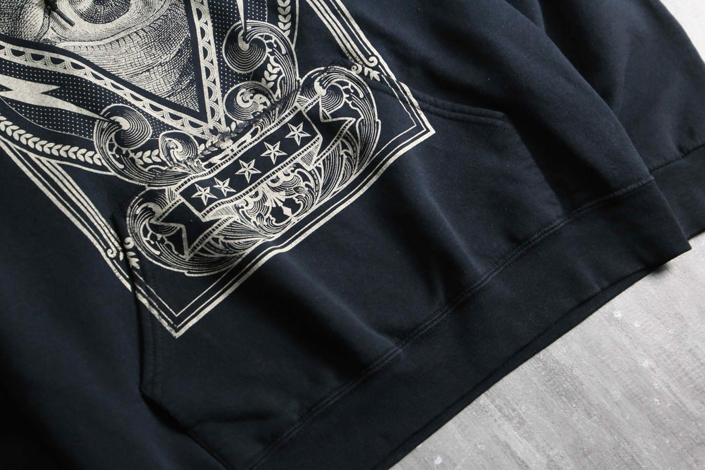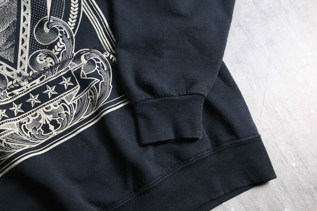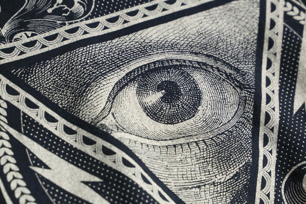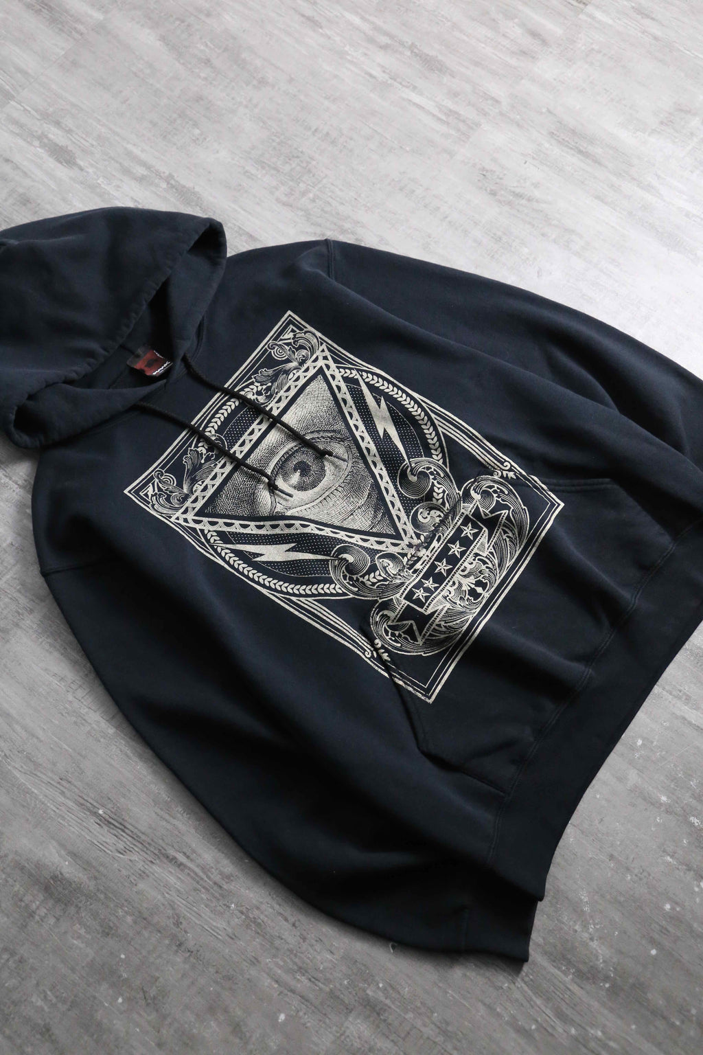最大の魅力は、紙幣の彫刻を彷彿とさせる緻密なタッチで描かれた「プロビデンスの目(万物を見通す目)」のグラフィック。三角形の中に配された瞳、エッジの効いた稲妻、そして下部に並ぶ5つのスターなど、当時のスケートブランドやストリートウェアで流行した秘密結社やダラーモチーフを再構築した、非常にインパクトのあるデザインに仕上がっています。