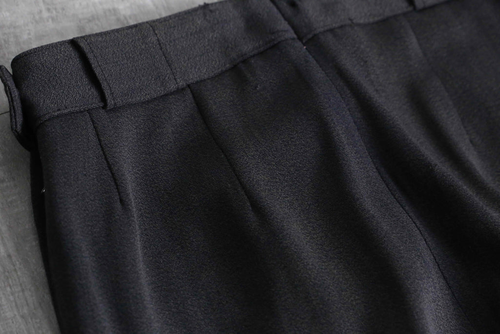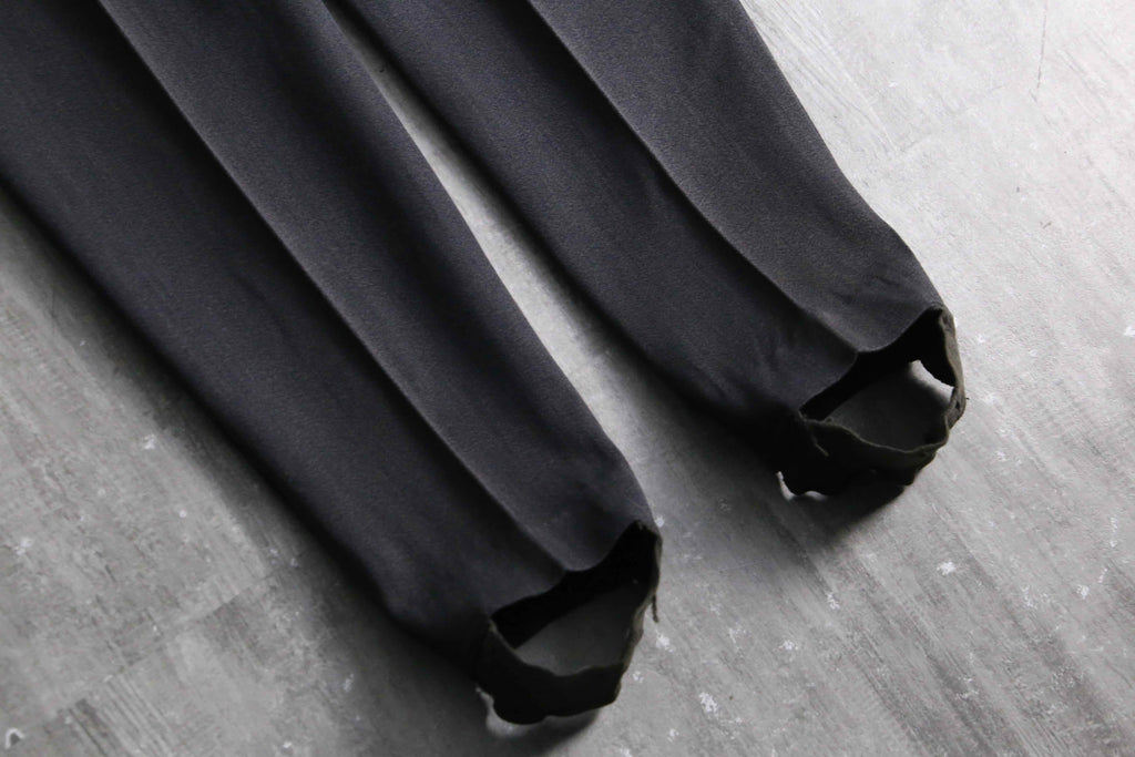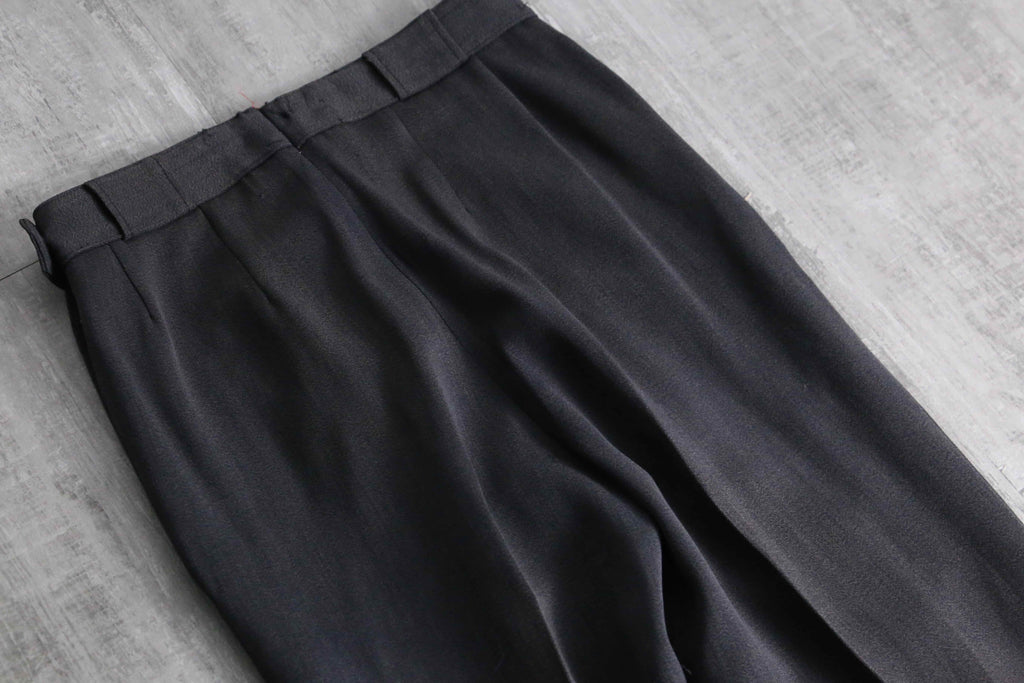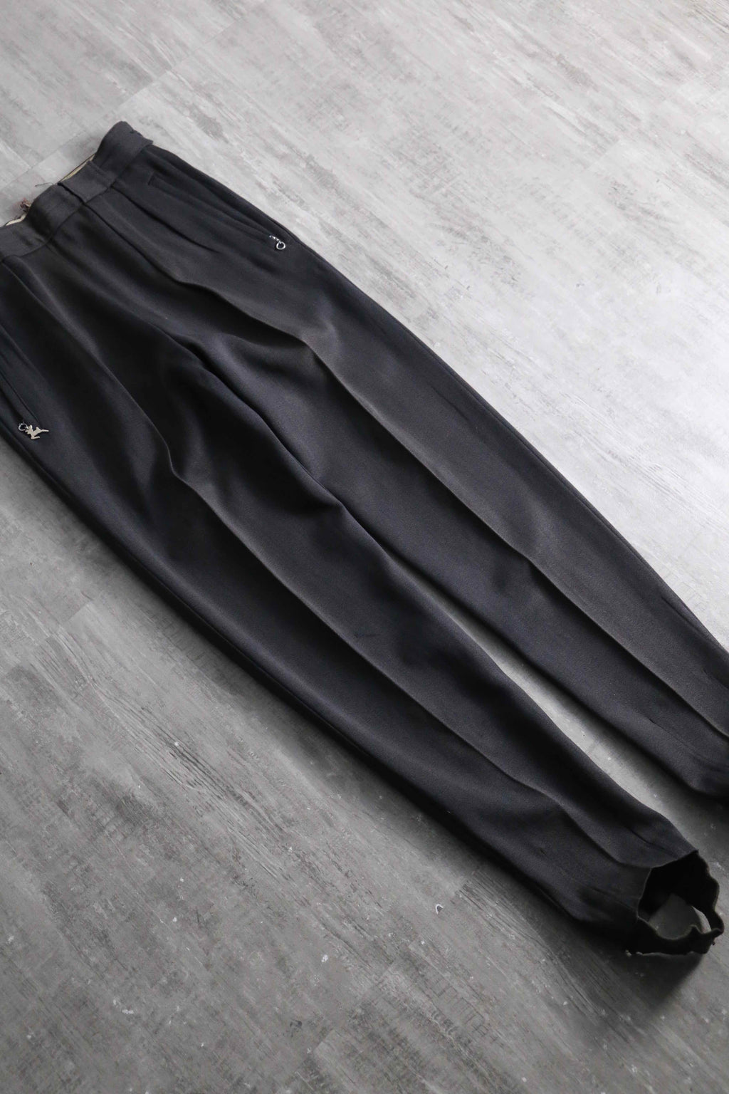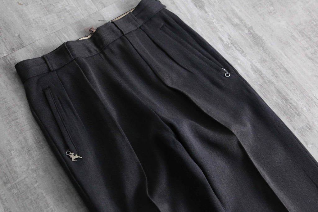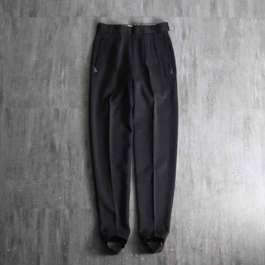 レーヨンにウールを混紡した、独特の光沢とドレープ性を兼ね備えたとろみのあるギャバジン生地を採用。ポケットジッパーにはWhite Stagのアイコニックな牡鹿のチャームを搭載、スキートラウザーズ特有のサイドジッパーには棒タロンジッパーを配し、フロントには2本の美しいインタック。そして裾には、ヴィンテージ特有の土踏まずに掛けるゴムストラップ(スターラップ)を備えた、まさに当時の本格的なスキー、アウトドア仕様。更に、ニューヨークやアトランタに展開していた高級店「John Jarrell Inc.」のダブルネームタグが付属しており、当時の富裕層向けに展開されていたハイエンドな1着であることを物語っています。