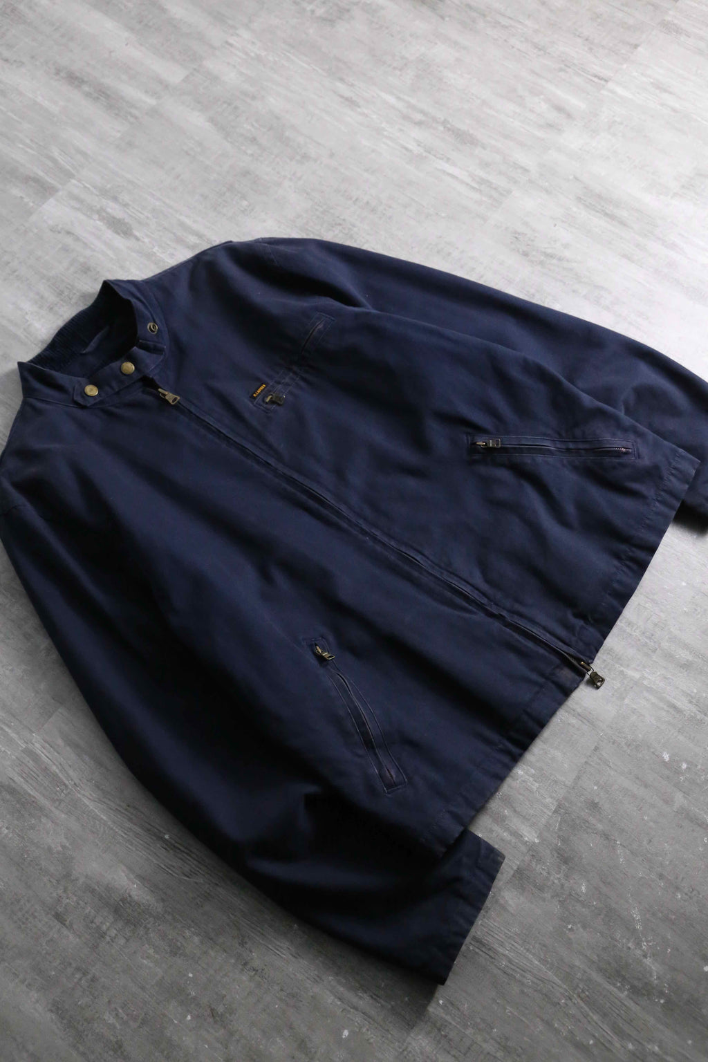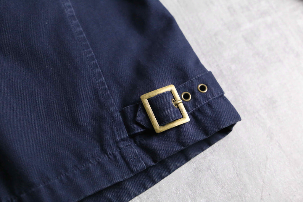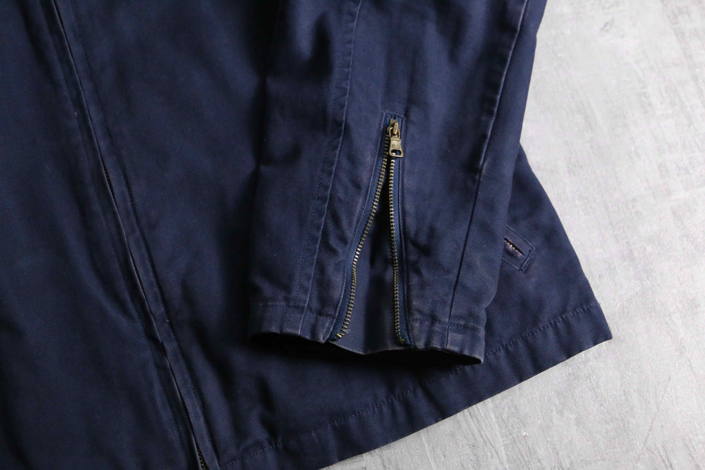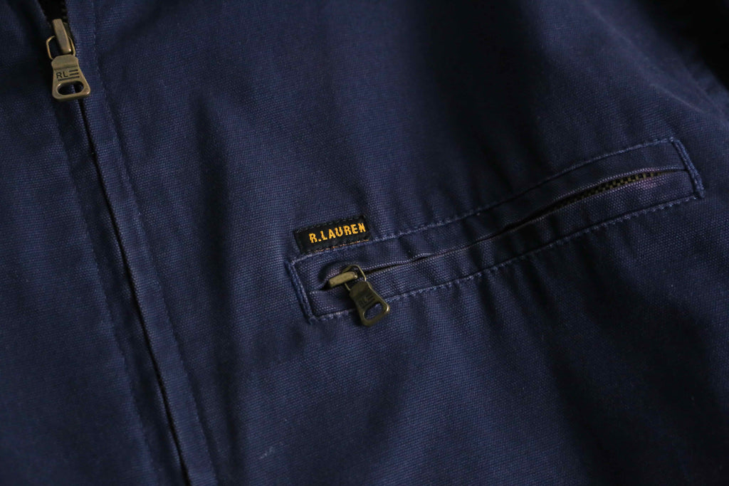 タフで肉厚なコットンキャンバス生地(ダック地に近い質感)を使用した、武骨さとラルフらしい洗練さが混在したジャケット。首元のコーデュロイ切り替えや、ロゴ刻印が施された重厚なブラスのダブルジップやスナップボタン、さらには袖口のジッパーやウエストサイドのバックルアジャスターなど、ライダースジャケットを彷彿させるディティール満載です。