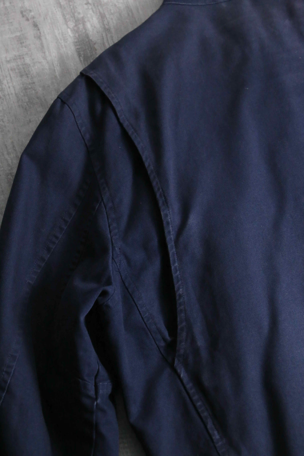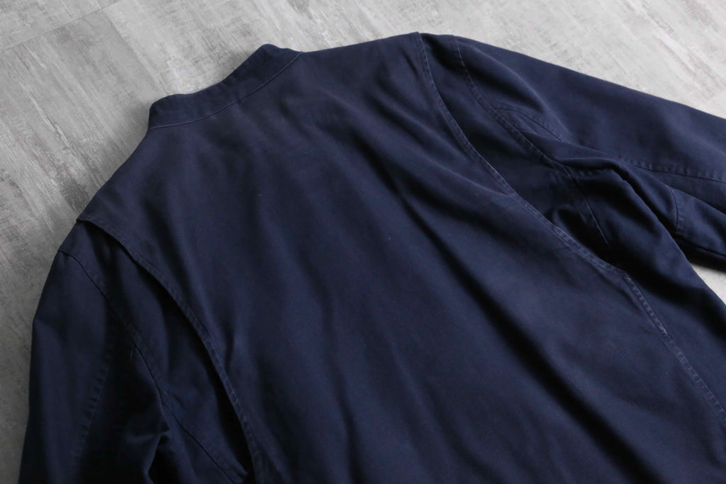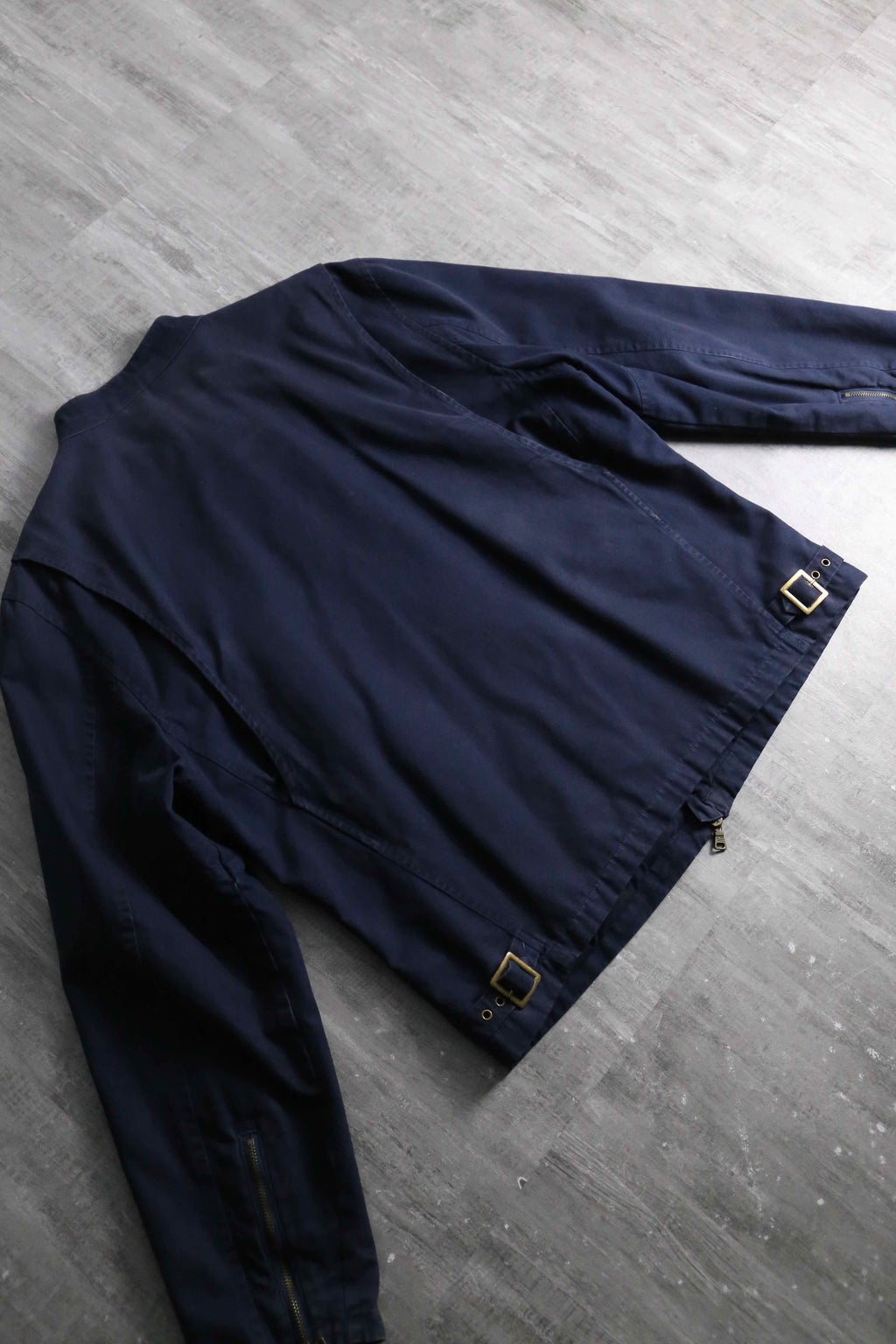 タフで肉厚なコットンキャンバス生地(ダック地に近い質感)を使用した、武骨さとラルフらしい洗練さが混在したジャケット。首元のコーデュロイ切り替えや、ロゴ刻印が施された重厚なブラスのダブルジップやスナップボタン、さらには袖口のジッパーやウエストサイドのバックルアジャスターなど、ライダースジャケットを彷彿させるディティール満載です。