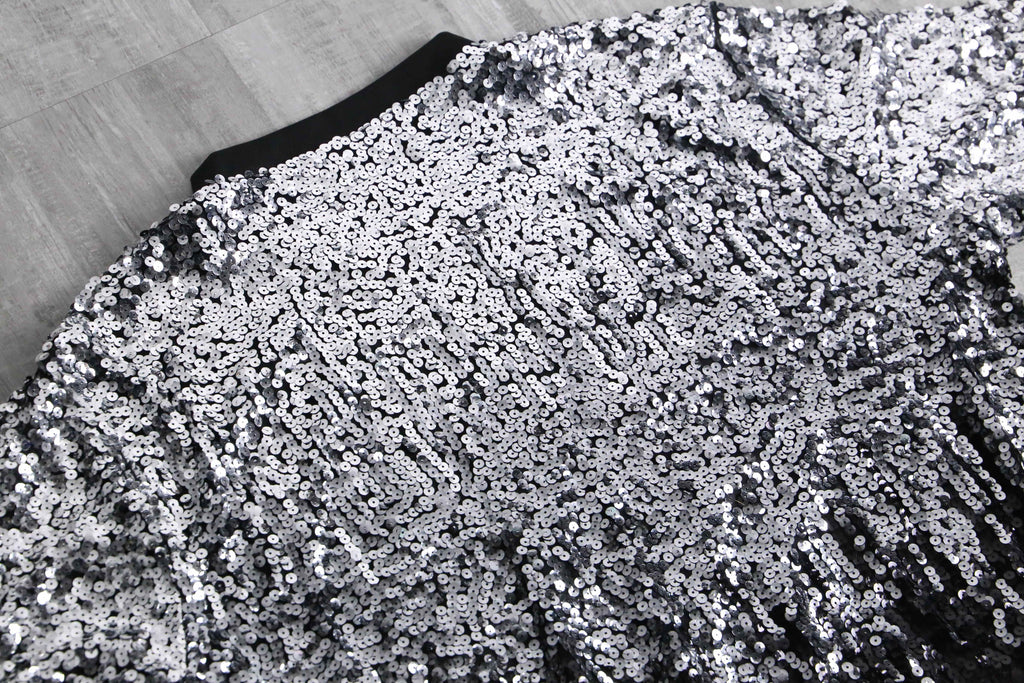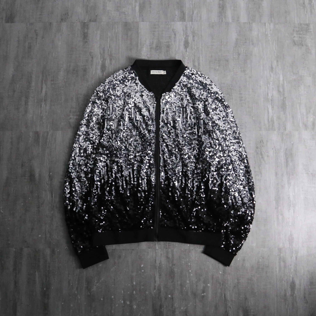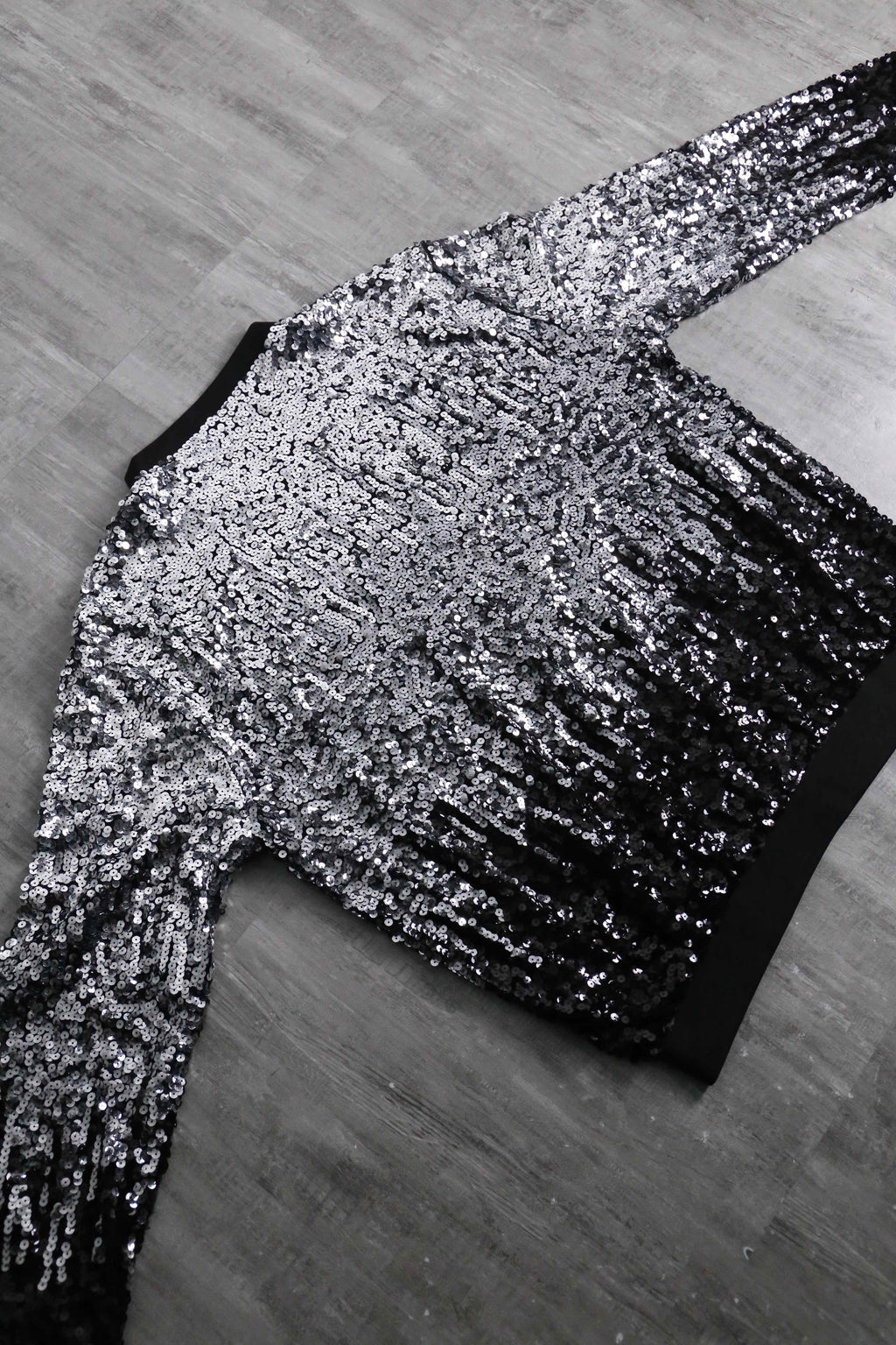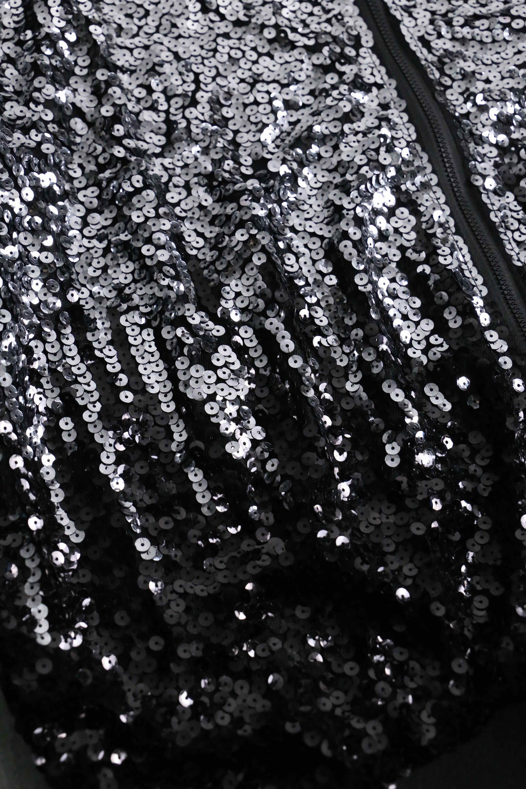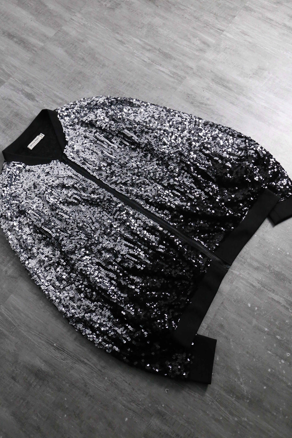 全面に贅沢にあしらわれたスパンコールが、光の角度によって繊細かつダイナミックに表情を変える圧巻のブルゾン。シルバーからブラックへと滑らかに移ろうグラデーションは、単なる装飾の域を超えた完成度の高さを感じさせます。