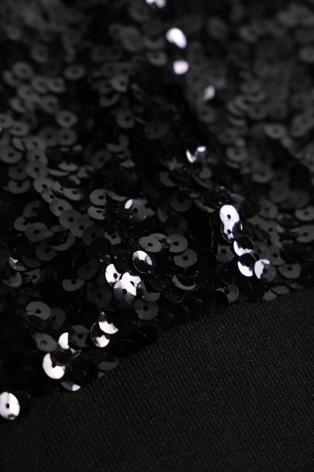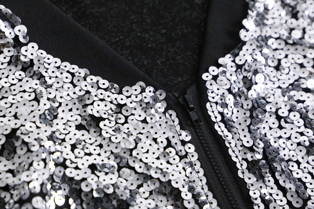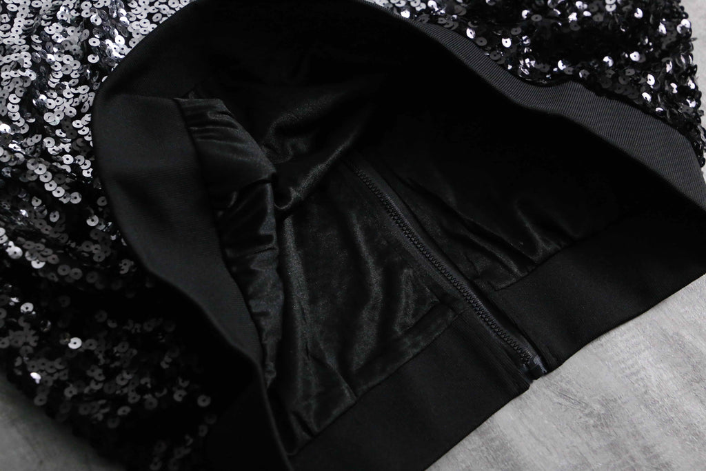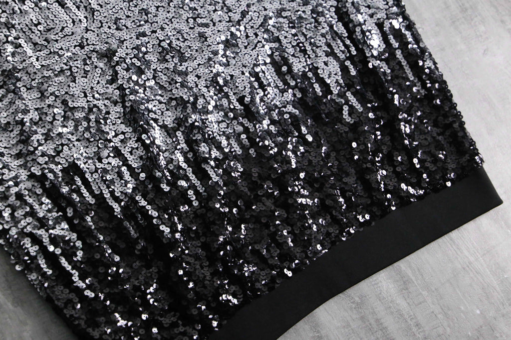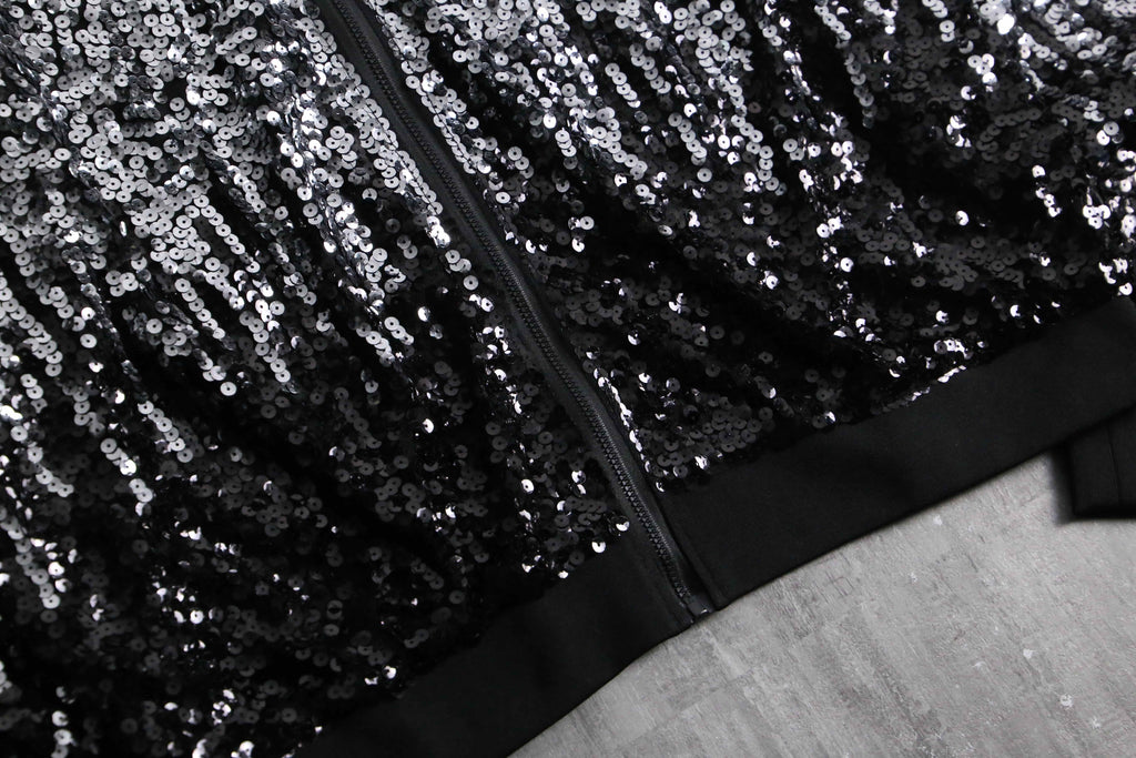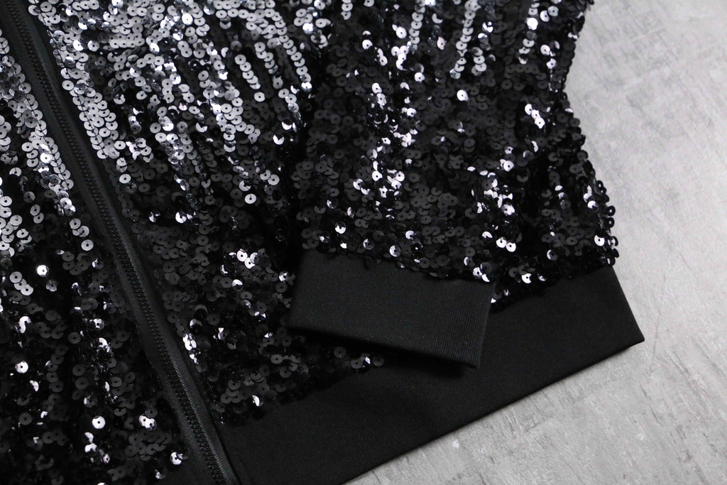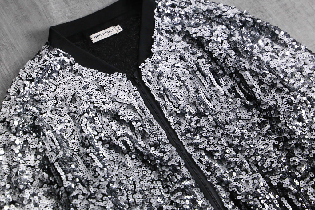 全面に贅沢にあしらわれたスパンコールが、光の角度によって繊細かつダイナミックに表情を変える圧巻のブルゾン。シルバーからブラックへと滑らかに移ろうグラデーションは、単なる装飾の域を超えた完成度の高さを感じさせます。