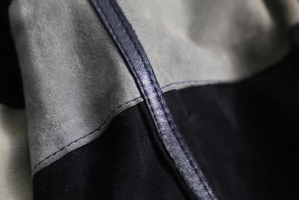 鼠色と褪せた黒の2トーンボーダー調。縦に走るはスムースレザーのパイピング。各所リブはニット地、裏地もしっかり付くのでカーディガンの形といえど確りライトアウターとして機能します。シームに沿ったポケットも備える機能面も優秀。バギーデニムにざっくり羽織るくらいで楽しみたいスペシャルな1着です。
