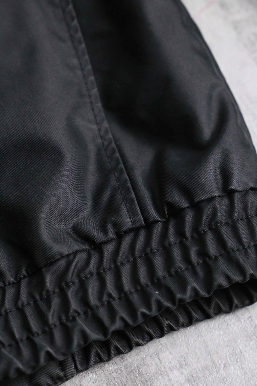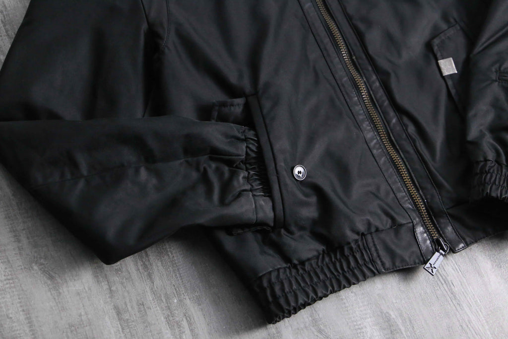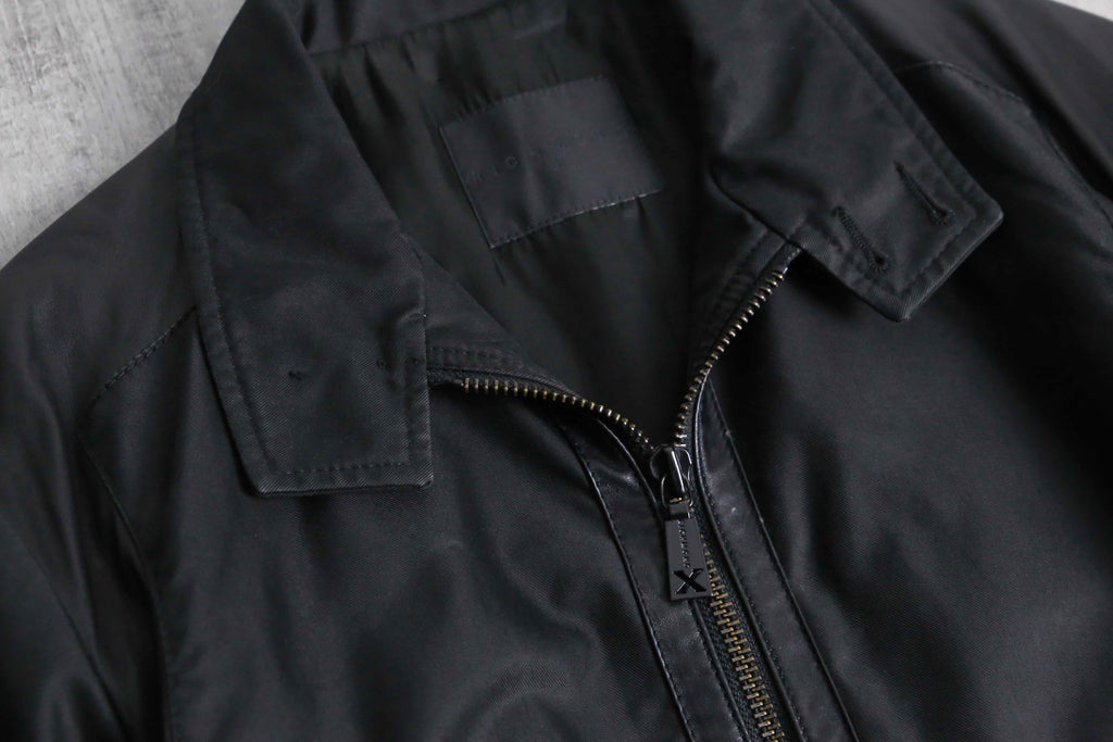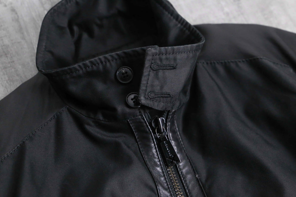 コットンナイロンのタフなツイル生地のボディ、ジップ周りと肩はレザーの切り替え、少しの綿を含むパッファータイプ、バラクータの名作G-9を踏襲したハリントン型と黒の短丈アウターとして完璧な条件を携えます。