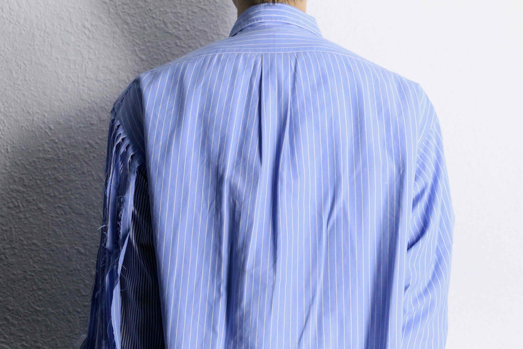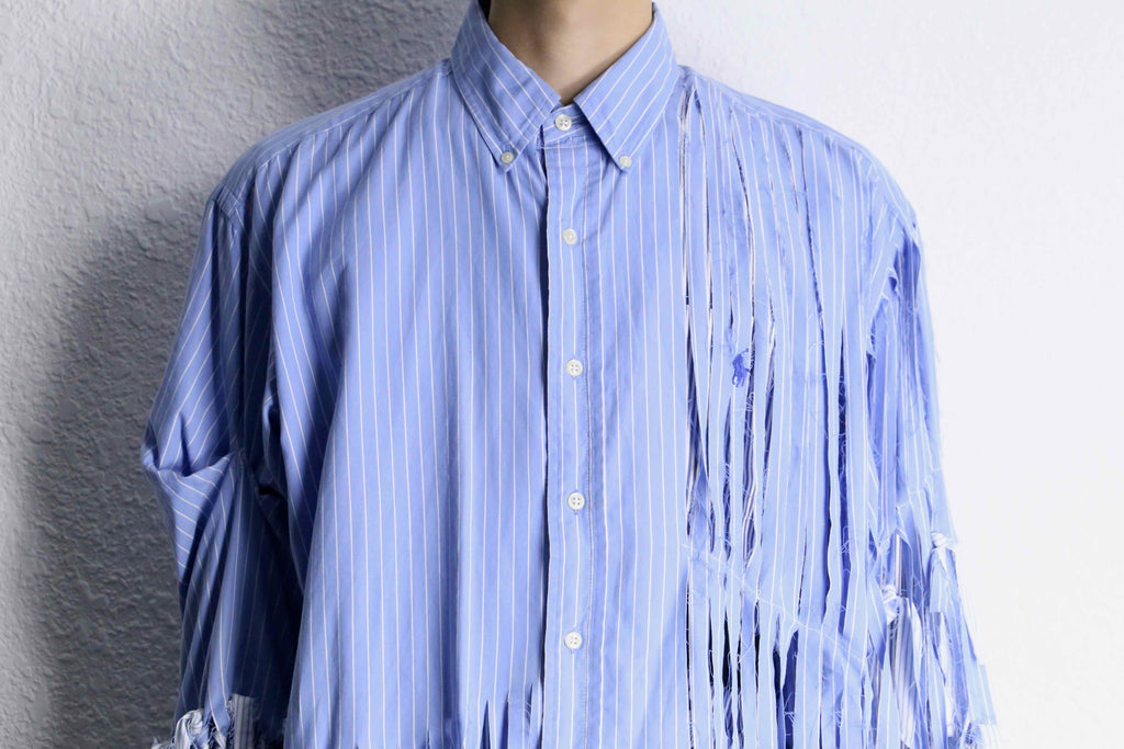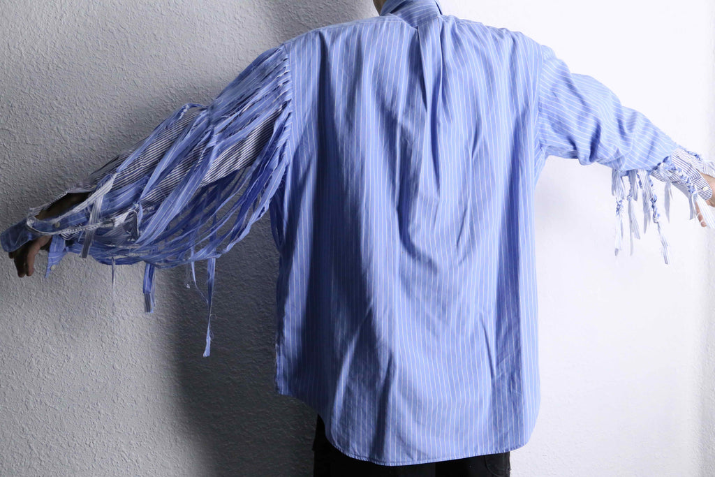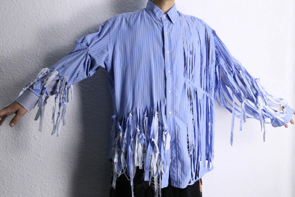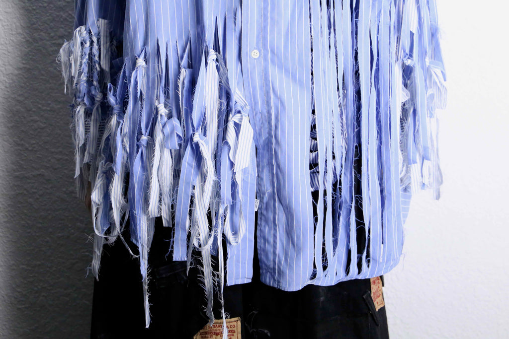 美しいストライプのシャツを2着使用し、デストロイ加工に更なるデザインを加え、「シュレッダー」をモチーフとして再構築した1着。