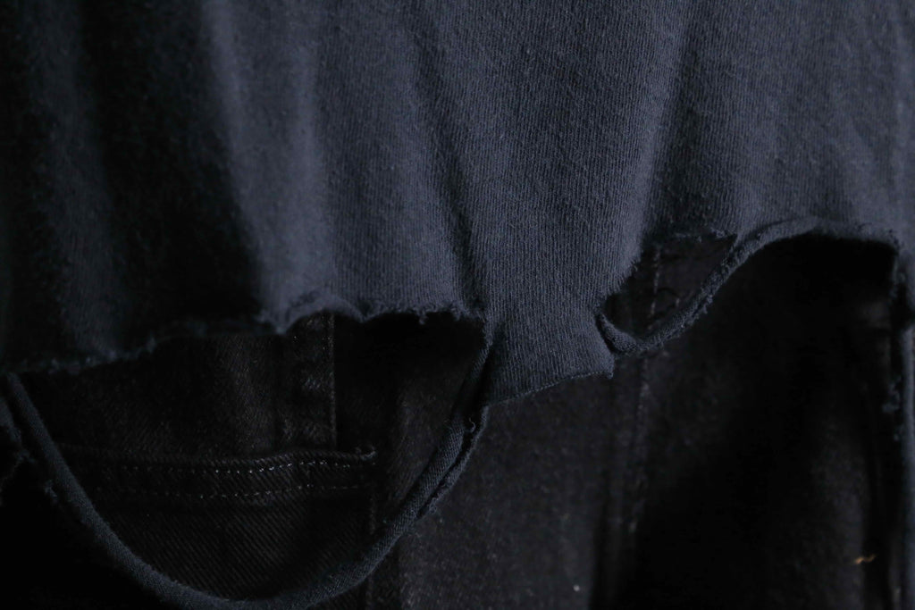 かなり大胆に施されたダメージの数々。一枚では勿論のこと、セカンドスキンなどと合わせてレイヤード素材としても良い表情を見せてくれそうなアイテム。