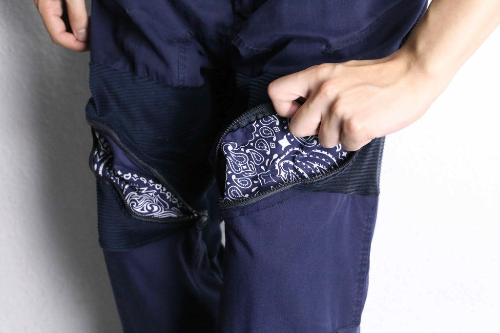 特徴的なスラントポケットや太すぎずに洒落たイージーシルエットはそのままに、同色のパンツをドッキングした作りとなっております。チャックを開くとホワイトのペイズリーがチラリと、カーゴパンツのカジュアルなイメージをがらっと変えてくれます。