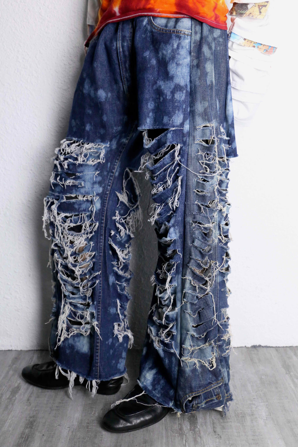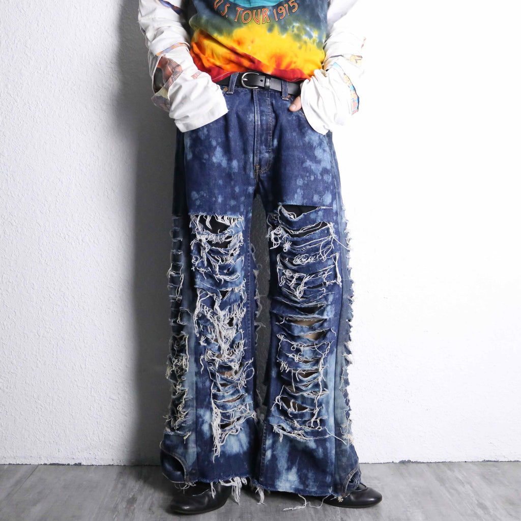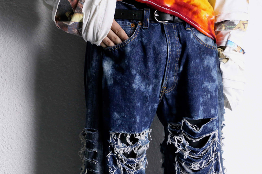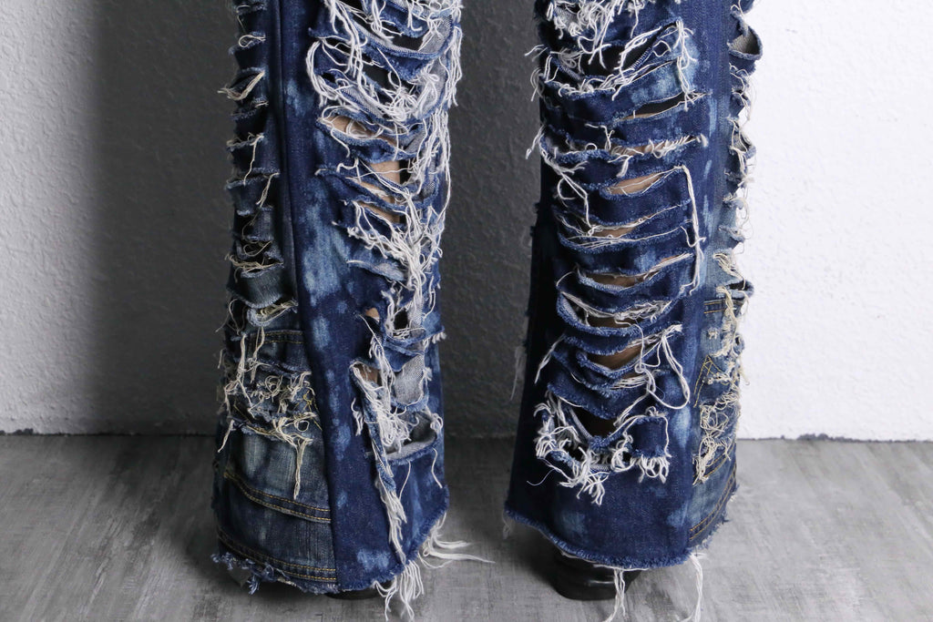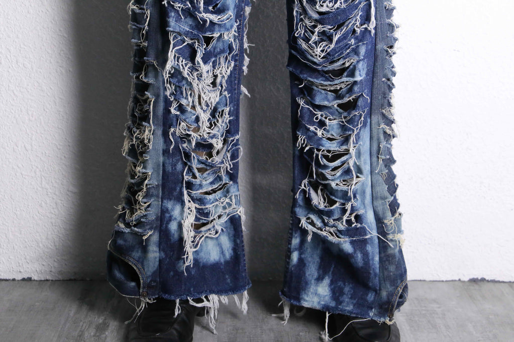当店のリメイクデニムシリーズでも初の試みとなる超絶ダメージとフレアのシルエットが美しいリメイクデニムが入荷。