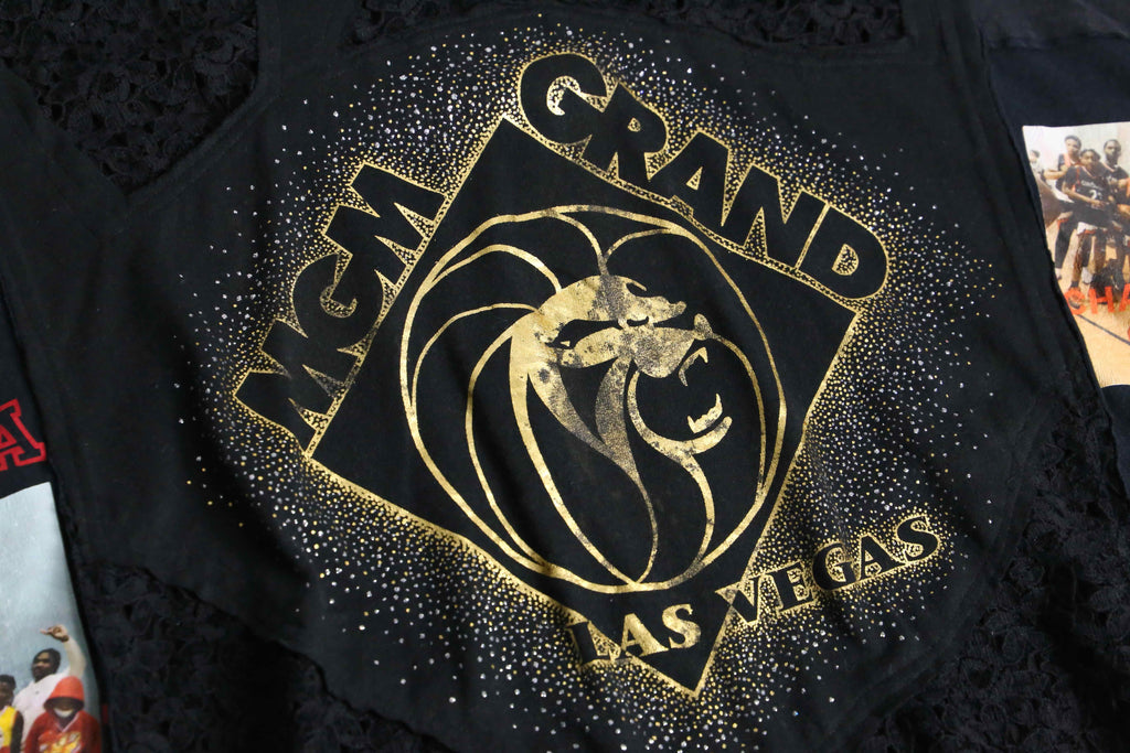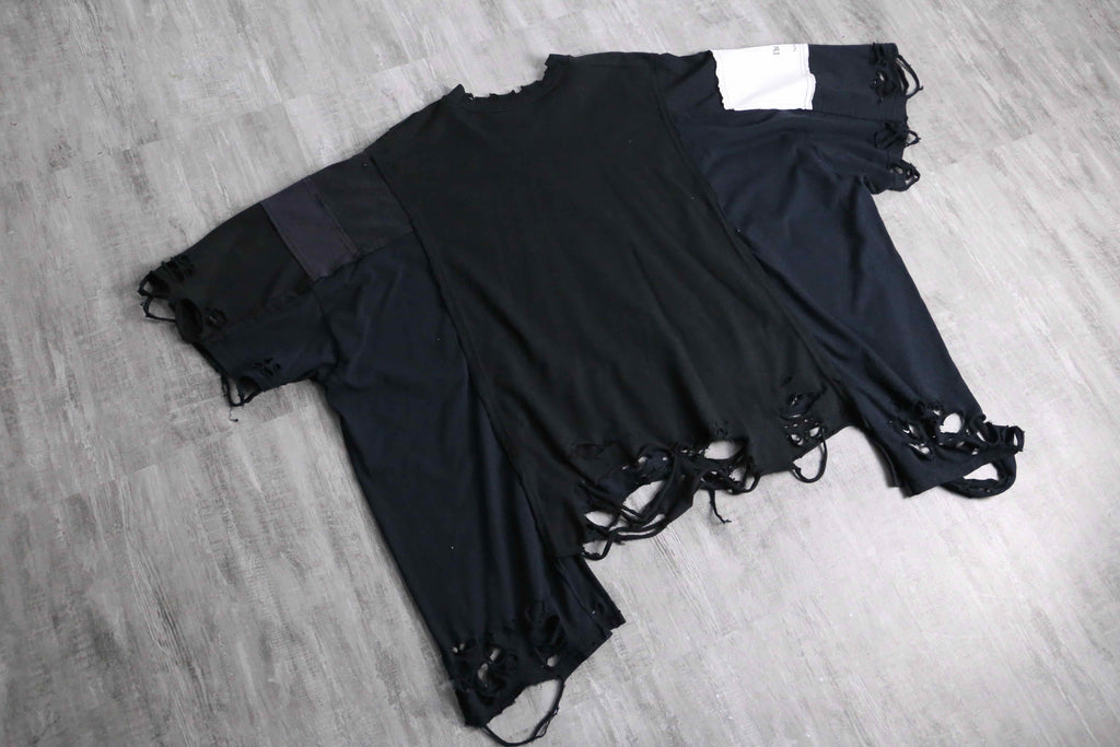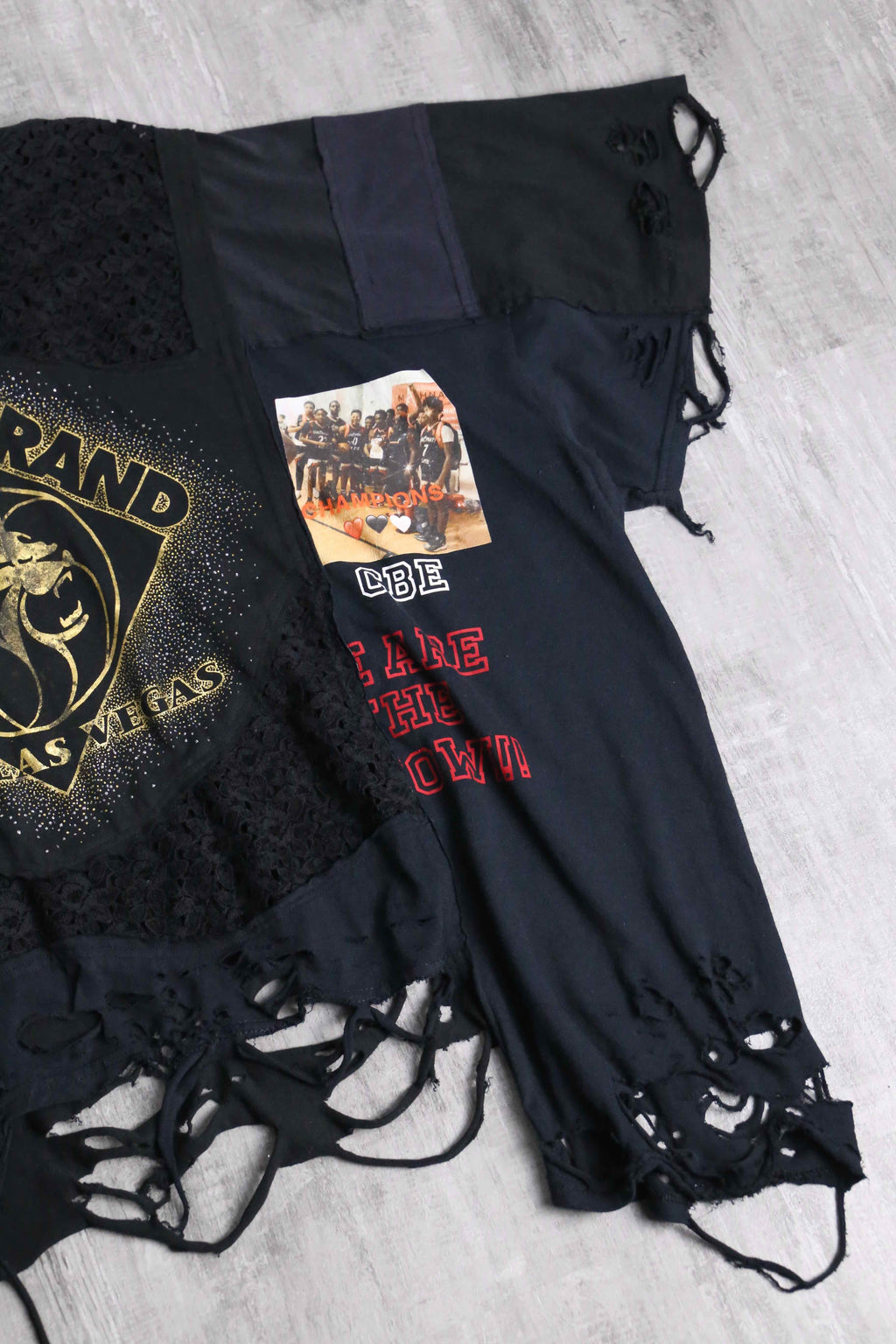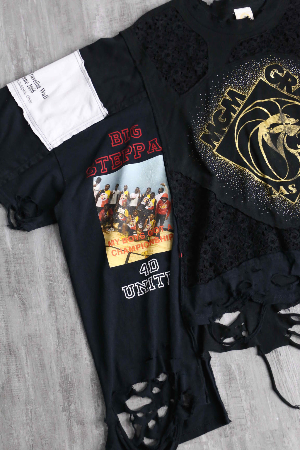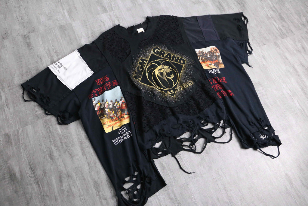 複数のTeeを解体し、再構築。異なるプリントや素材をパッチワークのように組み合わせています。身幅もリメイクならではの広さ。所々にレースがいるため、ストリート過ぎず、ガーリーやカジュアルにも着こなせられます。