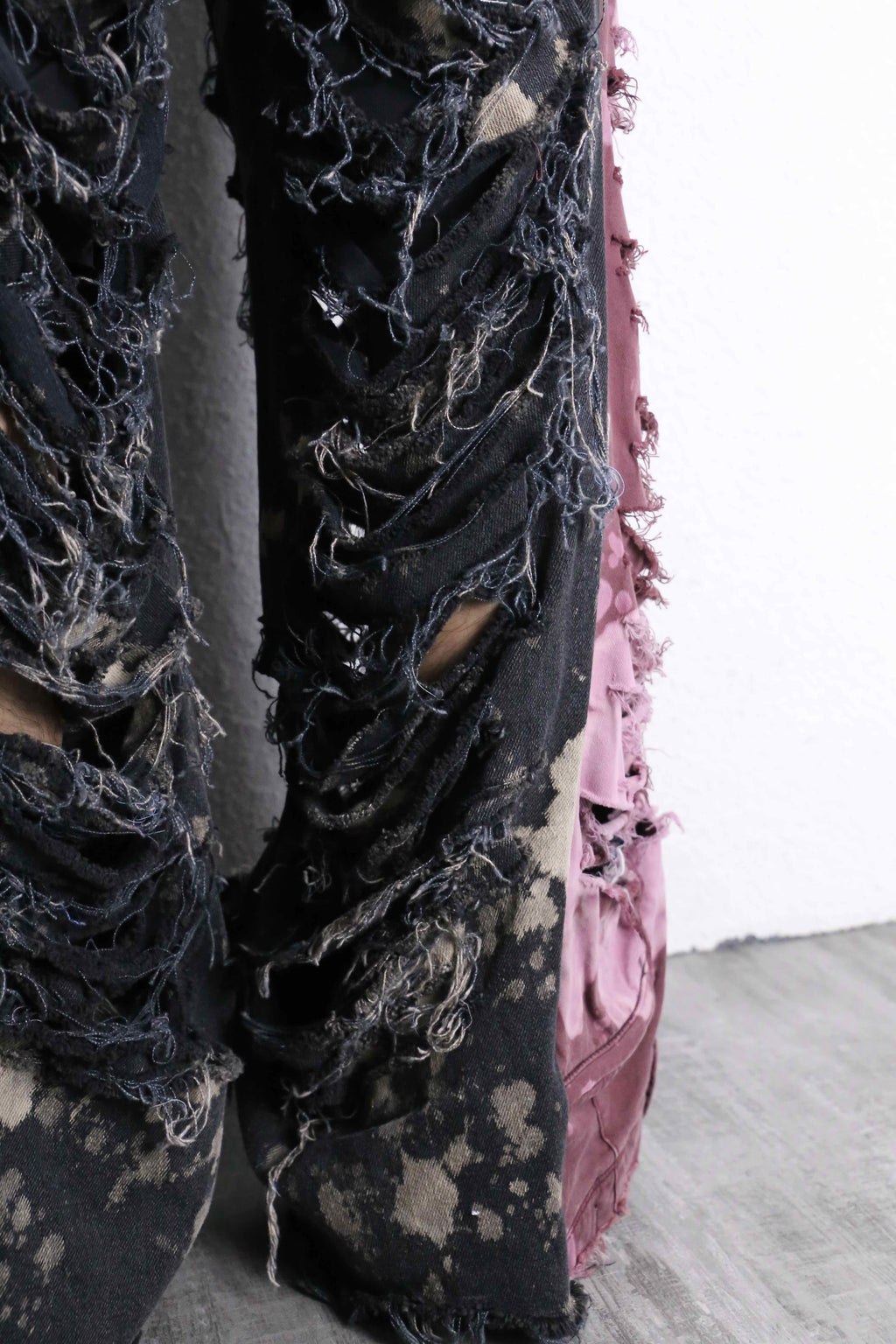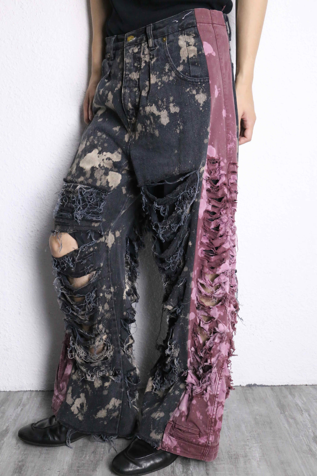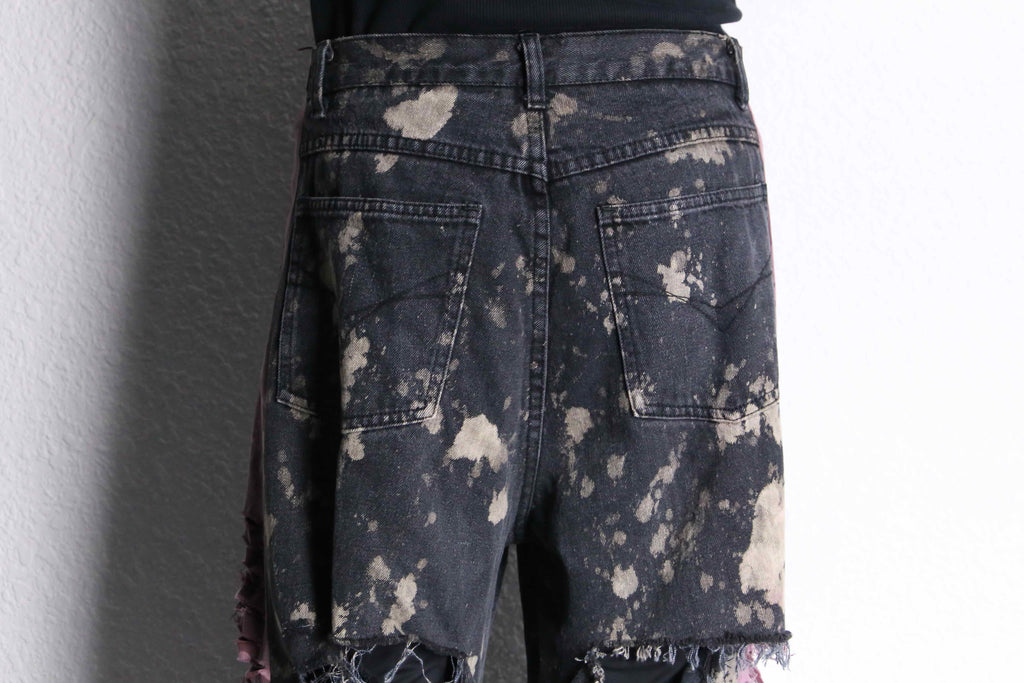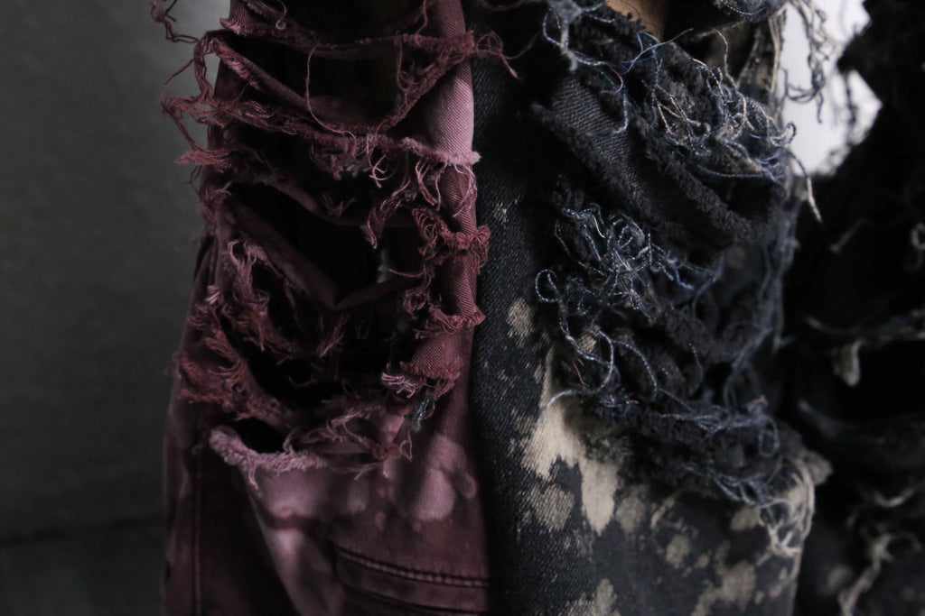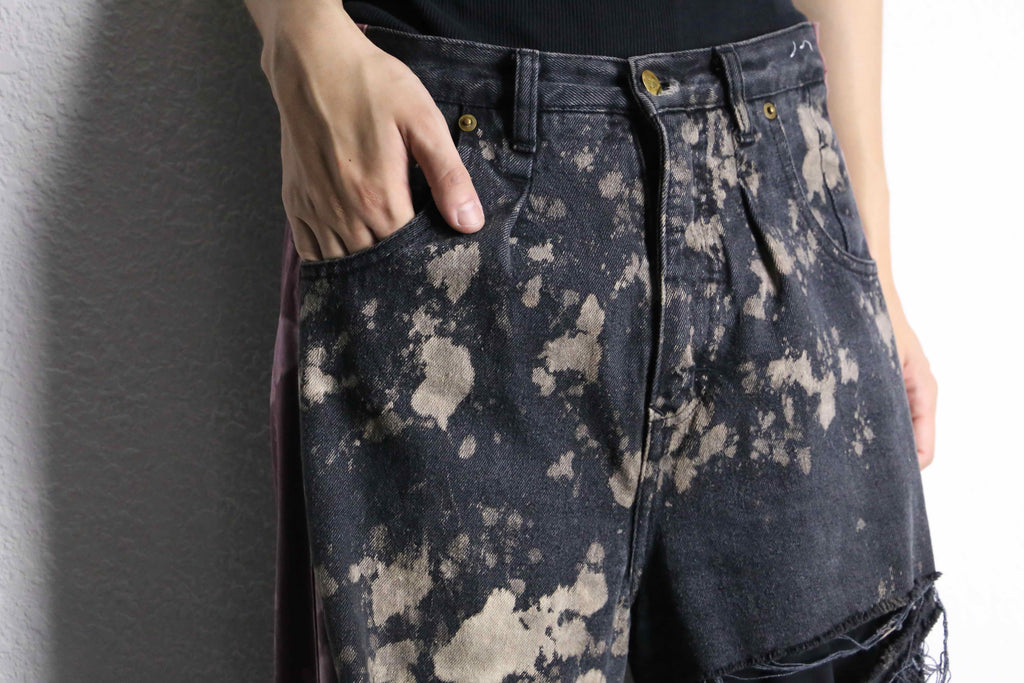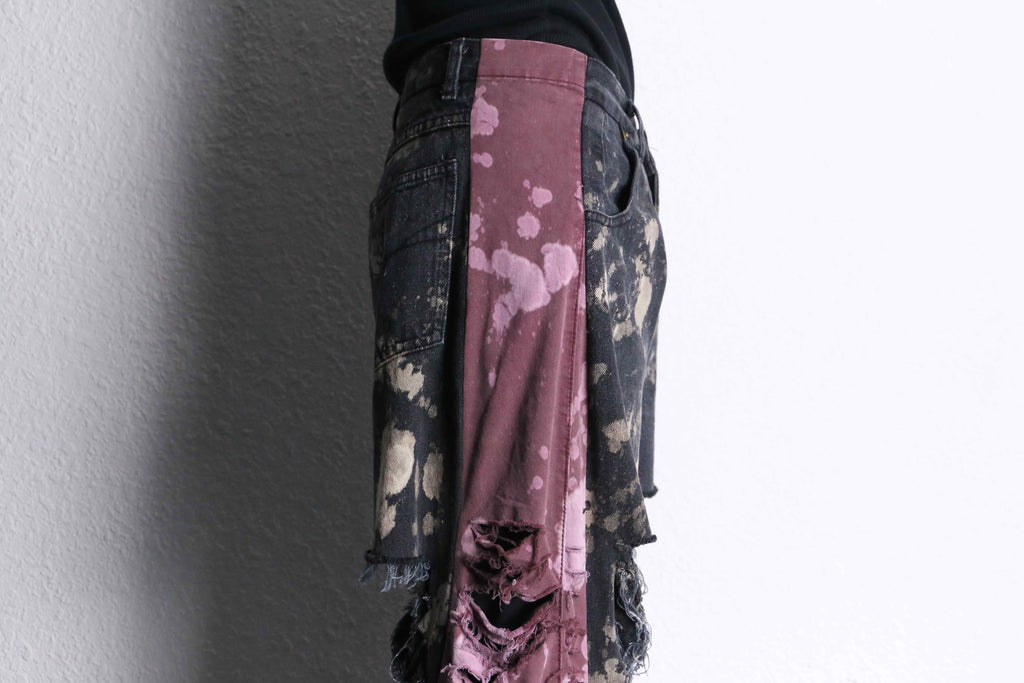 黒ベースのデニムにブリーチ加工を施し、全体的に斑点のような個性的なデザイン。そしてなんといってもこのダメージ。太ももからすねにかけて大きく裂けたダメージが存在感を演出。ダメージの部分には糸が長めに残されてあり、フリンジのような動きがある表情を生み出してくれます。両サイドには差し色のピンクのデニムがドッキングされているのも特徴の一つです。