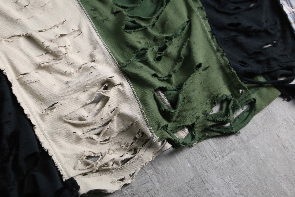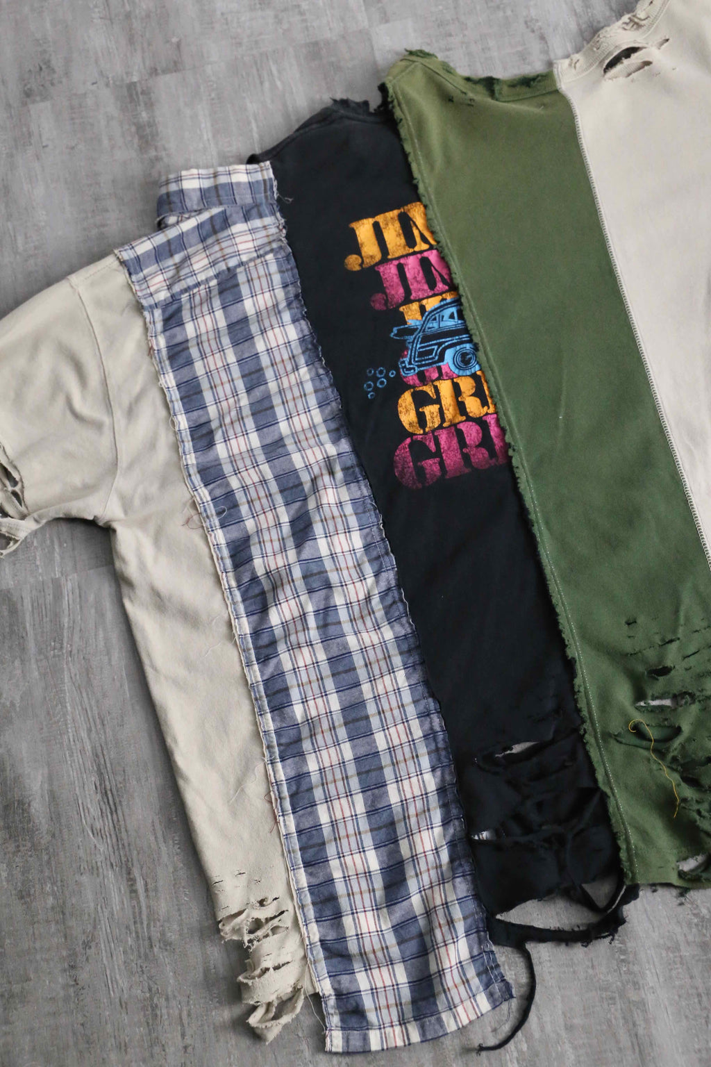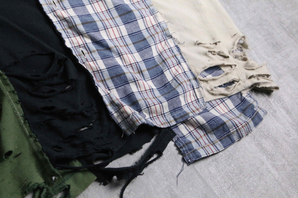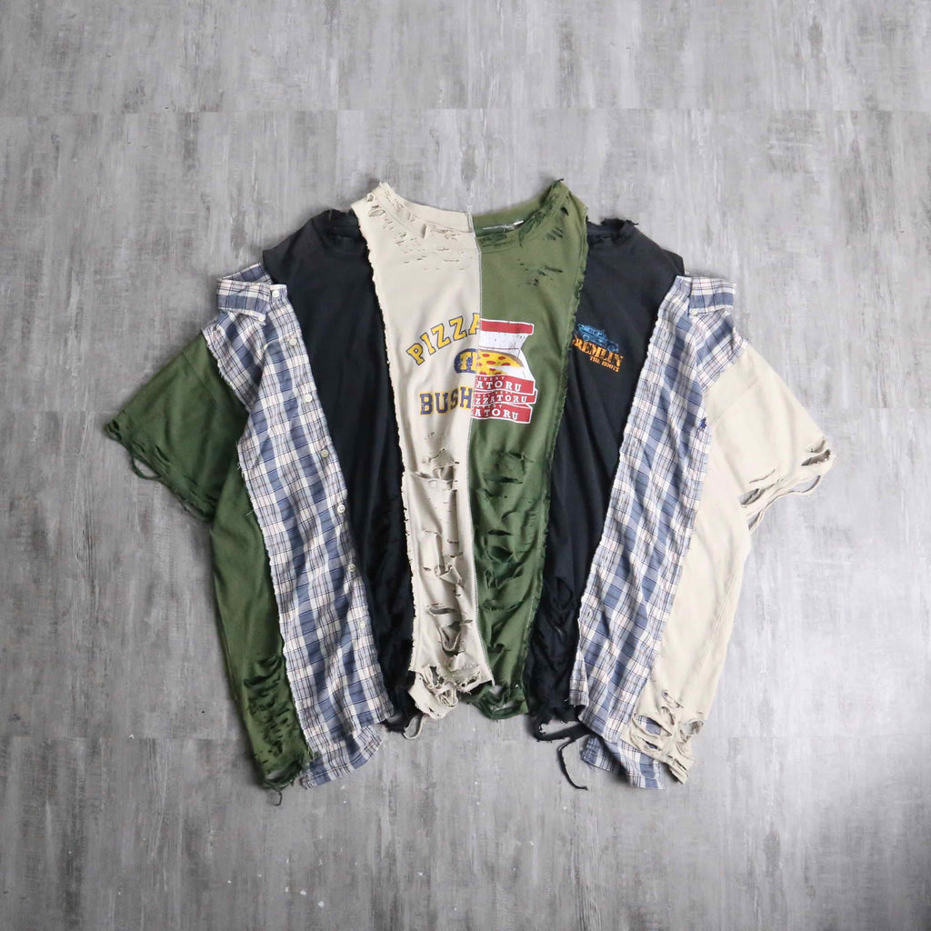 落ち着いた色味のTシャツ3種とチェックシャツを分解、再構築したスペシャルピースとなります。それぞれのトップスのネック部分を残す事で、チラッと肌やインナーを見せられる仕様に。