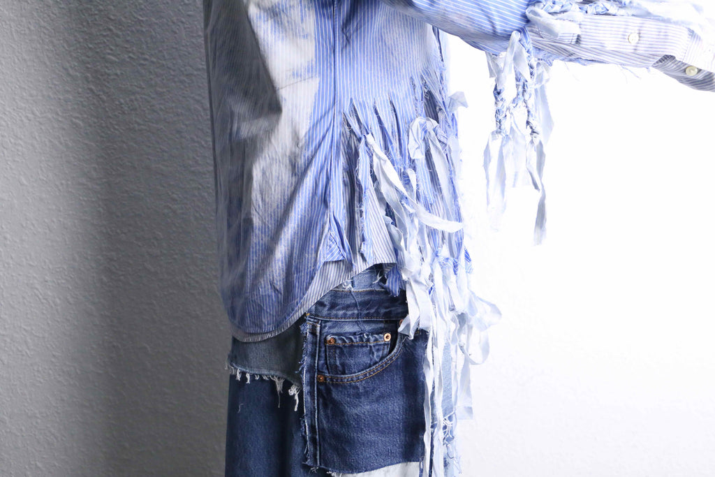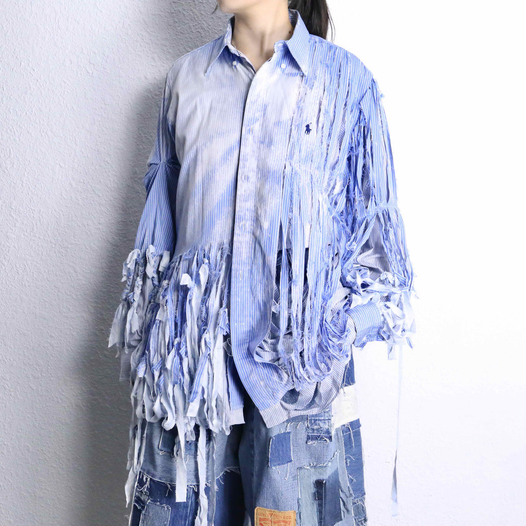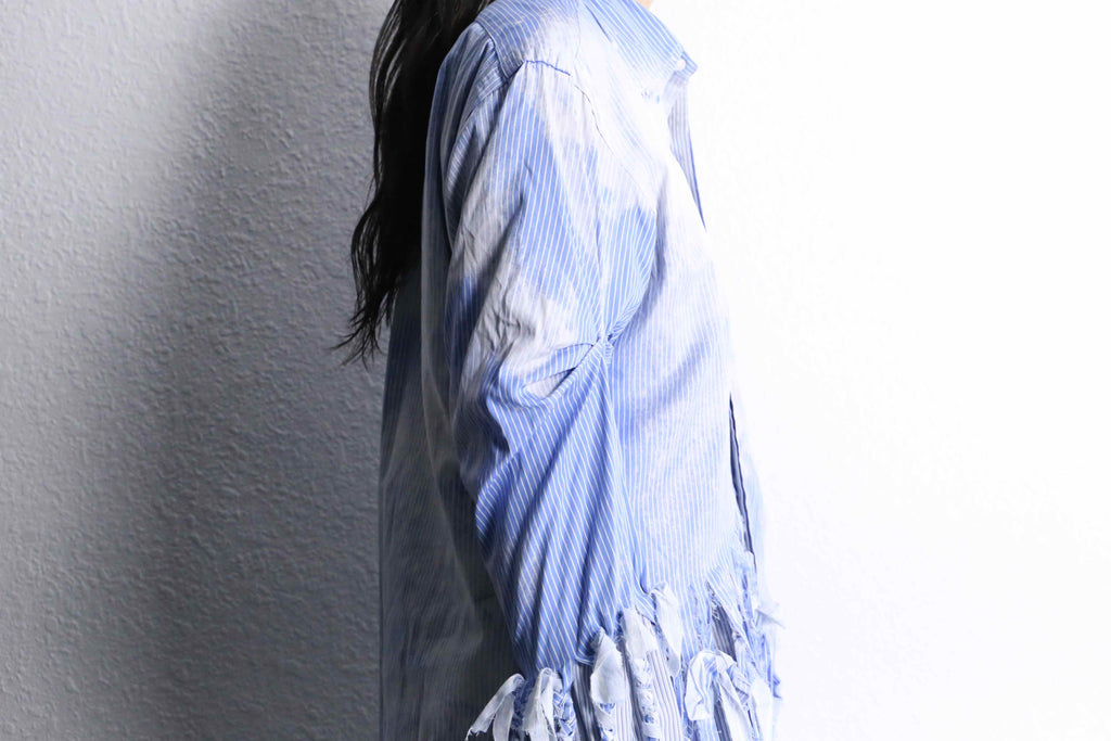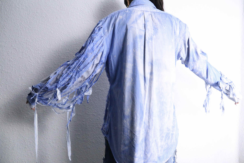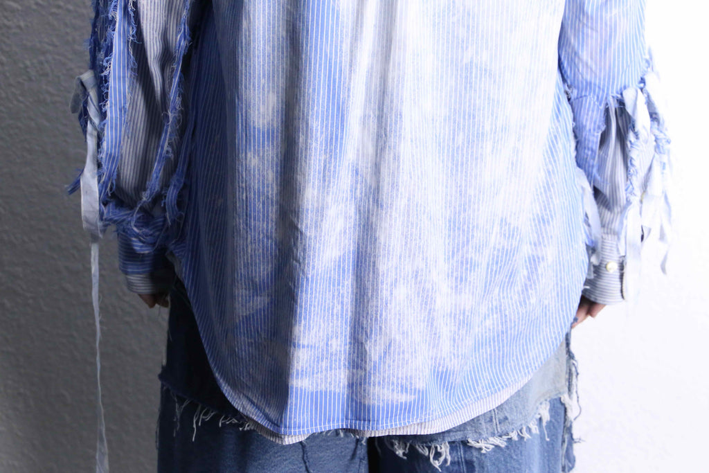 ブルーのストライプシャツを2着使用し、ダメージとブリーチを上から施した「シュレッダー」をモチーフにした個性的な一着。上質なシャツを使用して仕立てているため、スタイリング次第で幅広いシーンに活躍するでしょう。