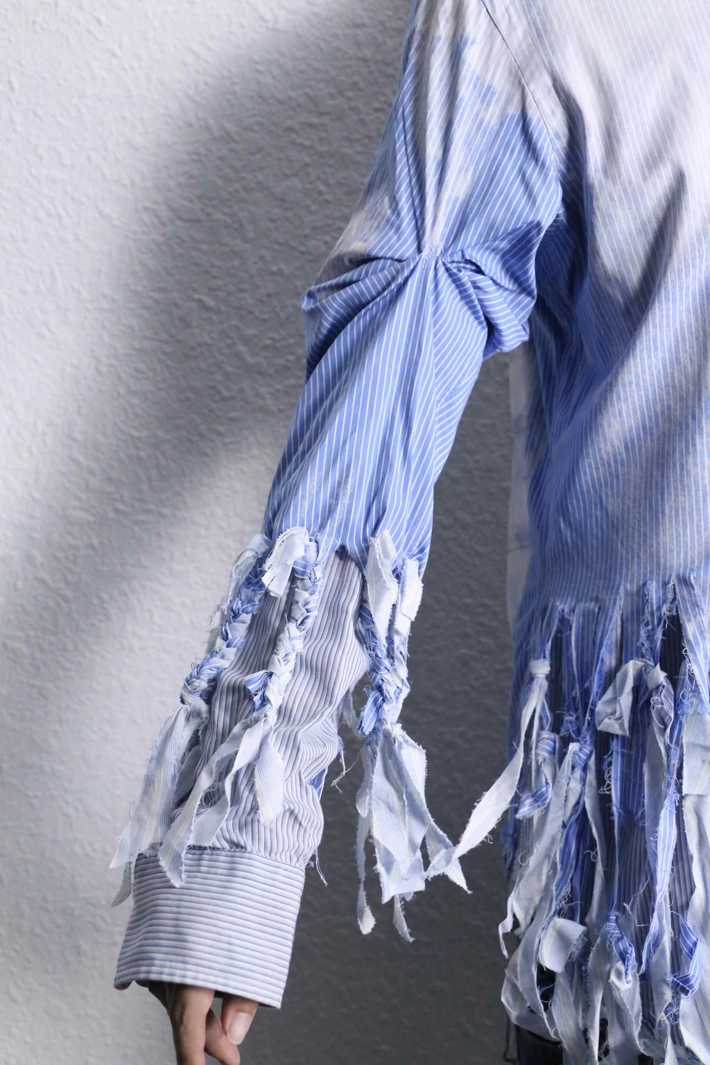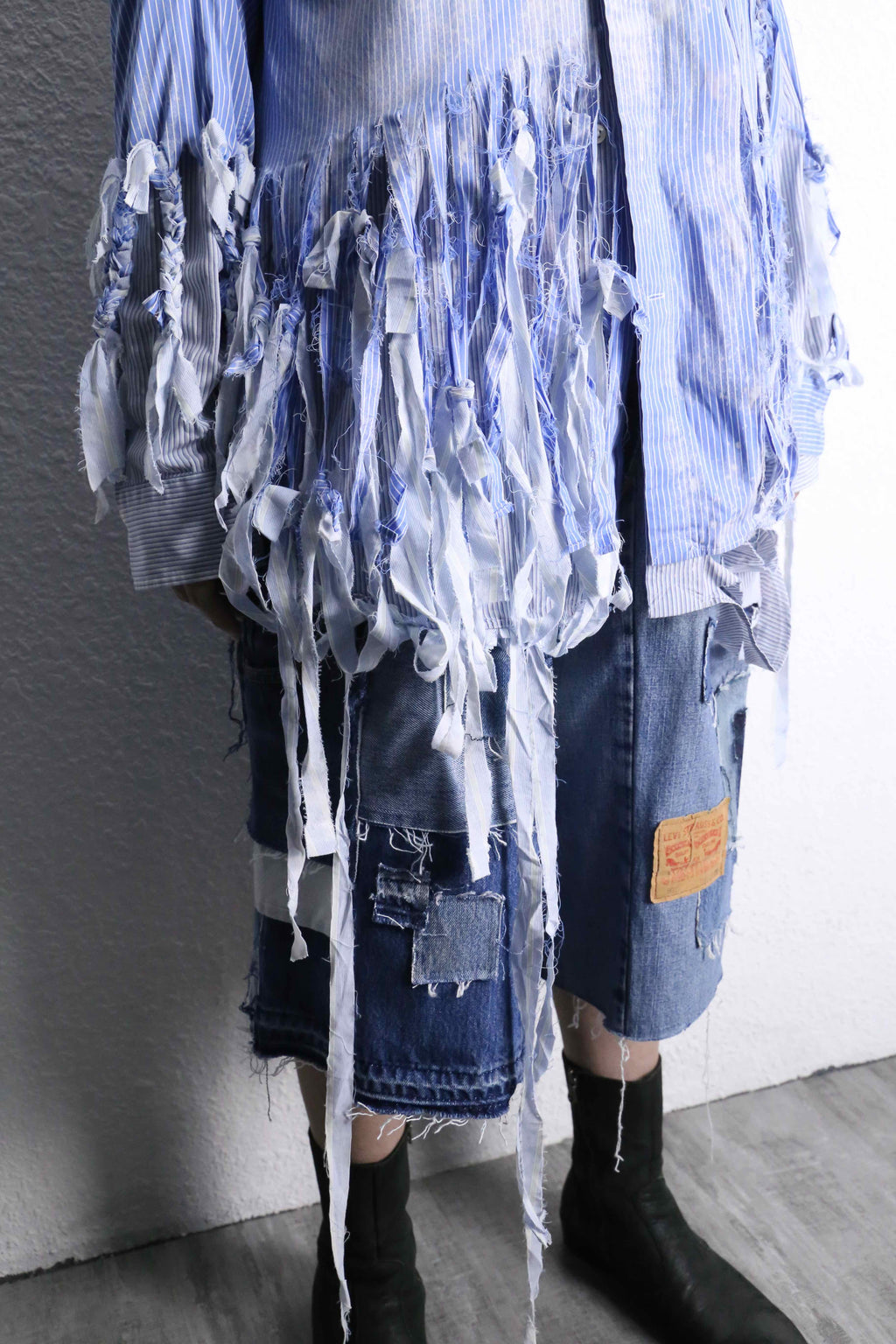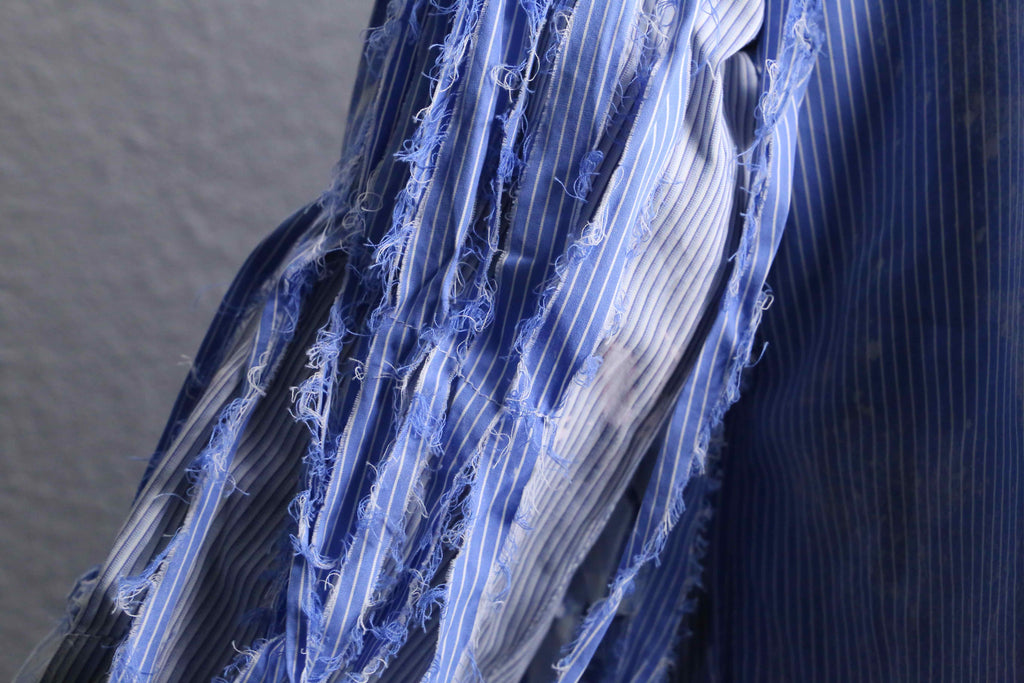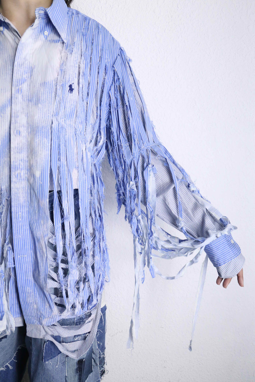 ブルーのストライプシャツを2着使用し、ダメージとブリーチを上から施した「シュレッダー」をモチーフにした個性的な一着。上質なシャツを使用して仕立てているため、スタイリング次第で幅広いシーンに活躍するでしょう。