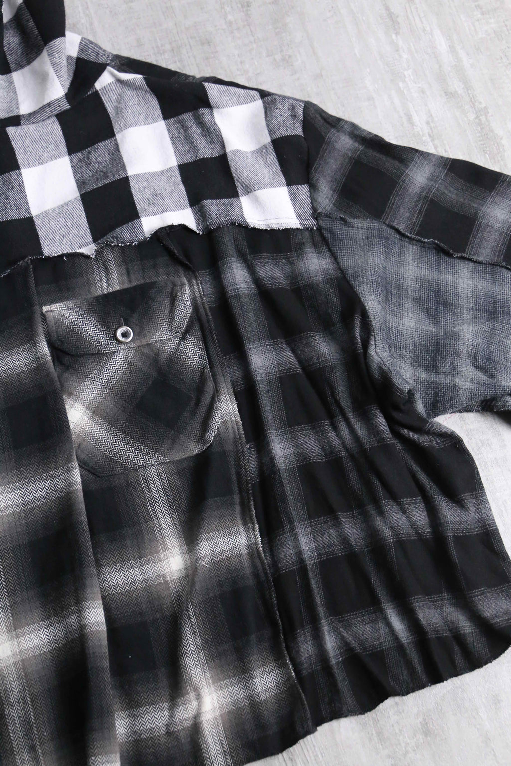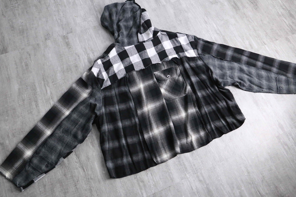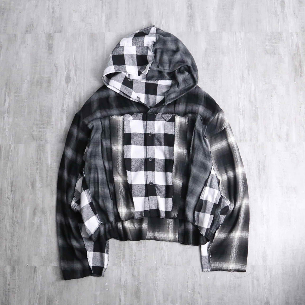 当店自慢のリメイクシリーズから、モノクロのドッキングシャツフーディーの入荷。