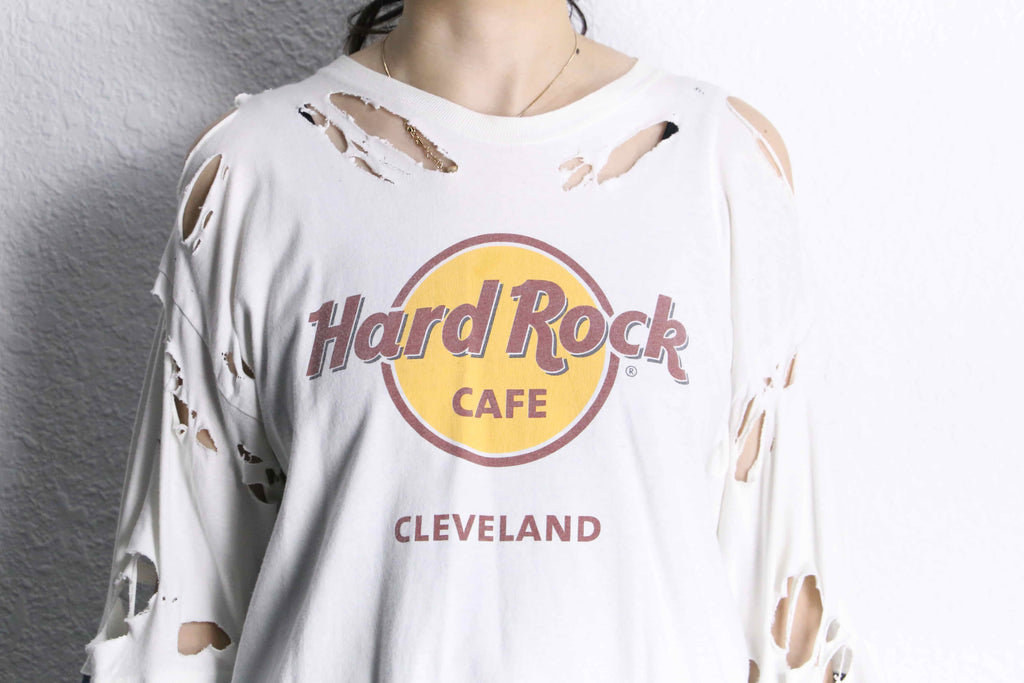 Hard Rock Cafe CLEVELAND のロゴが入ったロングスリーブTシャツを大胆にリメイクした、インパクト抜群のアイテムがオンラインに入荷。