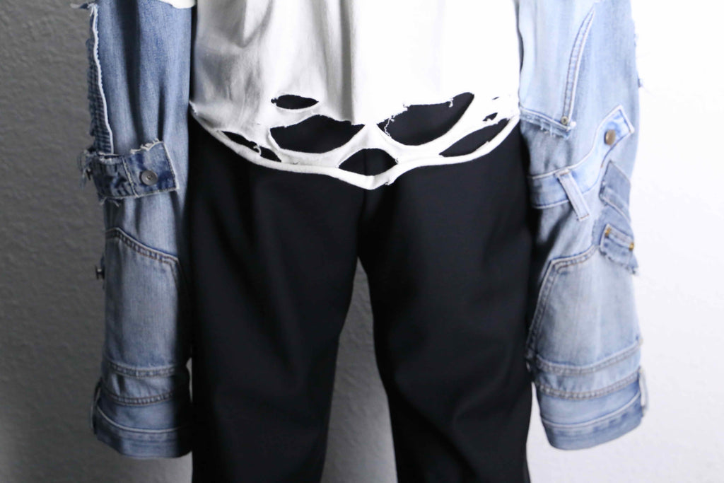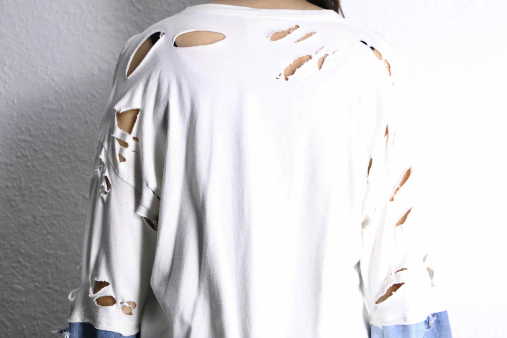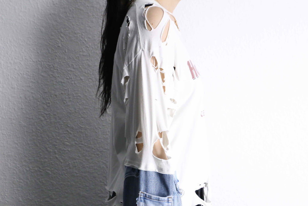 白ボディにプリントされたおなじみのロゴはそのままに、全体にクラッシュやカット加工を加え、古着らしい味わいとグランジ感を演出。さらに袖部分にはデニム生地を組み合わせて再構築。アームカバーのような感覚で着れるため、一枚でレイヤードできる一枚。裾のカットも独特で、重ね着しても存在感が出るシルエット。