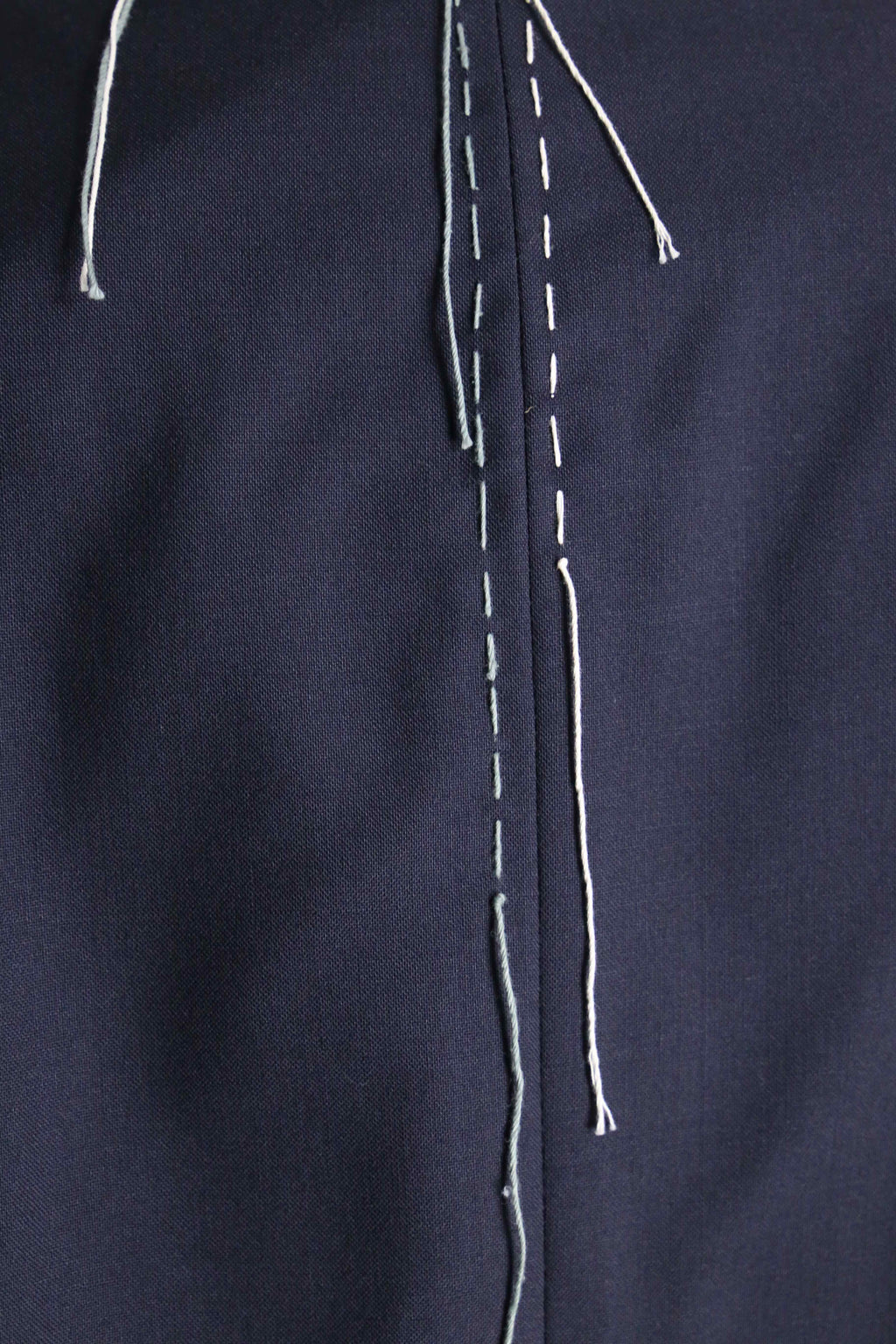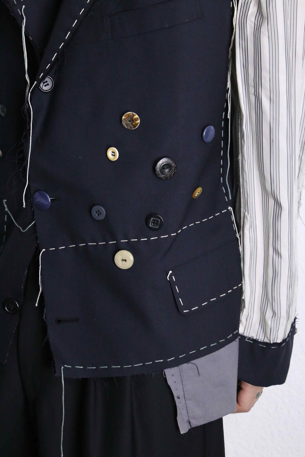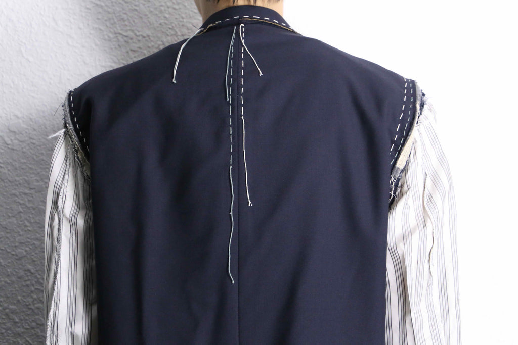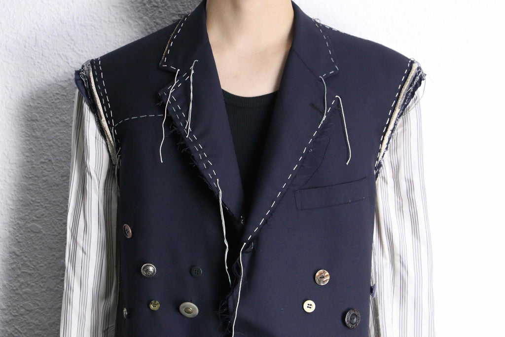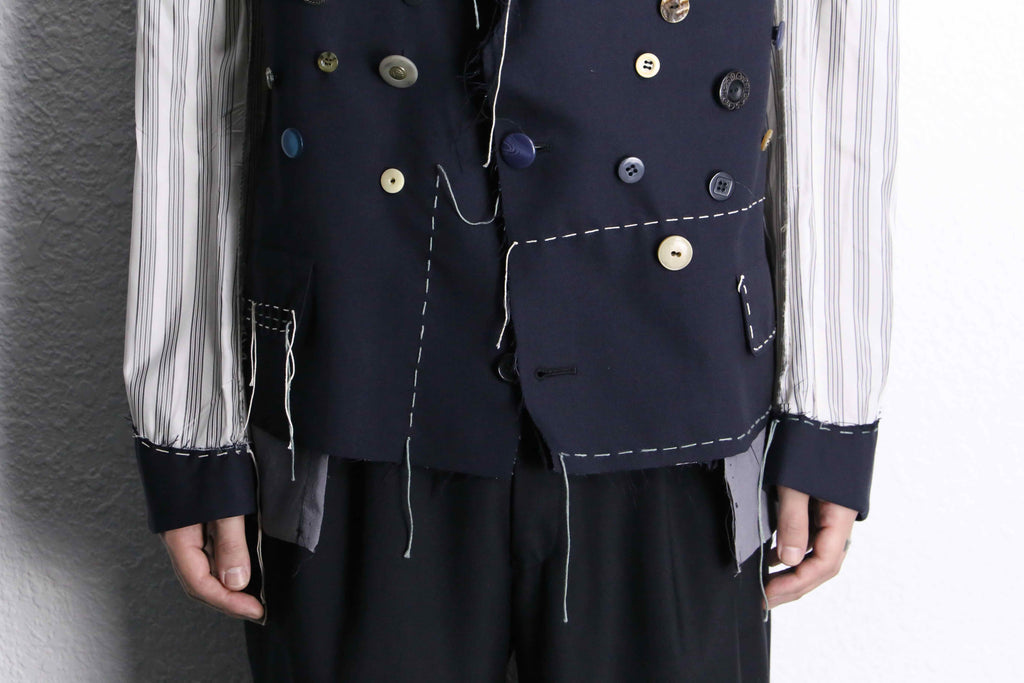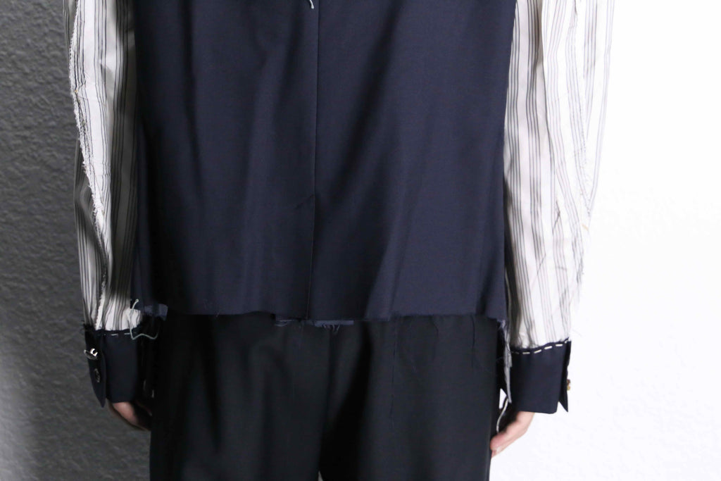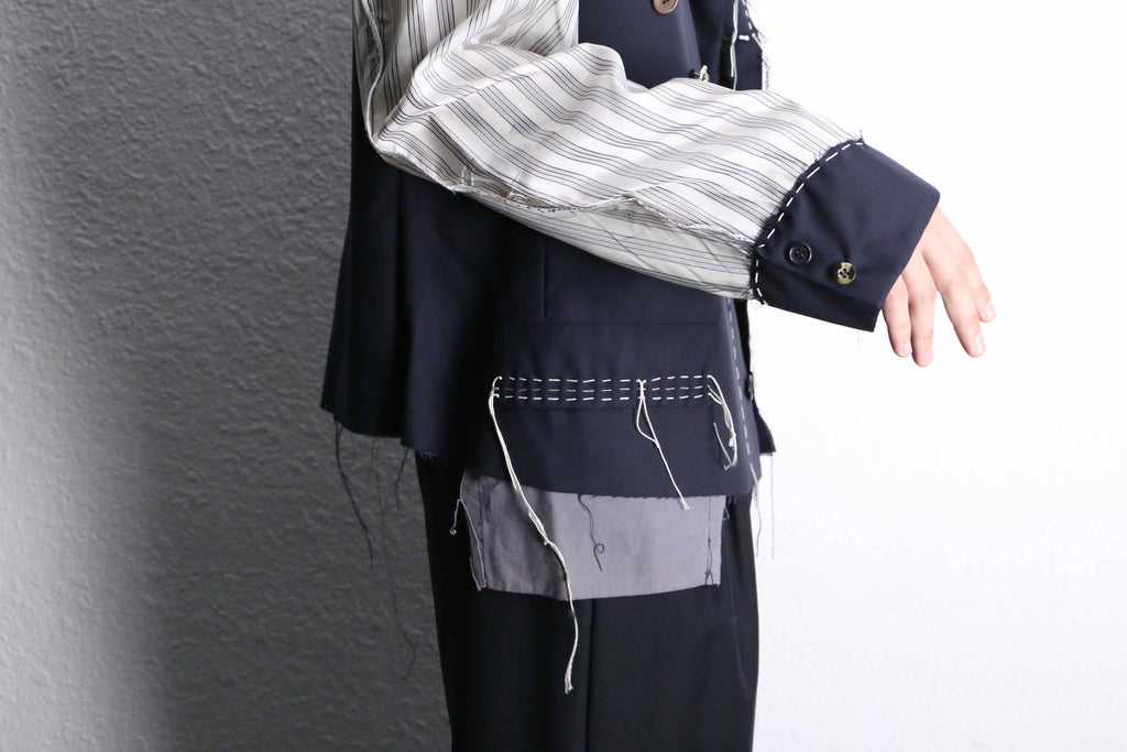 ボディと袖を別の素材にすることでテーラードなのにベストをレイヤードしているようなリメイクならではのなんとも不思議な仕上がりに。