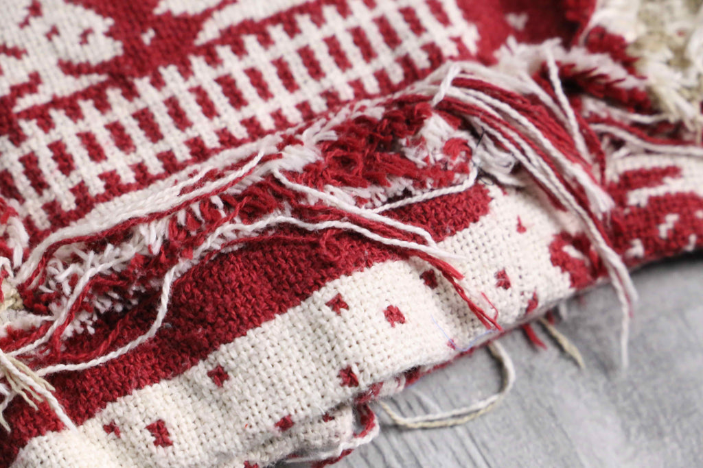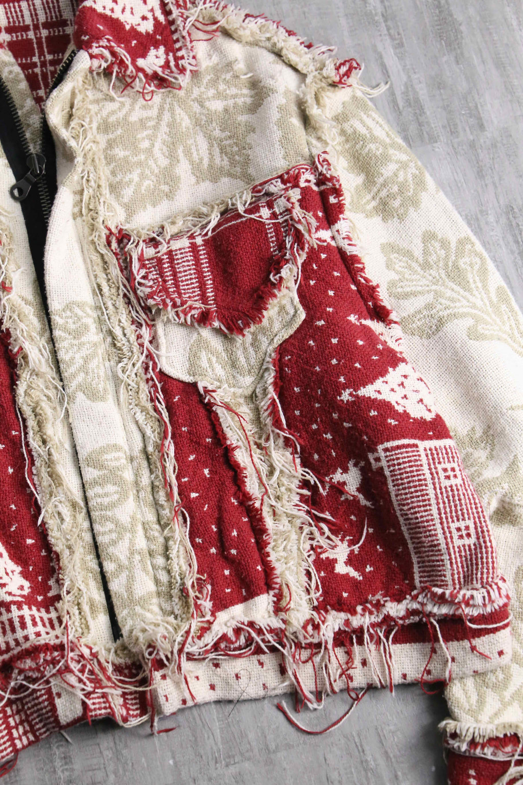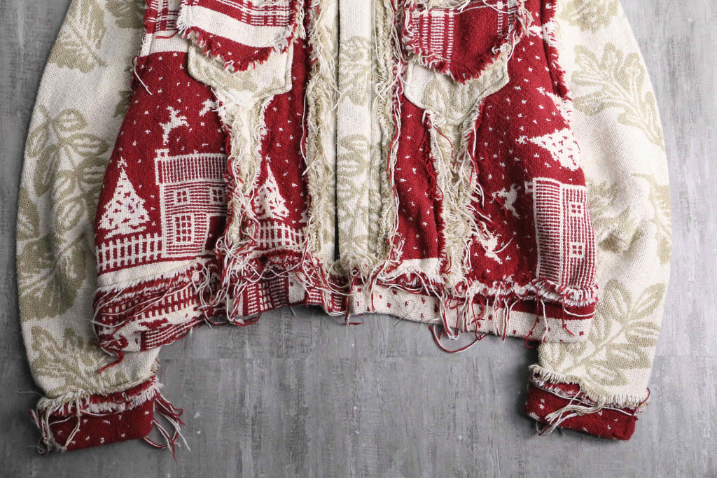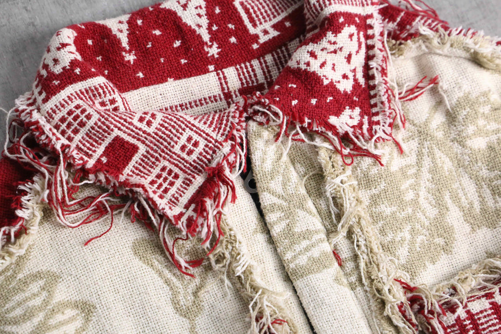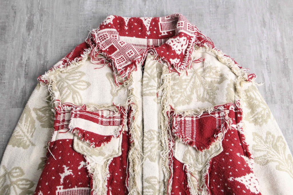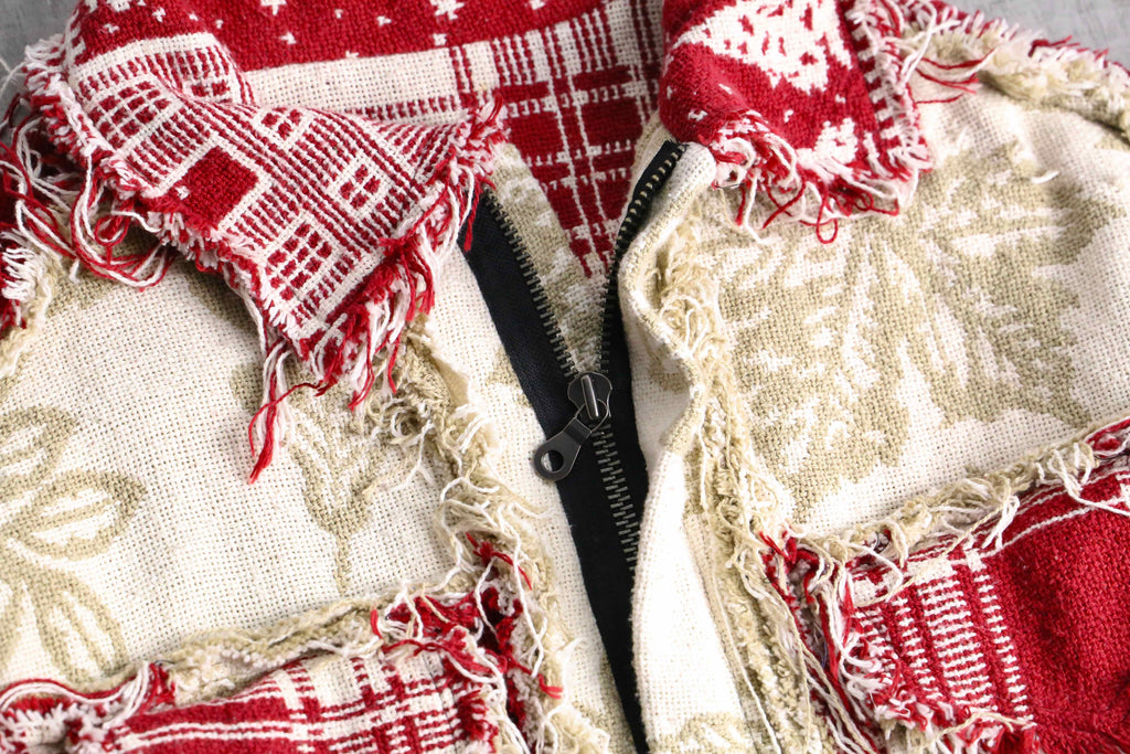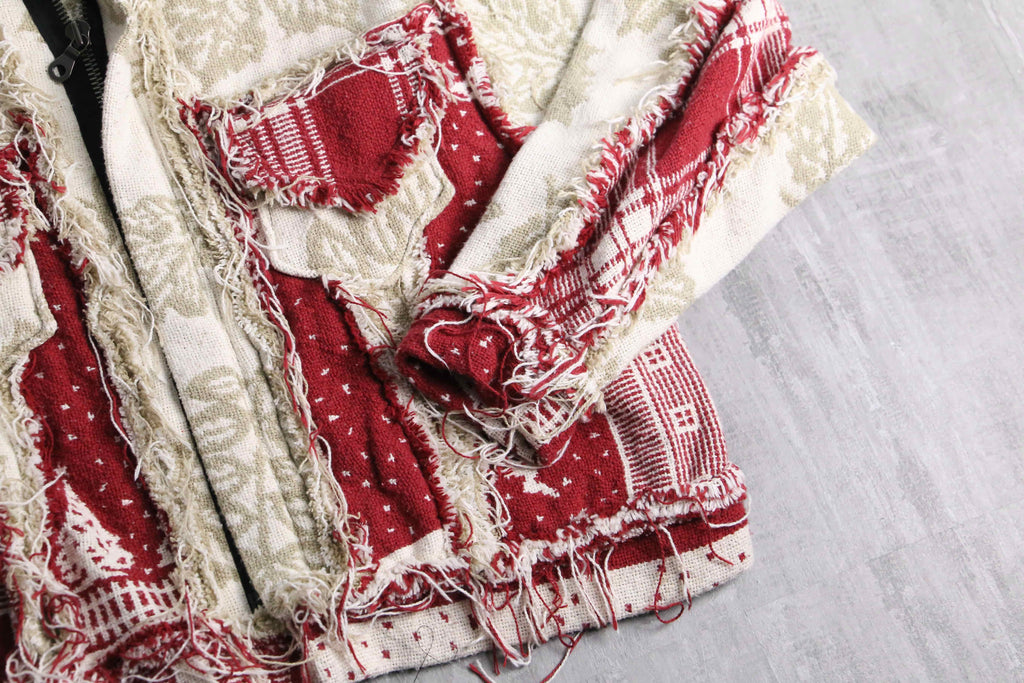 母体にはヴィンテージのラグを使用。当社の高い技術力を駆使し、トラッカージャケットにしたて上げることを可能としました。インパクト抜群のデザイン。