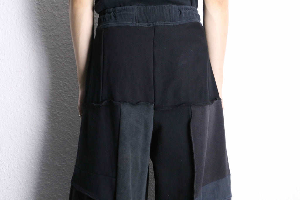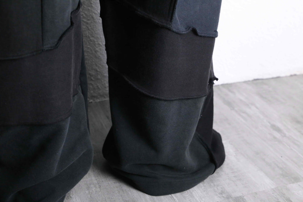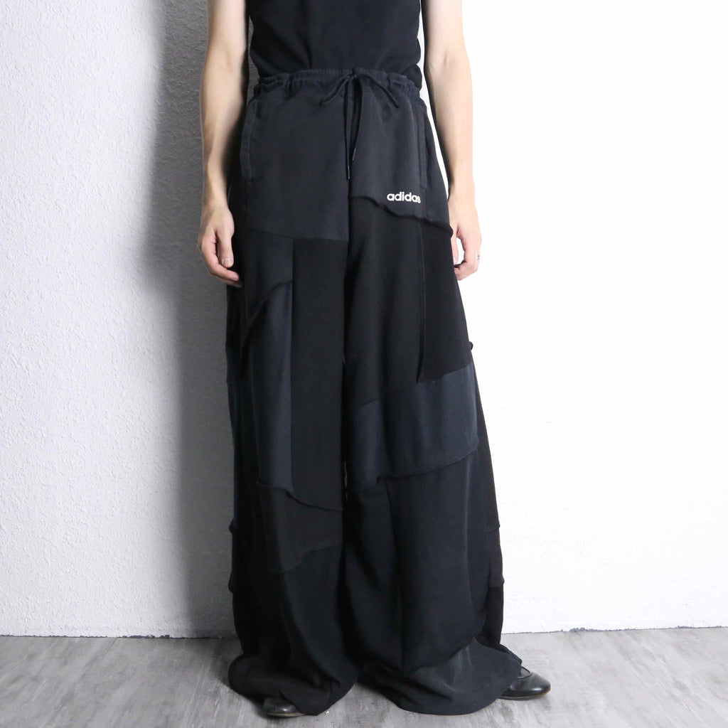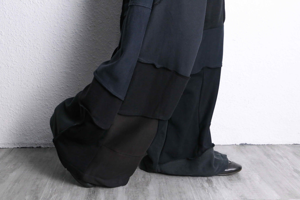 ブラックの生地を何枚も組み合わせて作られたリメイクワイドパンツがオンラインに登場。