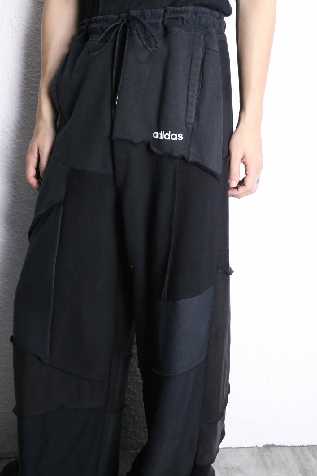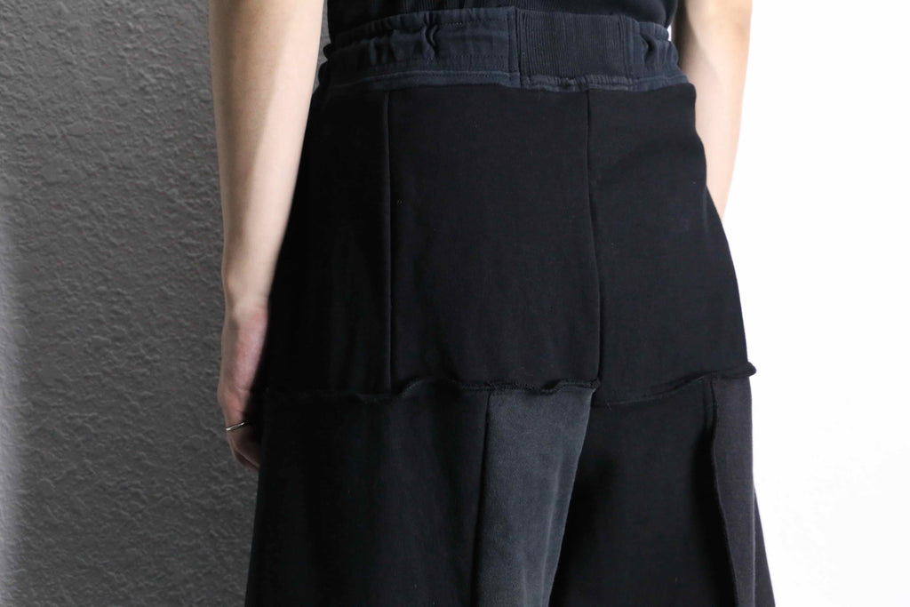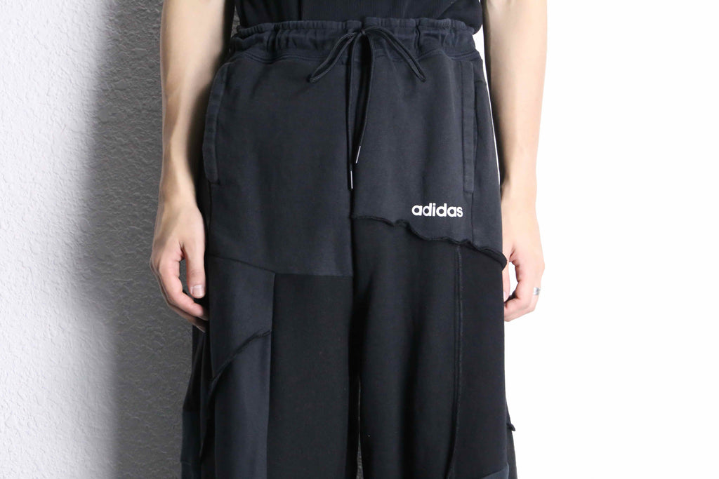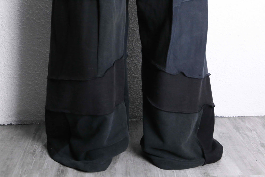 ブラックの生地を何枚も組み合わせて作られたリメイクワイドパンツがオンラインに登場。