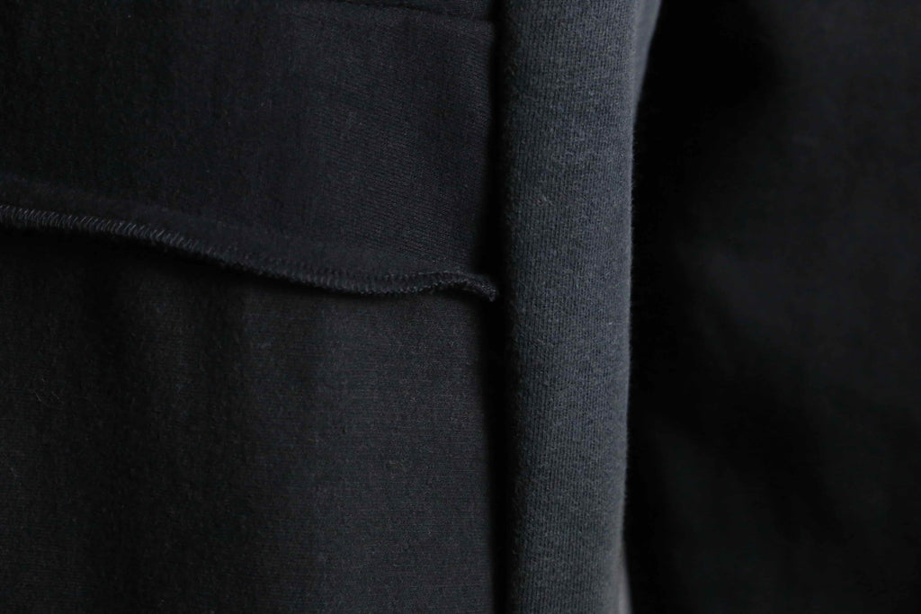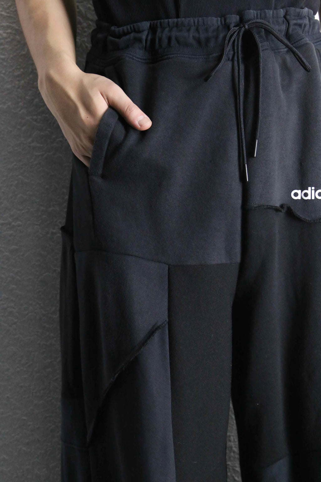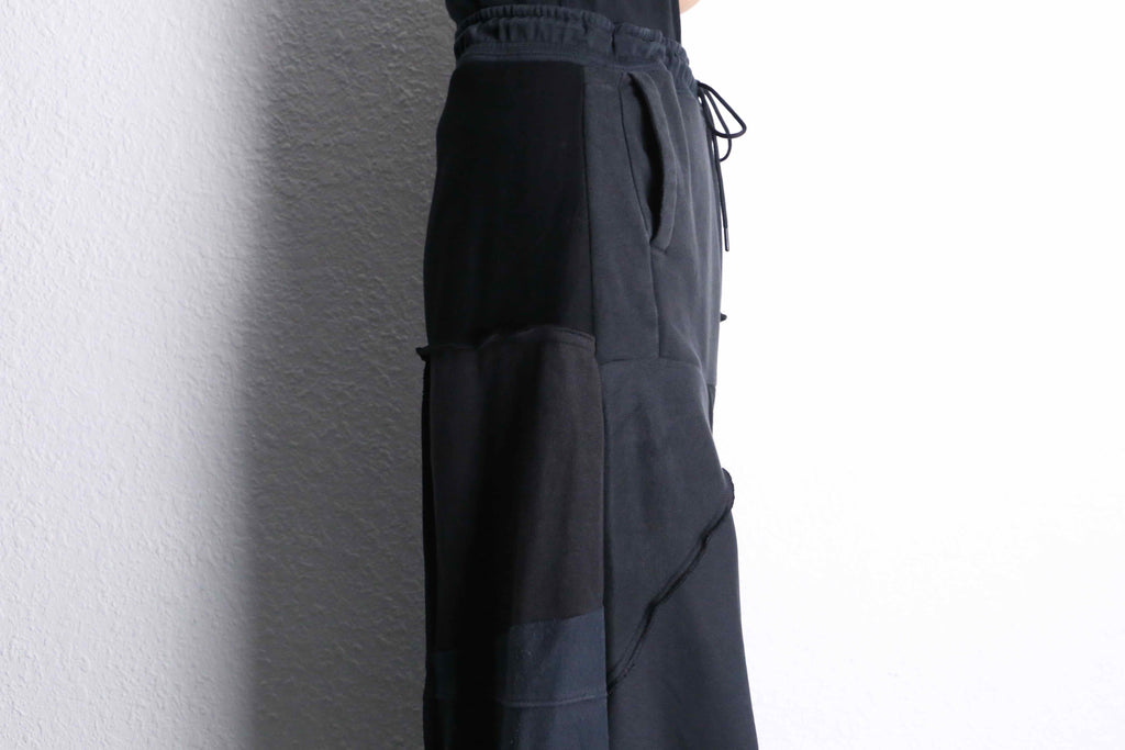 異なる素材やトーンの黒を重ねることで、動くたびに立体感が生まれるデザインになっています。ゆったりとしたシルエットで、リラックス感がありながらも存在感のある一本。ウエストは紐で調整できるので、体型やスタイルに合わせて着こなしを変えられます。
