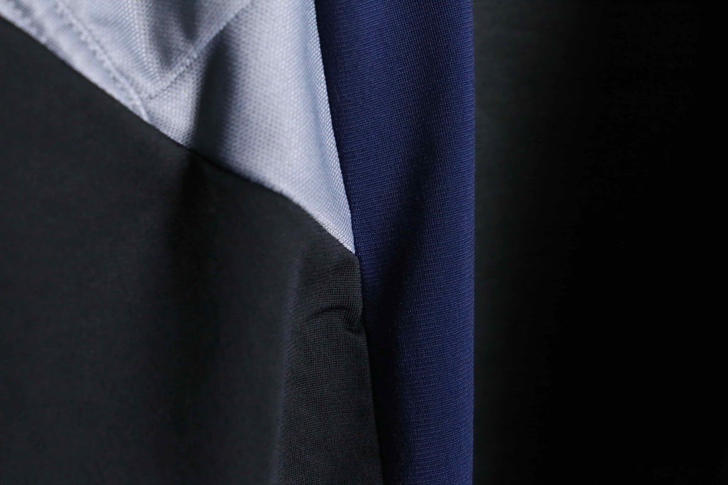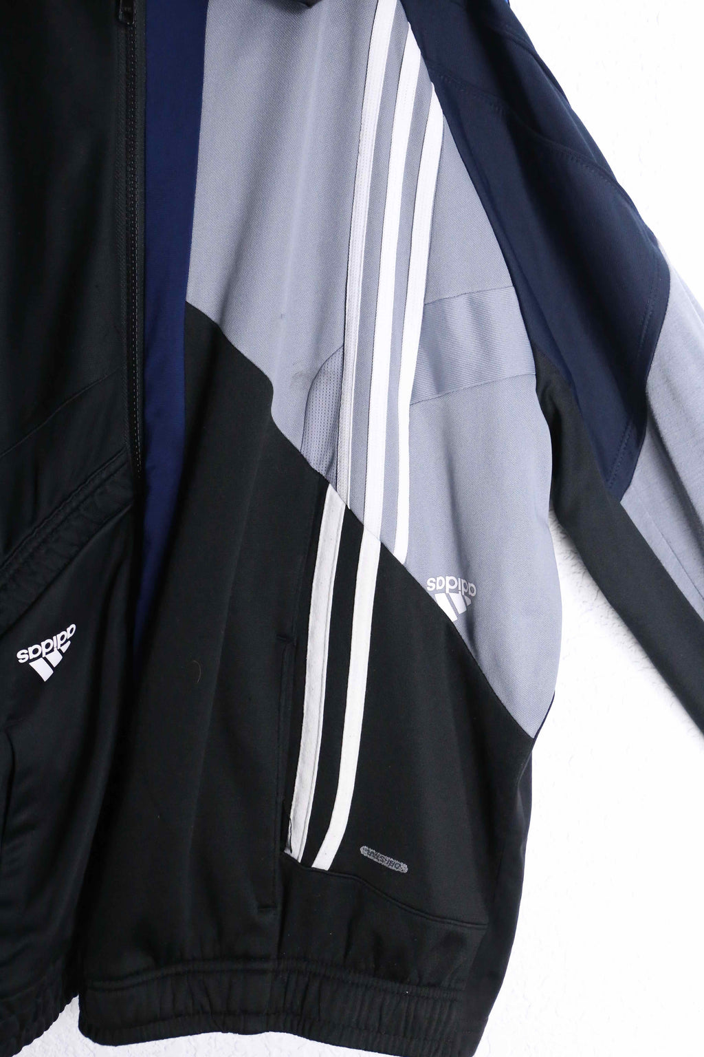 至る所にスリーラインが散りばめられたトラックを素材に使用したジップフーディーが入荷。