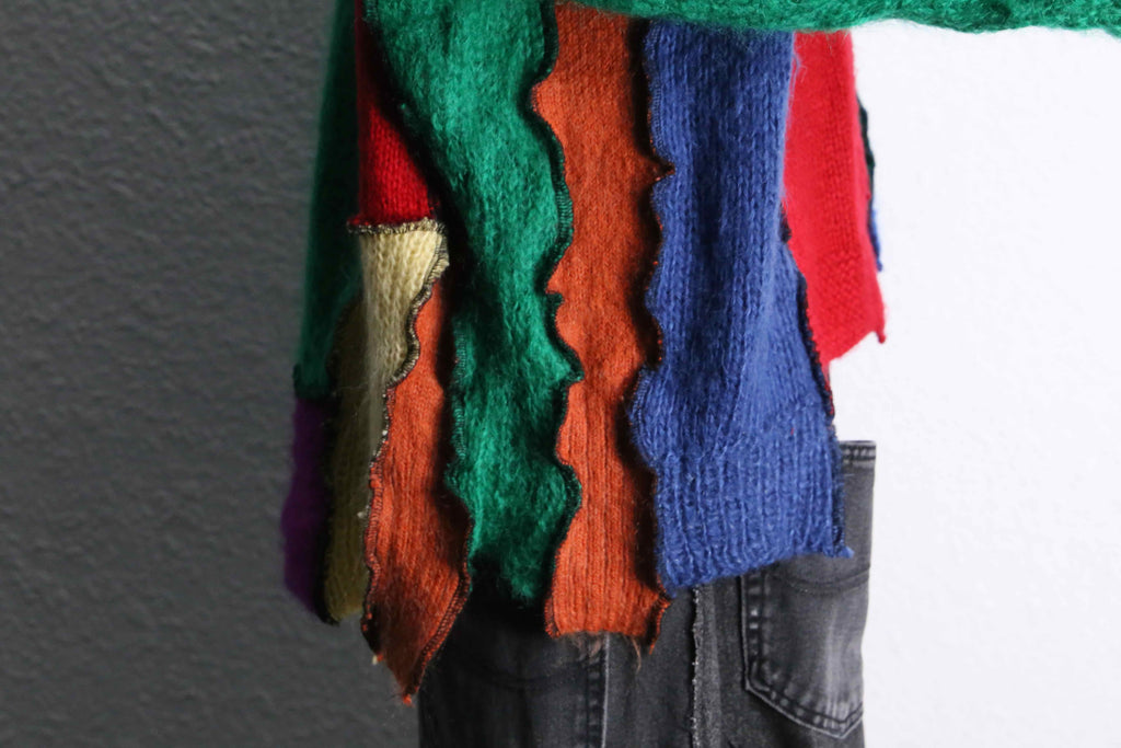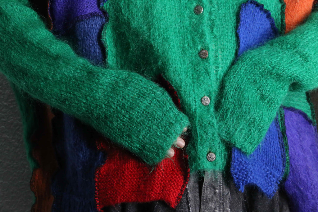 モヘア素材、様々な原色のニットをふんだんに使用。かなりカラフルな唯一無二の仕上がりに。色味が多いアイテムながらも、様々なカラーを持ってくることで不思議とまとまった印象に。