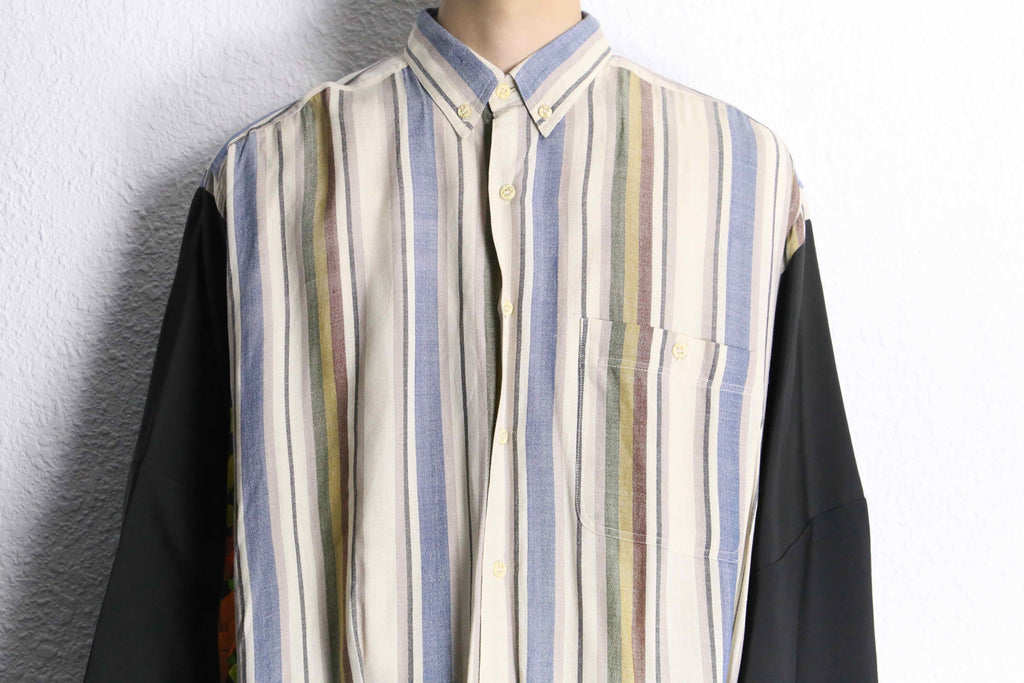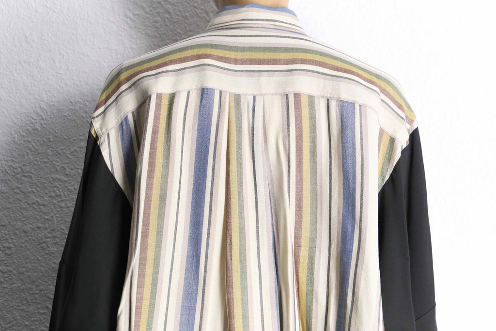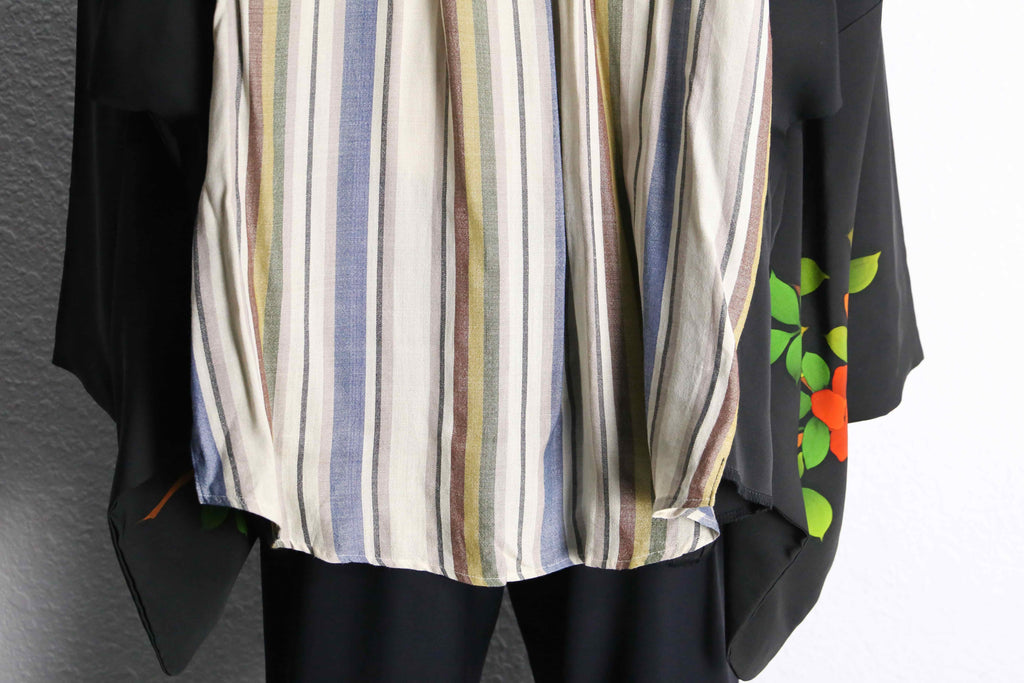 ストライプの効いた上質なシャツに袖には着物を大胆にもドッキング。かなり、ふわっと広がったドルマン仕様に。