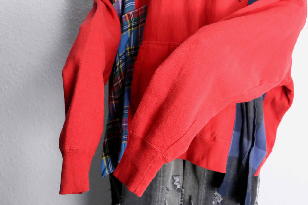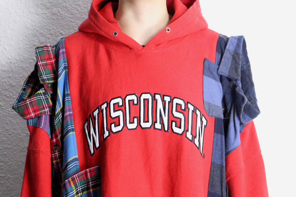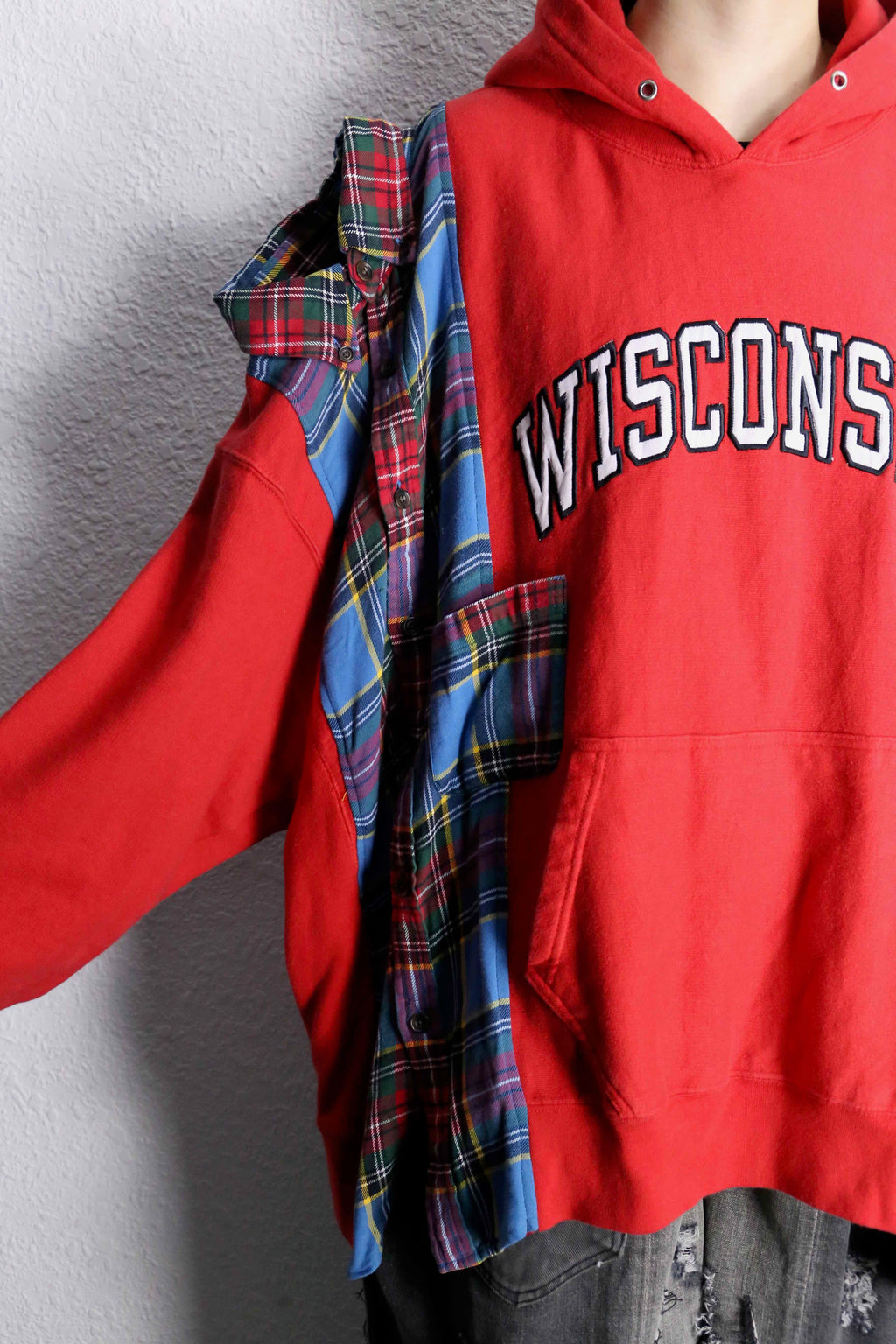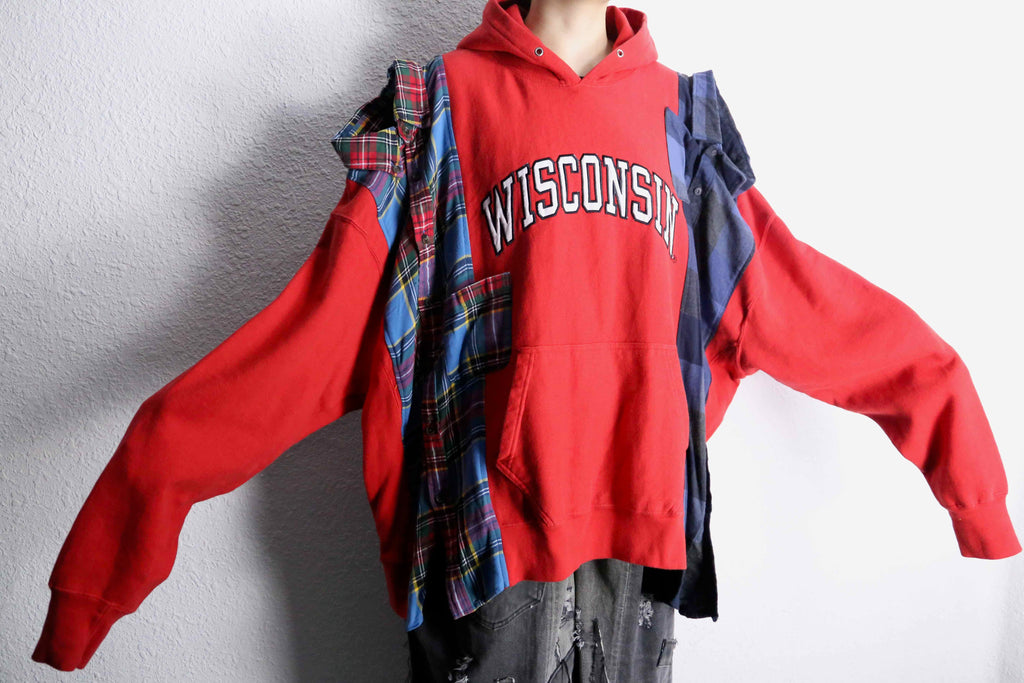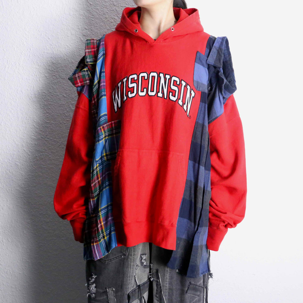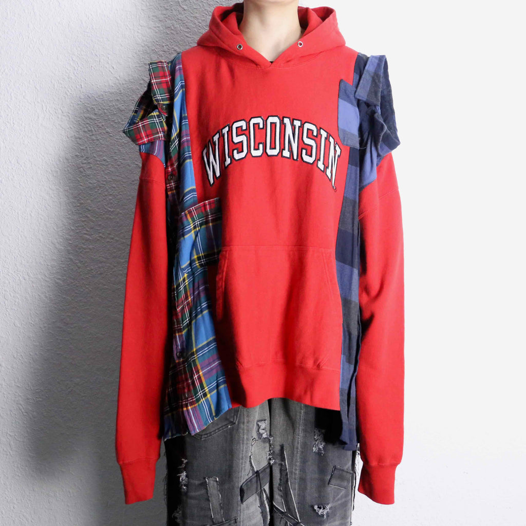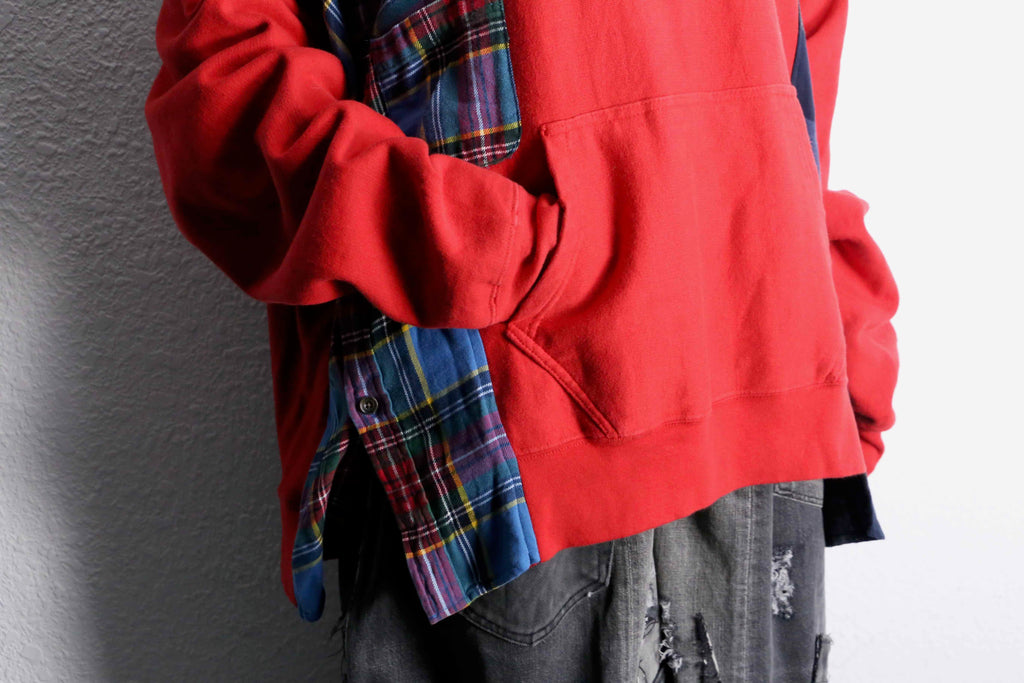 スウェットフーディーに異なるチェックシャツを大胆にドッキングしたデザインで、角度によって見え方が変わる唯一無二の一着が入荷。
