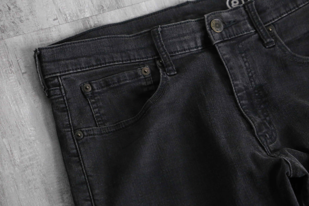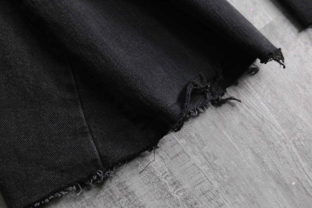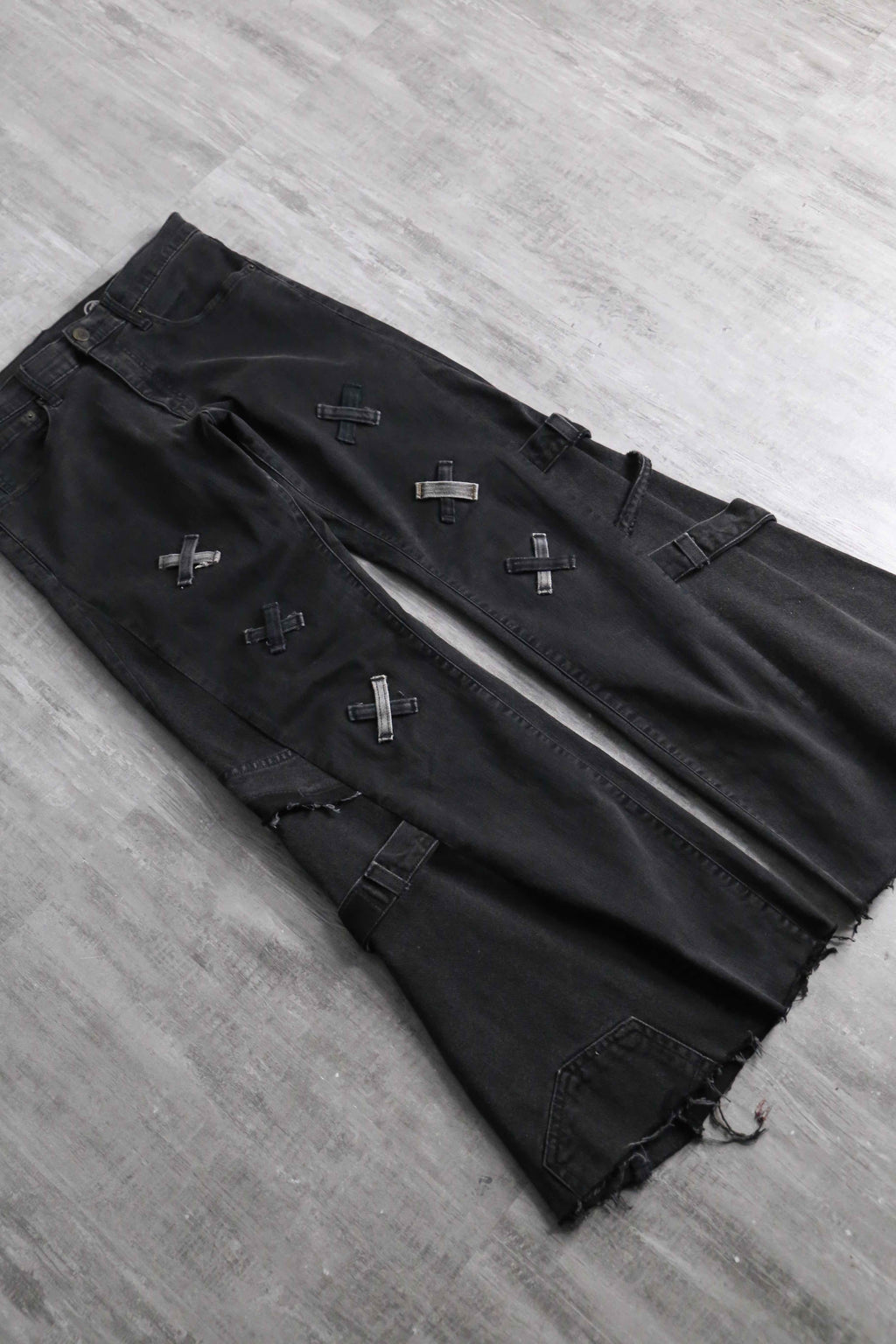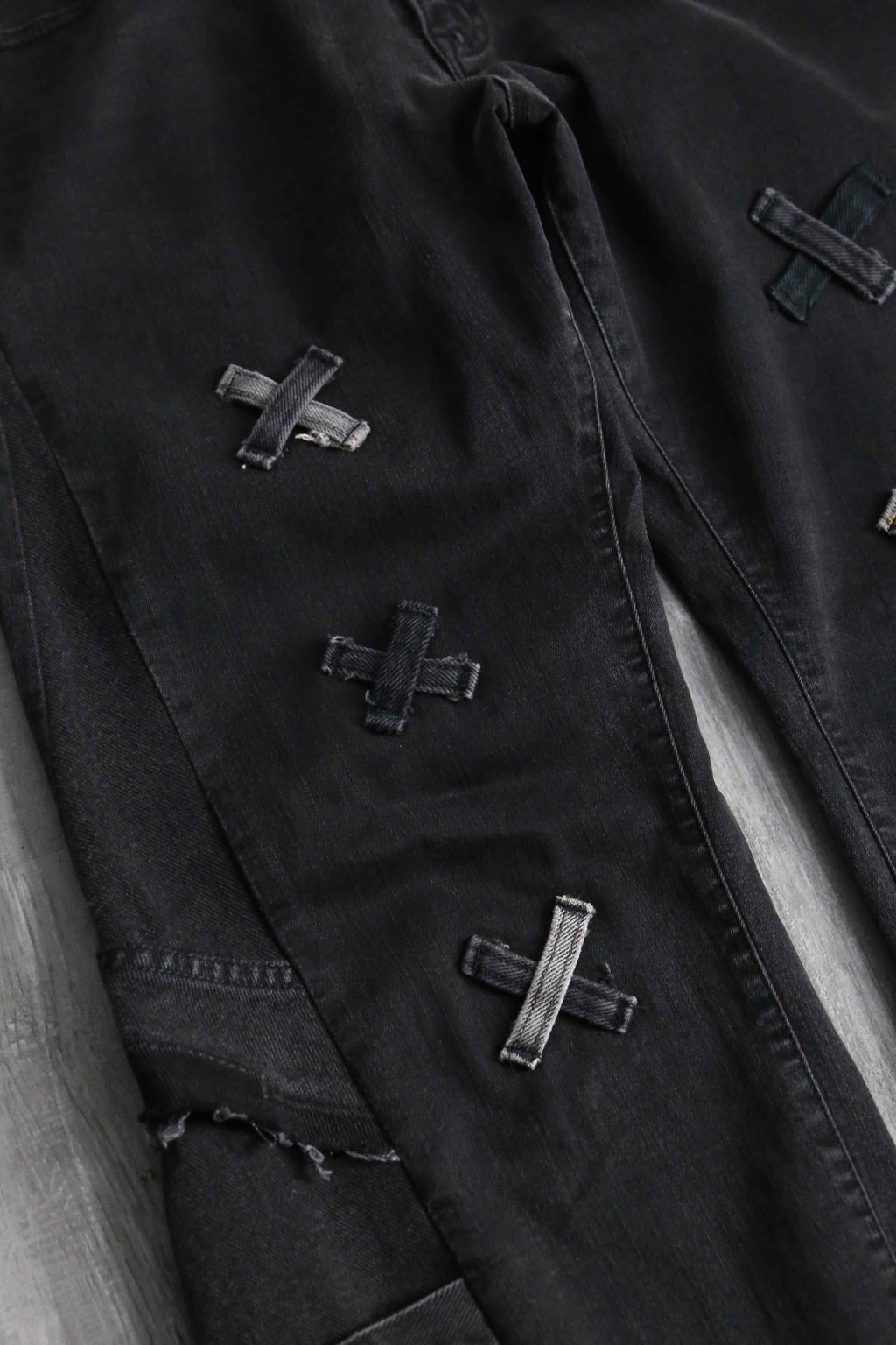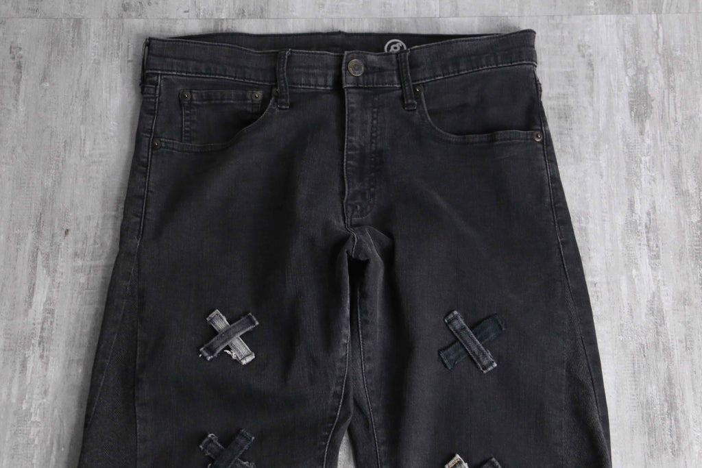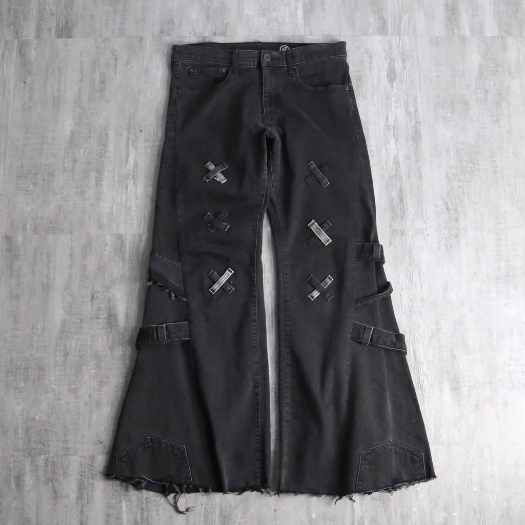 フロント部分のパッチワークを多めに設計した存在感抜群のデザインによる1本。ブラックボディのサイドから異なるデニムを差し込むことで、もも周りの広さをそのままに裾に向かって幅広となっていくボリューム満点で汎用性抜群カラーのバギーフレアのシルエットが顕現します。