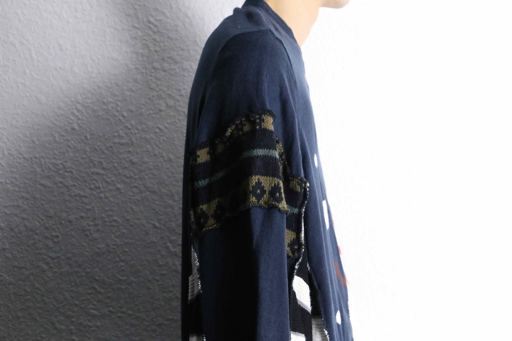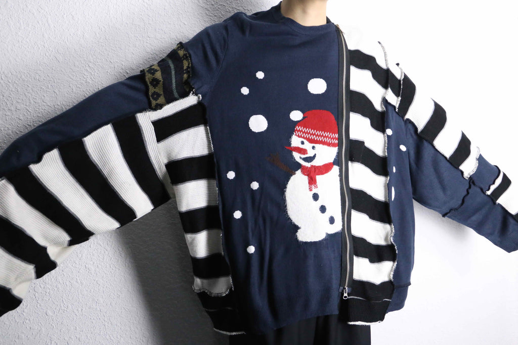 前面には大きなスノーマンのニット、右半身はストライプデザインのニット。2 着をドッキングし、ユニークなデザインが目を惹く個性的な一着。ゆったりめのオーバーサイズシルエットで肩を落としてラフに着るだけで今っぽい雰囲気に。袖や裾の切りっぱなし風の仕上げがほどよく抜け感をプラスします。
